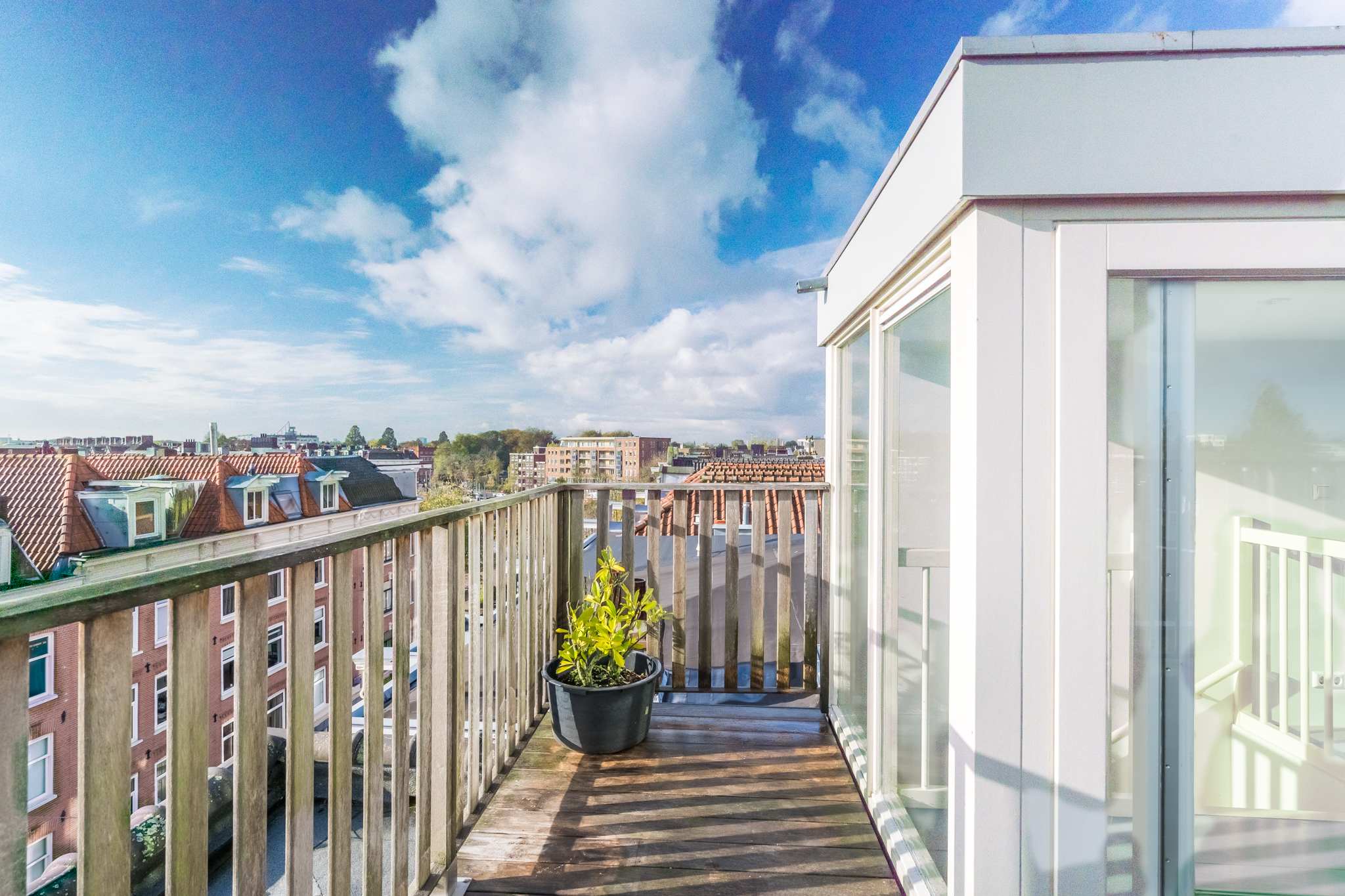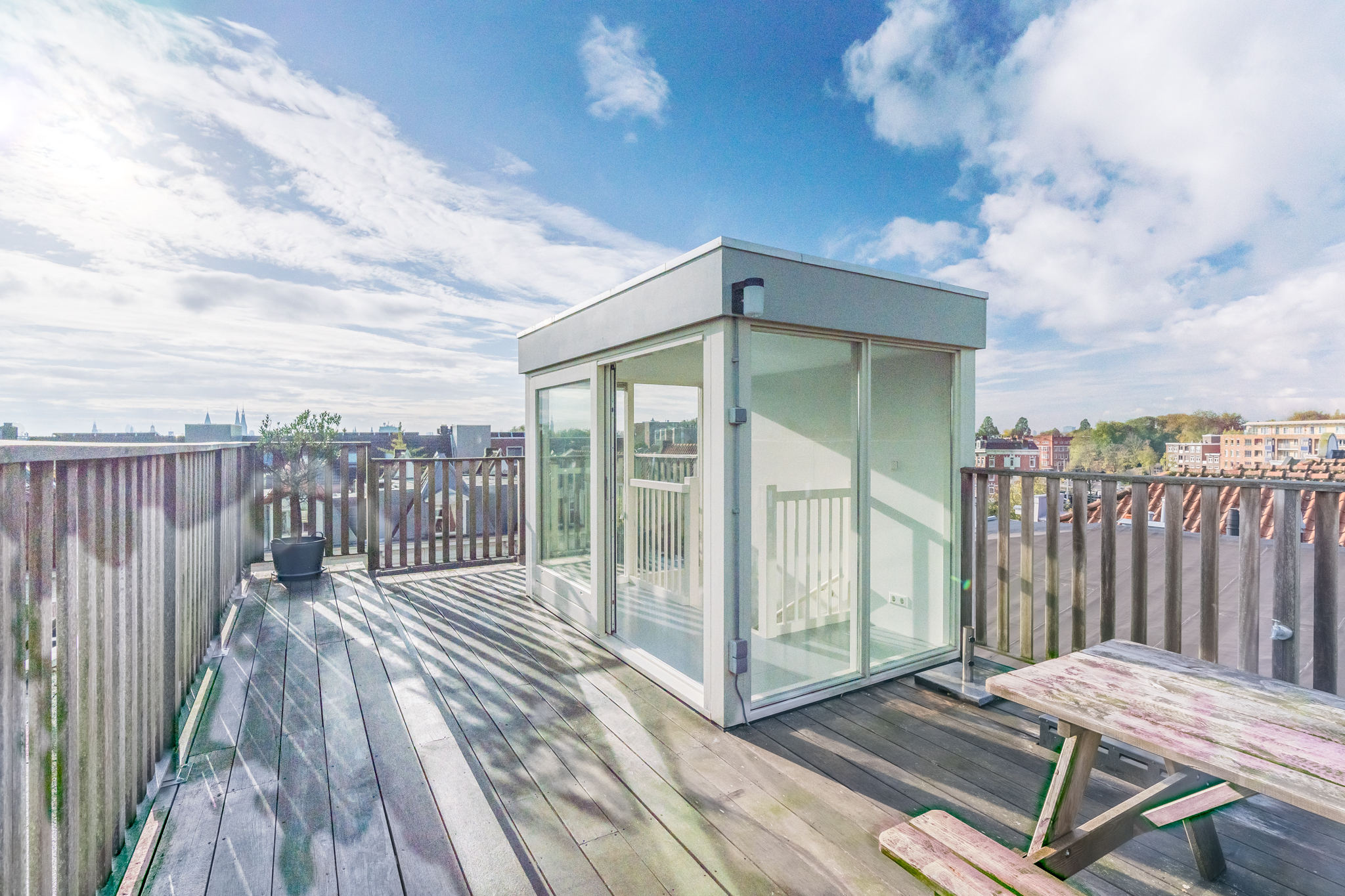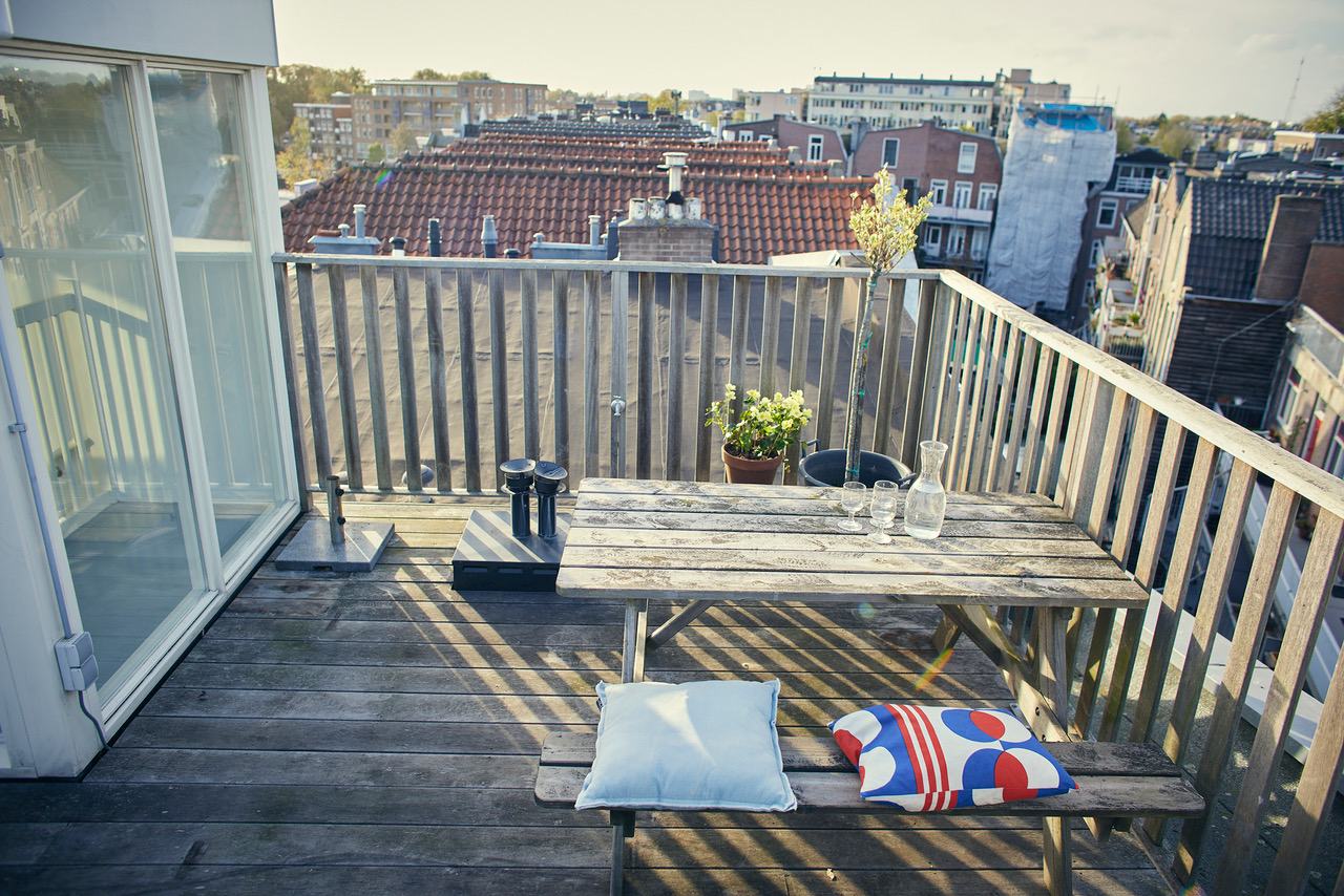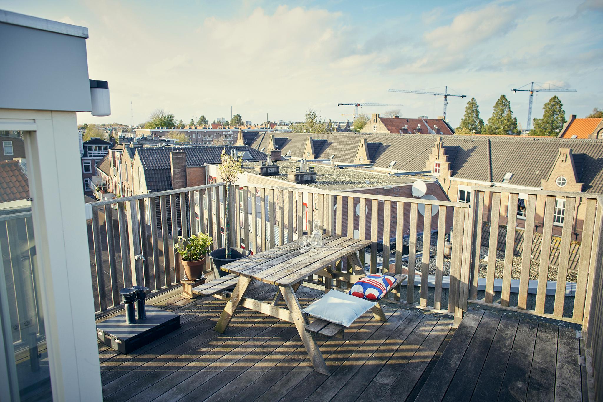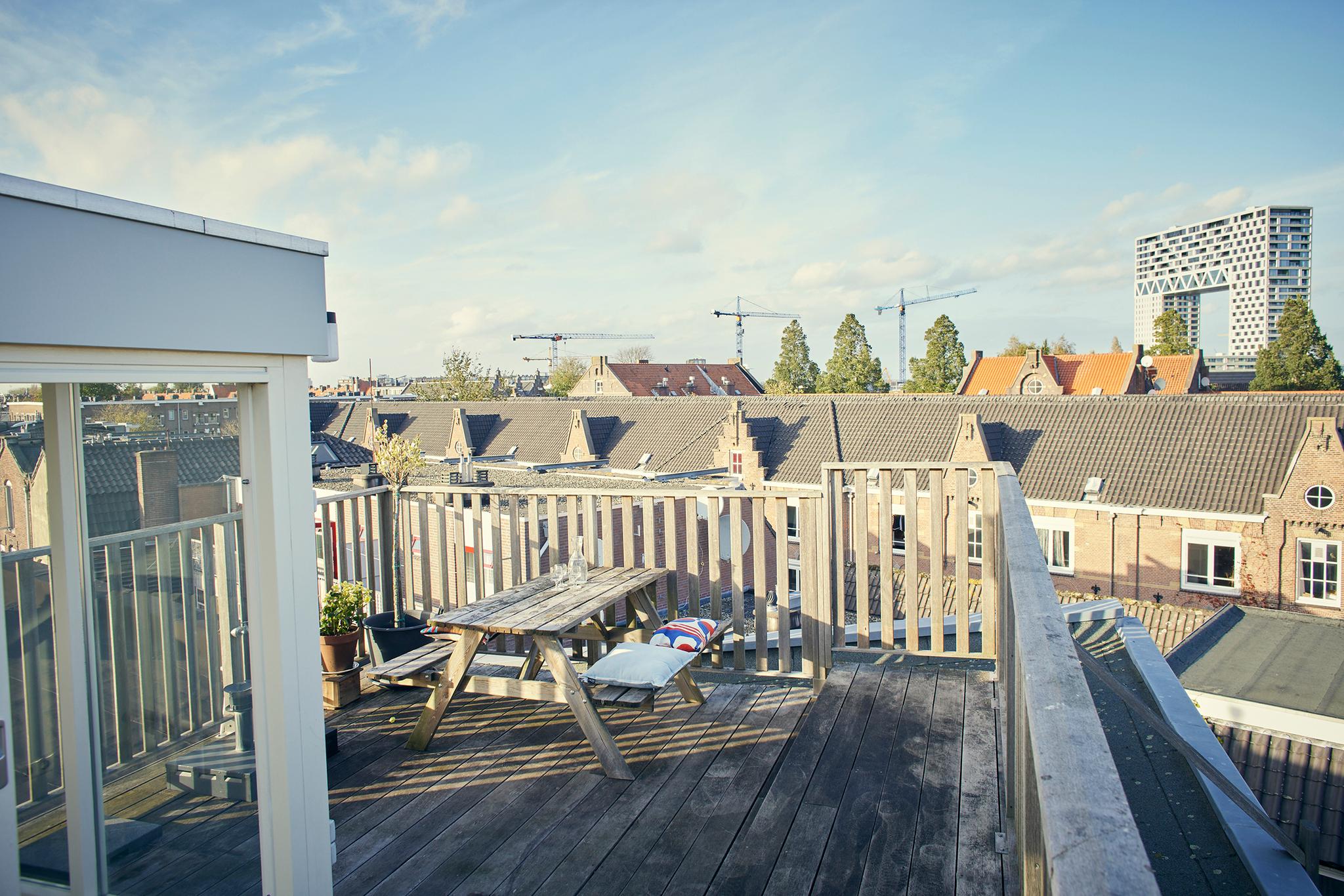 Tenslotte leidt de vaste trap je naar de opbouw (1,96 m stahoogte) op het dak met ruimte voor een ijskastje om bier en wijn in te koelen voor borrels op het ruime dakterras. Het terras is het enige terras op het blok, dus geen nieuwsgierige buren. Daarbij is er uiteraard altijd zon op het terras en doen groene vingers het er dankbaar goed.