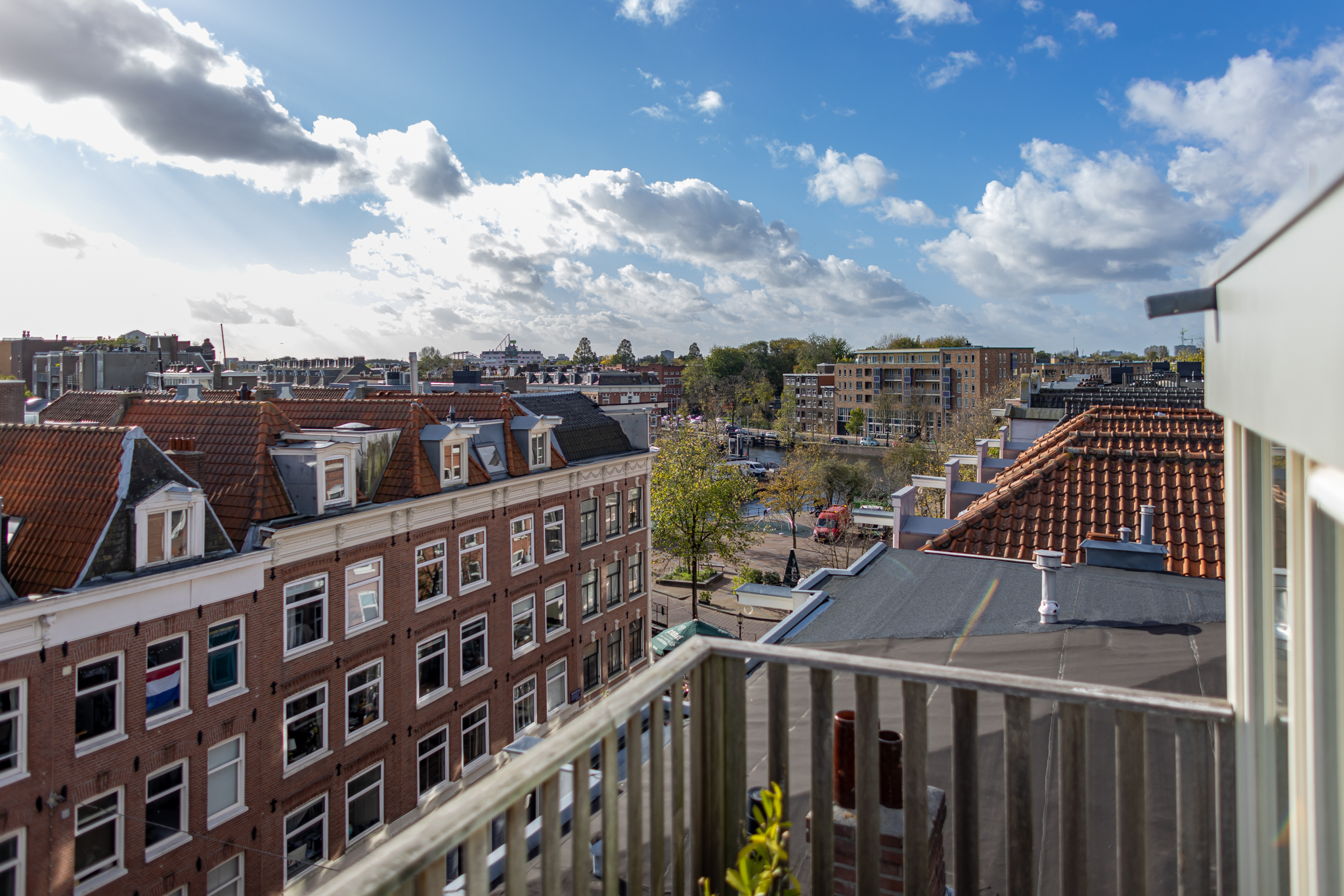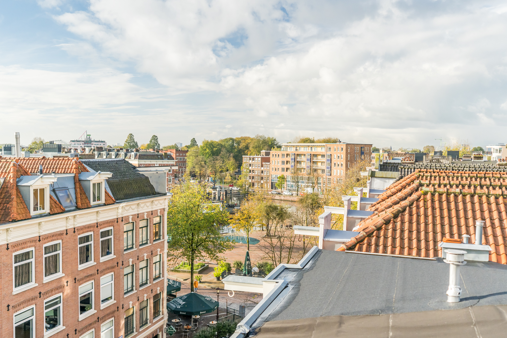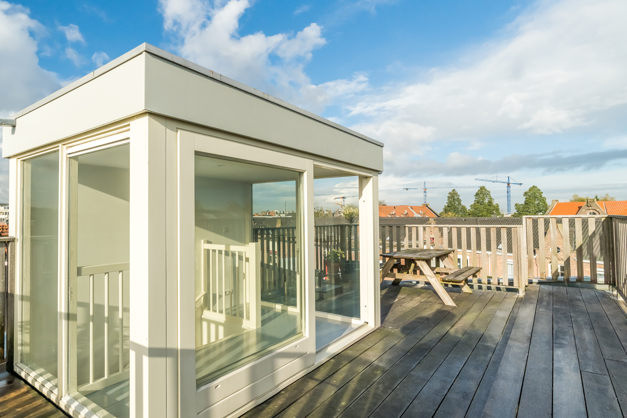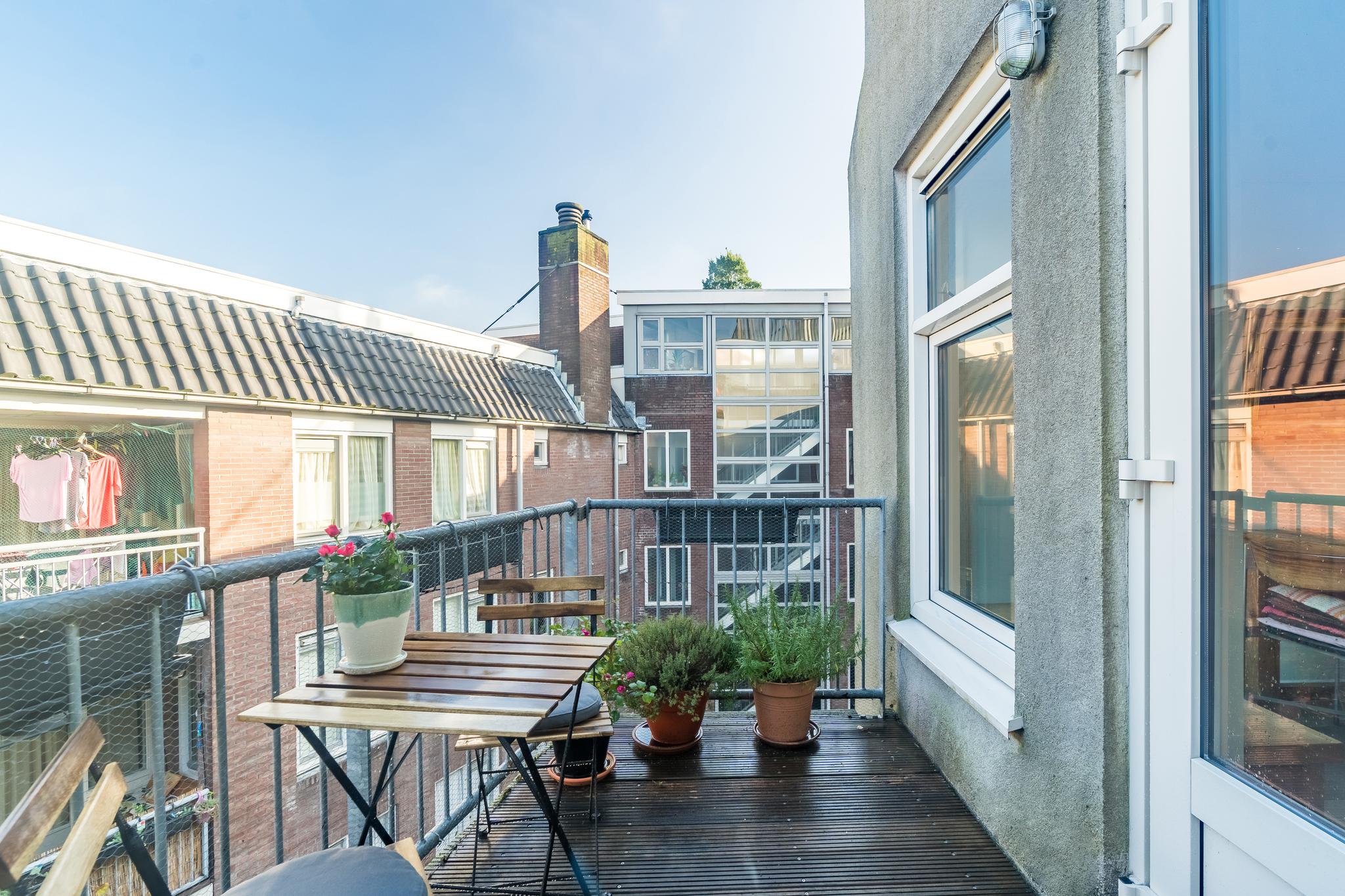 Tenslotte leidt de vaste trap je naar de opbouw (1,96 m stahoogte) op het dak met ruimte voor een ijskastje om bier en wijn in te koelen voor borrels op het ruime dakterras. Het terras is het enige terras op het blok, dus geen nieuwsgierige buren. Daarbij is er uiteraard altijd zon op het terras en doen groene vingers het er dankbaar goed.