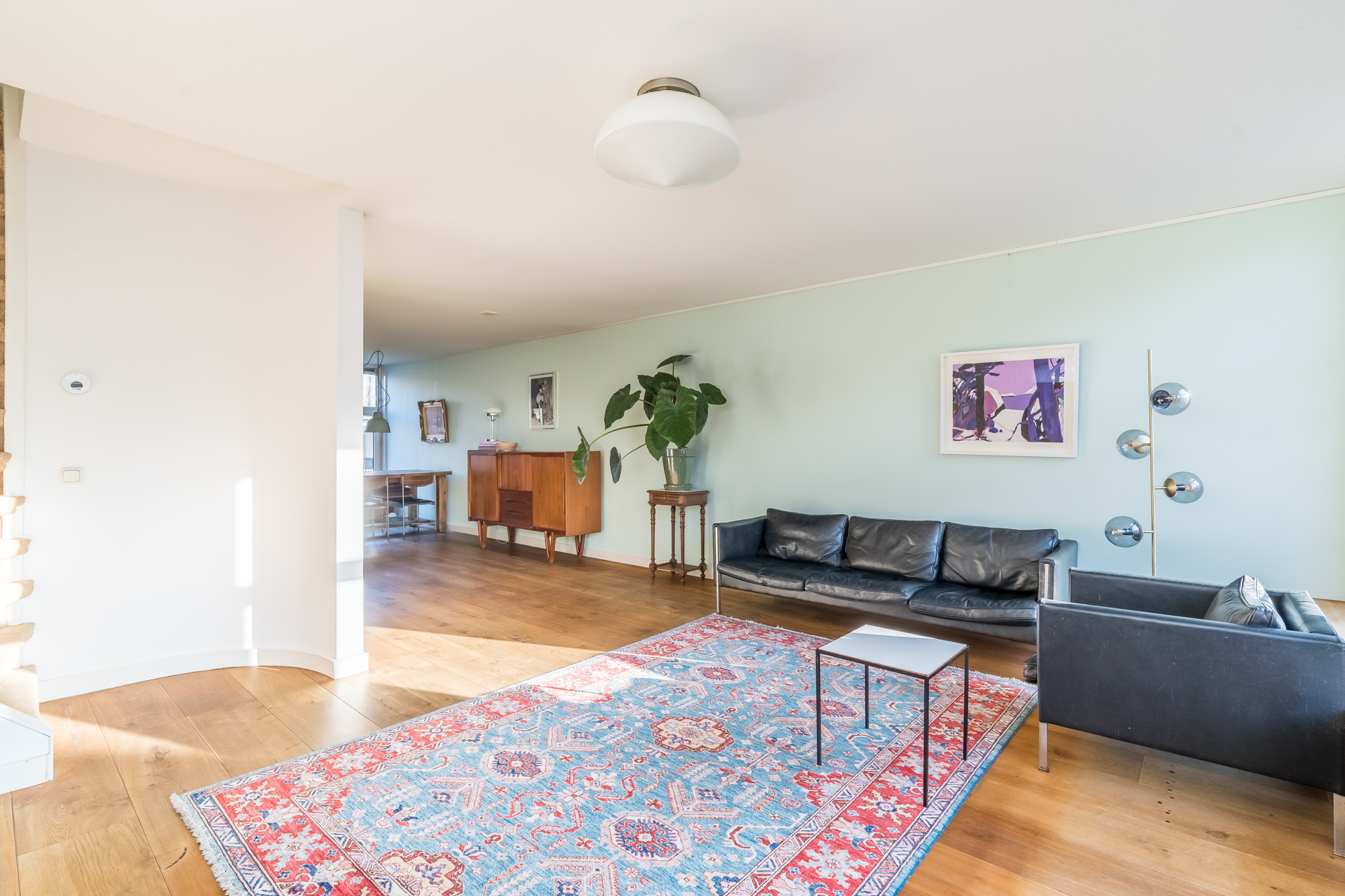 De eettafel past perfect tussen de keuken en het terras om gezellig te eten met vrienden, zowel in de zomer op het verdiepte balkon als in de winter aan tafel. De creatief geplaatste ronde muur schermt de wc en het trappenhuis discreet af van de woonkamer.