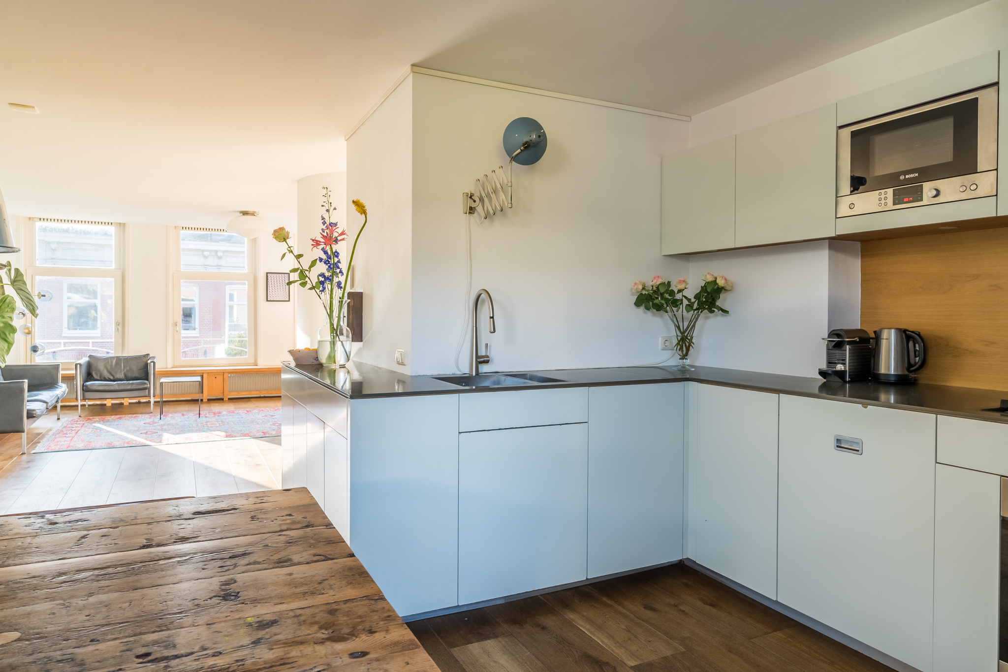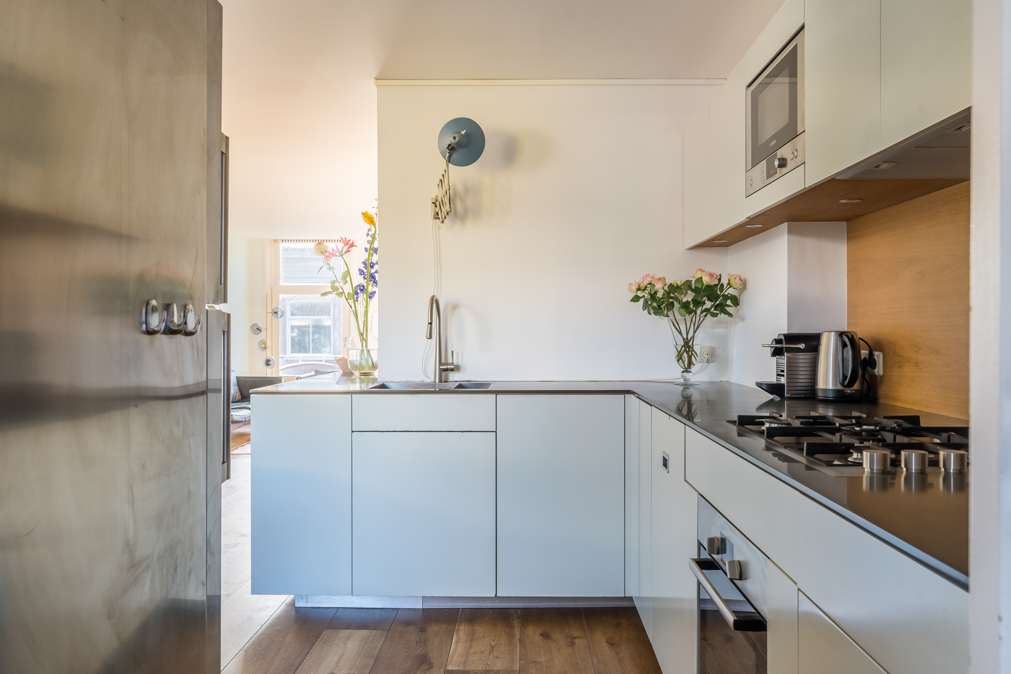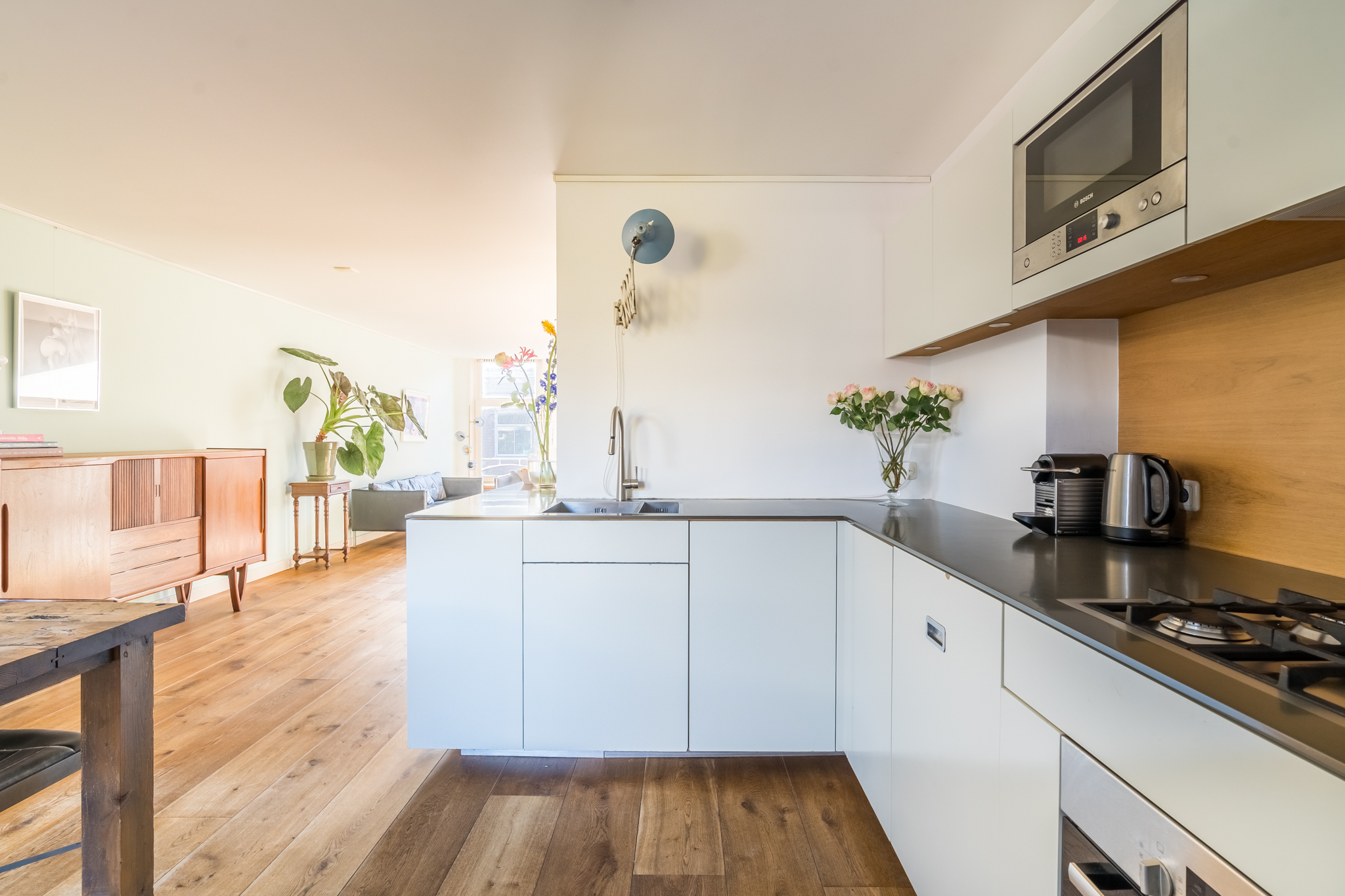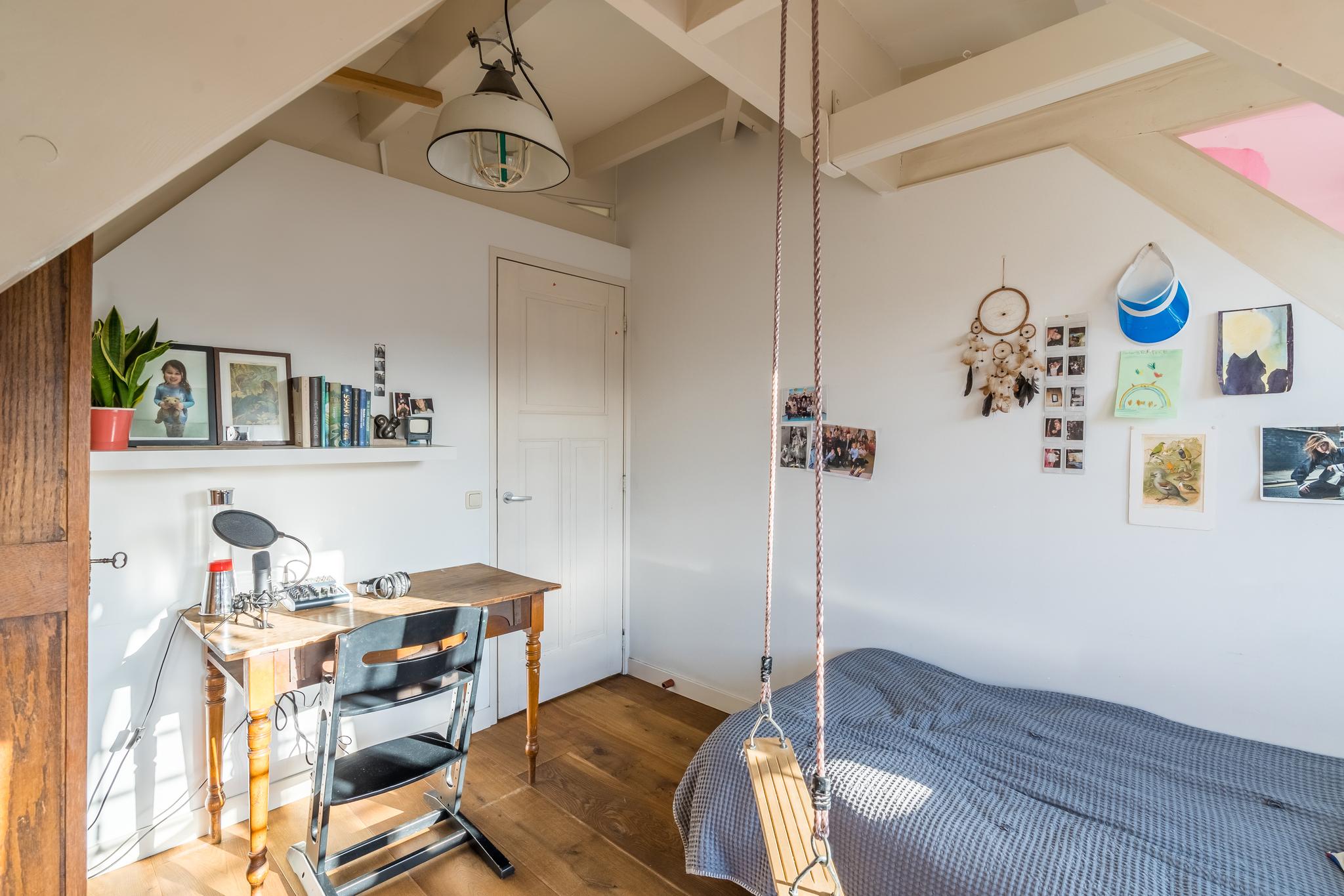 De entree op de tweede verdieping leidt je via de trap naar de derde verdieping. In de woonkamer ervaar je optimaal licht, door de ramen in zowel de voor- als in de achtergevel. De mooie, stoere eikenplankenvloer is over de gehele verdieping doorgelegd wat een zeer ruimtelijke effect geeft. De zitkamer bevindt zich aan de voorzijde en kijkt uit op de karakteristieke gevels aan de overzijde van de straat en op de rode pannendaken richting het iconische gebouw “De Pontsteiger”. Het keukenblok is speels geplaatst in een hoekige S-vorm – het werkblad is dus groot en de keuken speelt hierdoor in dit huis een centrale rol. Hier kan gegeten en gedronken worden! Vanzelfsprekend is er een keur aan inbouwapparatuur van A-kwaliteit aangebracht, waaronder een ijskast op ooghoogte, een vrieskast met twee verdiepingen, een combi-oven, een recirculatiekap en natuurlijk een afwasmachine. De voorraadkast in de ruime uitbouw dient tevens als natte bijkeuken, met ruimte voor de was/droogcombinatie en de CV-ketel.