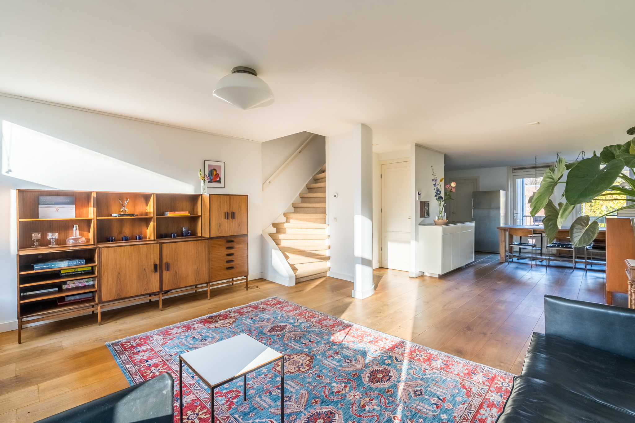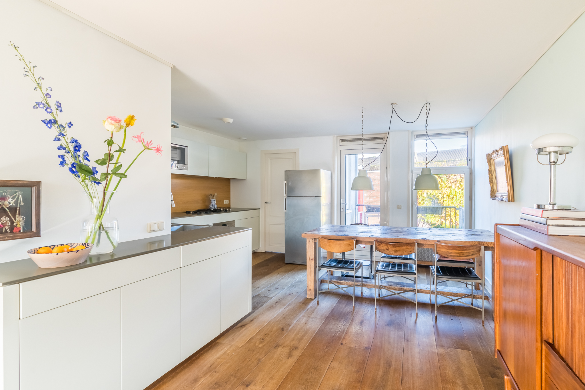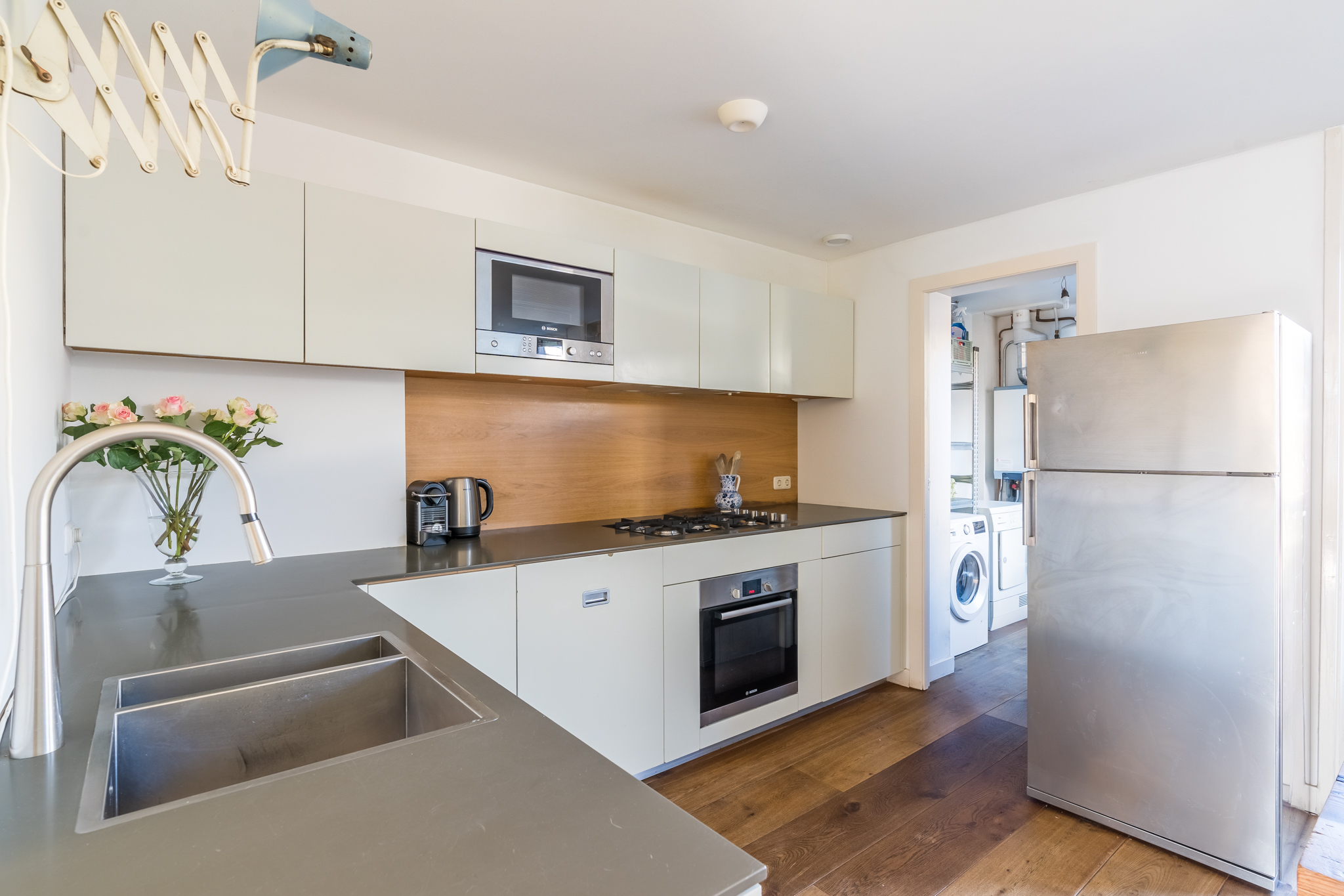 De entree op de tweede verdieping leidt je via de trap naar de derde verdieping. In de woonkamer ervaar je optimaal licht, door de ramen in zowel de voor- als in de achtergevel. De mooie, stoere eikenplankenvloer is over de gehele verdieping doorgelegd wat een zeer ruimtelijke effect geeft. De zitkamer bevindt zich aan de voorzijde en kijkt uit op de karakteristieke gevels aan de overzijde van de straat en op de rode pannendaken richting het iconische gebouw “De Pontsteiger”. Het keukenblok is speels geplaatst in een hoekige S-vorm – het werkblad is dus groot en de keuken speelt hierdoor in dit huis een centrale rol. Hier kan gegeten en gedronken worden! Vanzelfsprekend is er een keur aan inbouwapparatuur van A-kwaliteit aangebracht, waaronder een ijskast op ooghoogte, een vrieskast met twee verdiepingen, een combi-oven, een recirculatiekap en natuurlijk een afwasmachine. De voorraadkast in de ruime uitbouw dient tevens als natte bijkeuken, met ruimte voor de was/droogcombinatie en de CV-ketel.