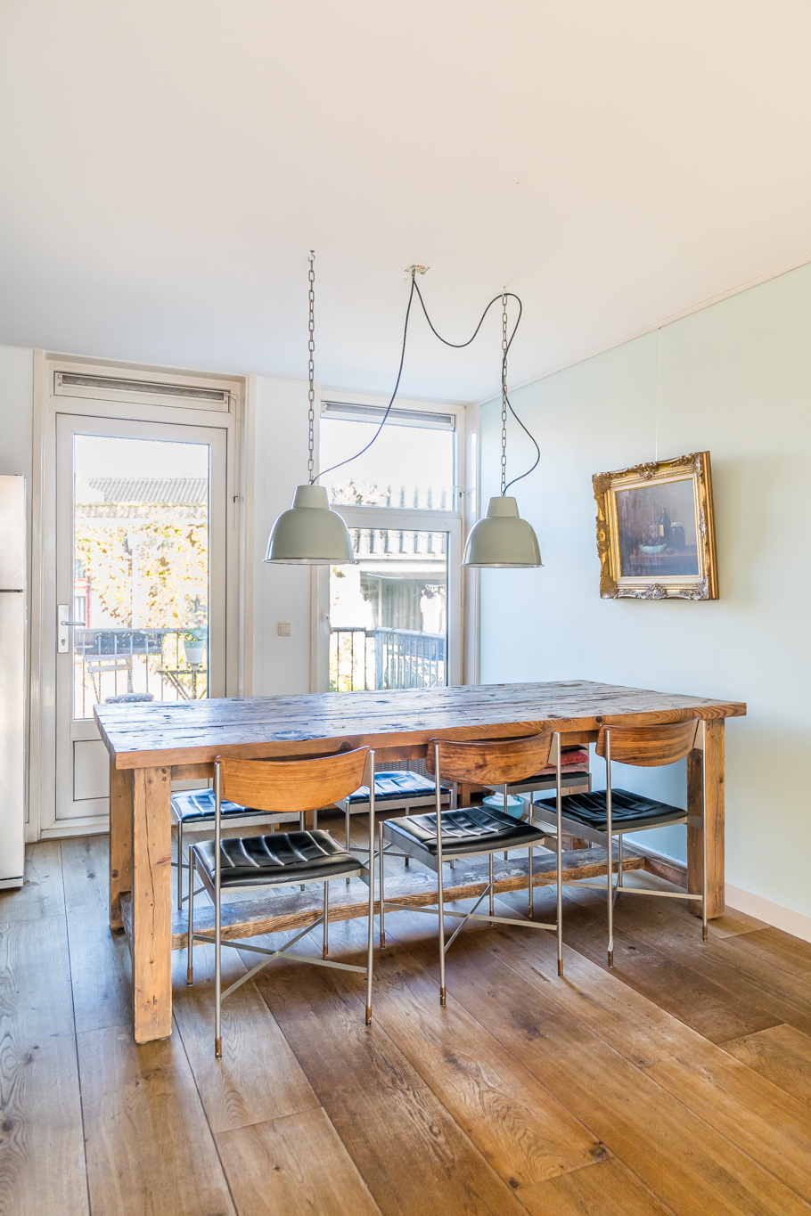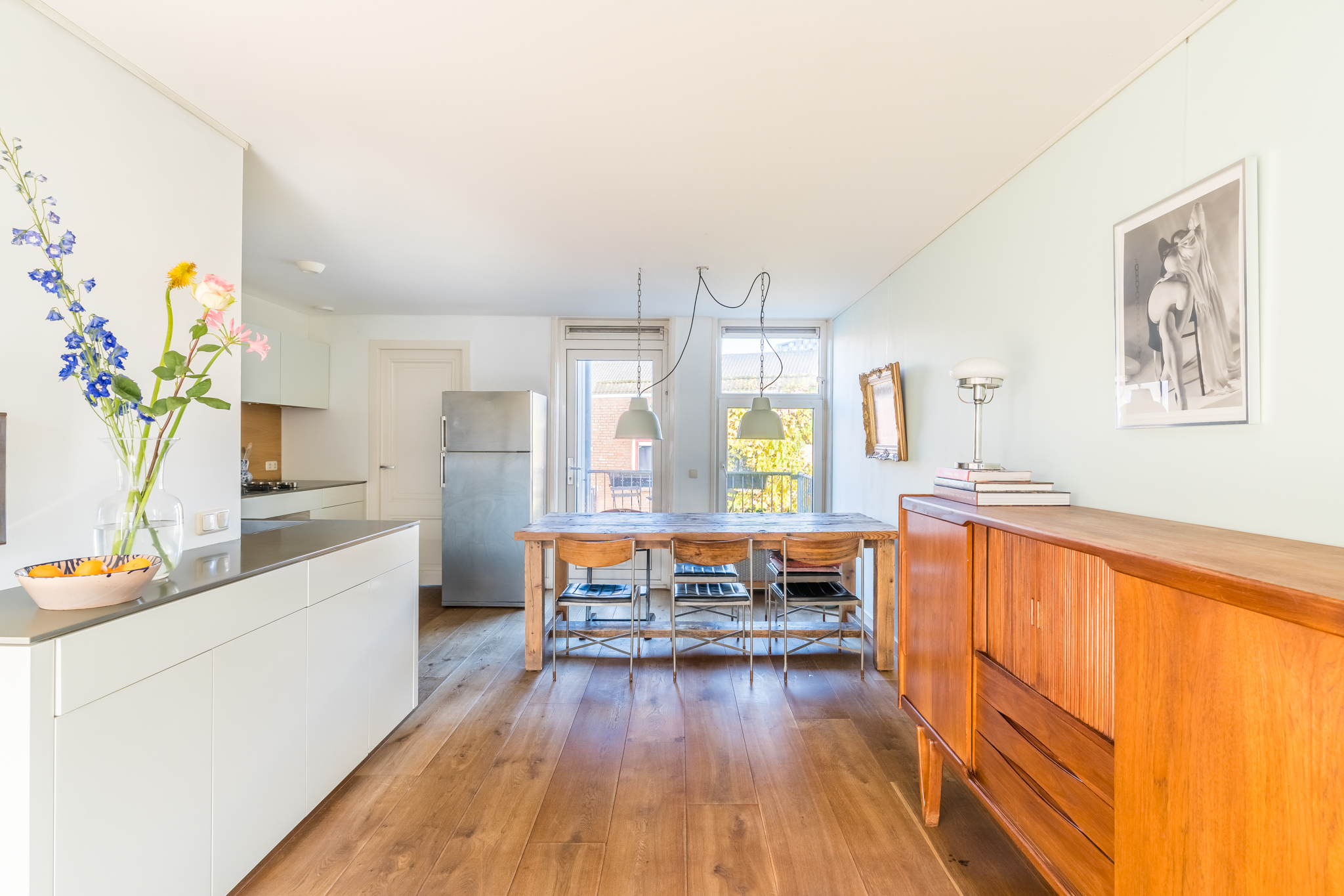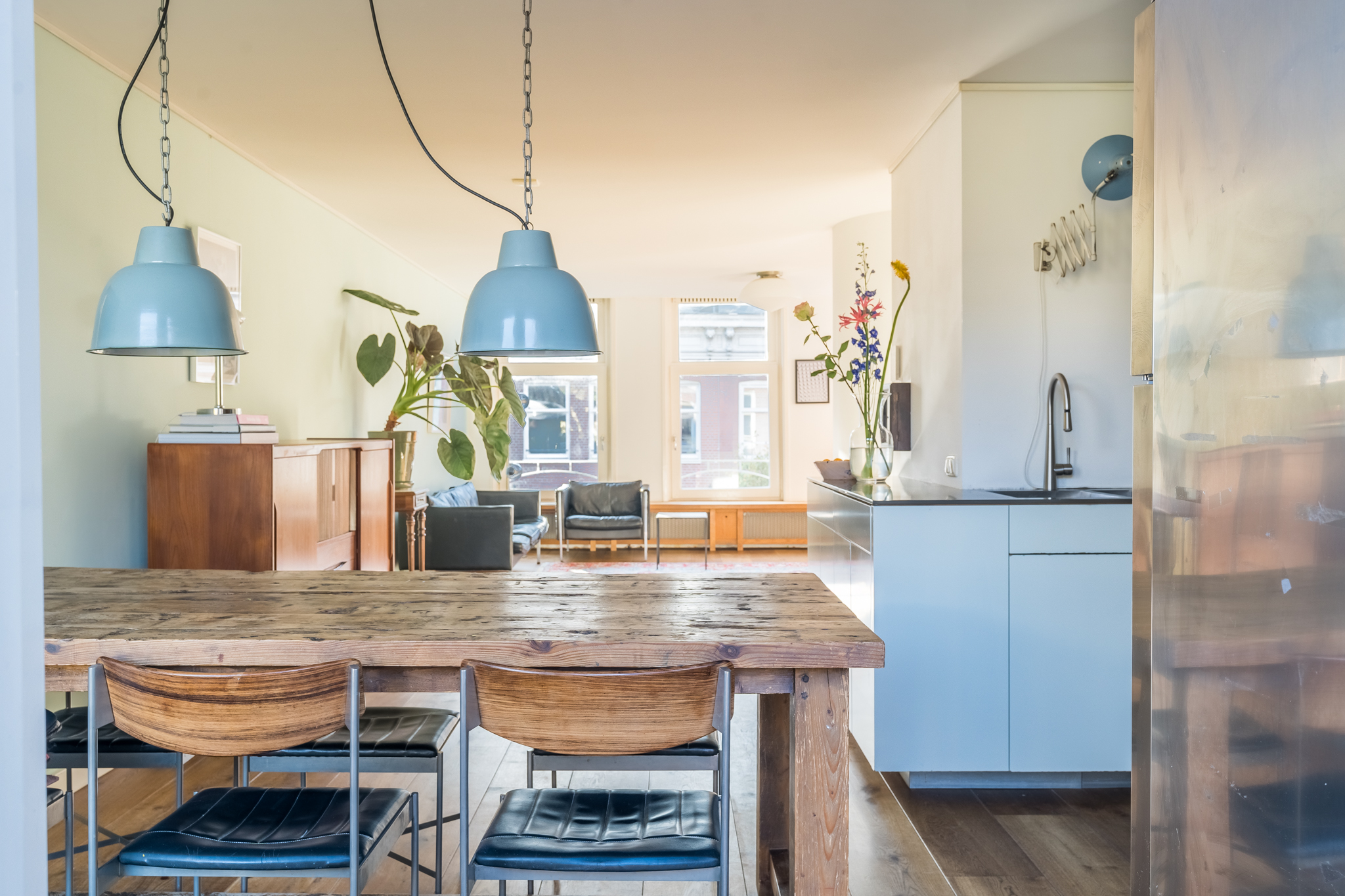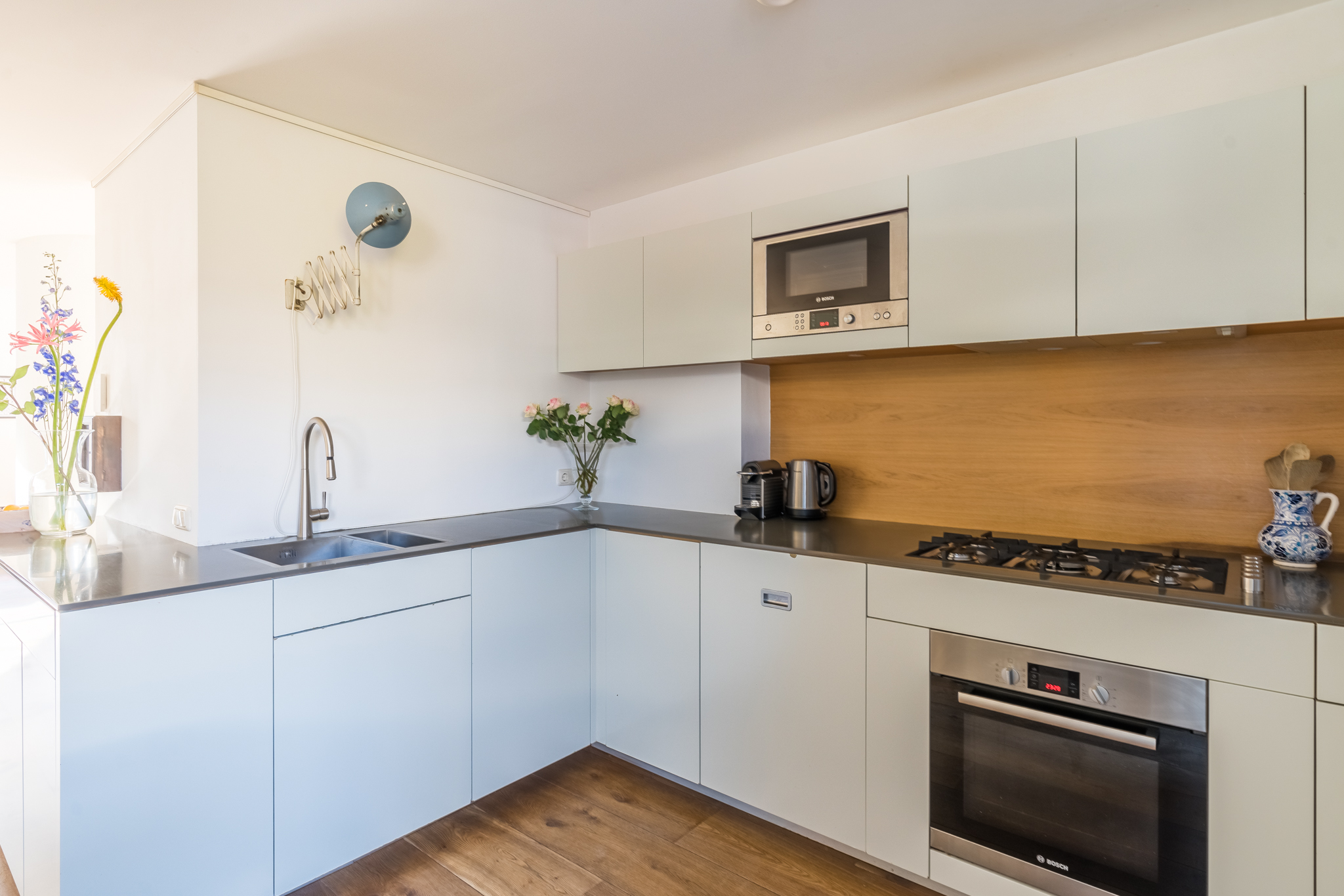 De entree op de tweede verdieping leidt je via de trap naar de derde verdieping. In de woonkamer ervaar je optimaal licht, door de ramen in zowel de voor- als in de achtergevel. De mooie, stoere eikenplankenvloer is over de gehele verdieping doorgelegd wat een zeer ruimtelijke effect geeft. De zitkamer bevindt zich aan de voorzijde en kijkt uit op de karakteristieke gevels aan de overzijde van de straat en op de rode pannendaken richting het iconische gebouw “De Pontsteiger”. Het keukenblok is speels geplaatst in een hoekige S-vorm – het werkblad is dus groot en de keuken speelt hierdoor in dit huis een centrale rol. Hier kan gegeten en gedronken worden! Vanzelfsprekend is er een keur aan inbouwapparatuur van A-kwaliteit aangebracht, waaronder een ijskast op ooghoogte, een vrieskast met twee verdiepingen, een combi-oven, een recirculatiekap en natuurlijk een afwasmachine. De voorraadkast in de ruime uitbouw dient tevens als natte bijkeuken, met ruimte voor de was/droogcombinatie en de CV-ketel.