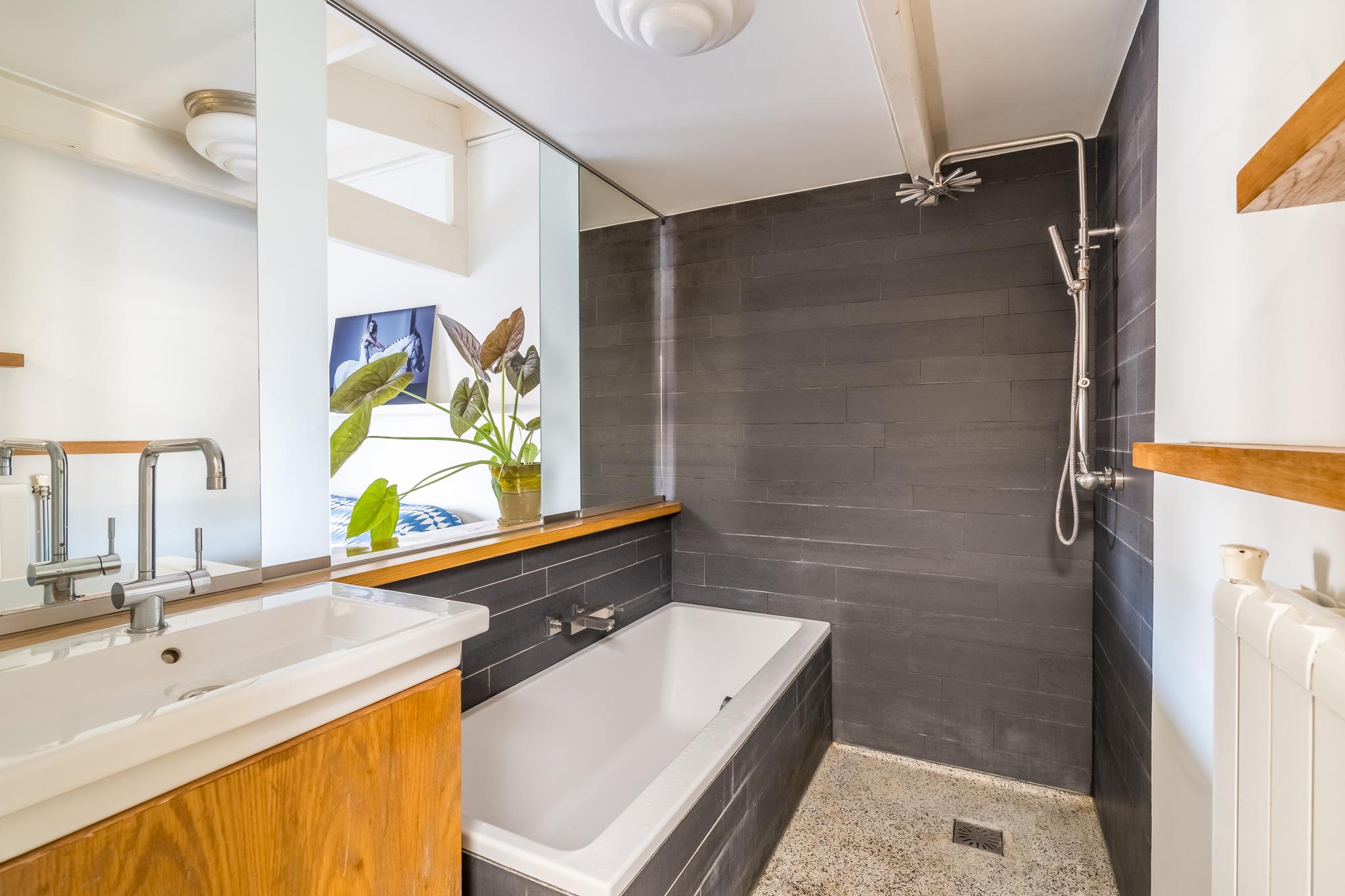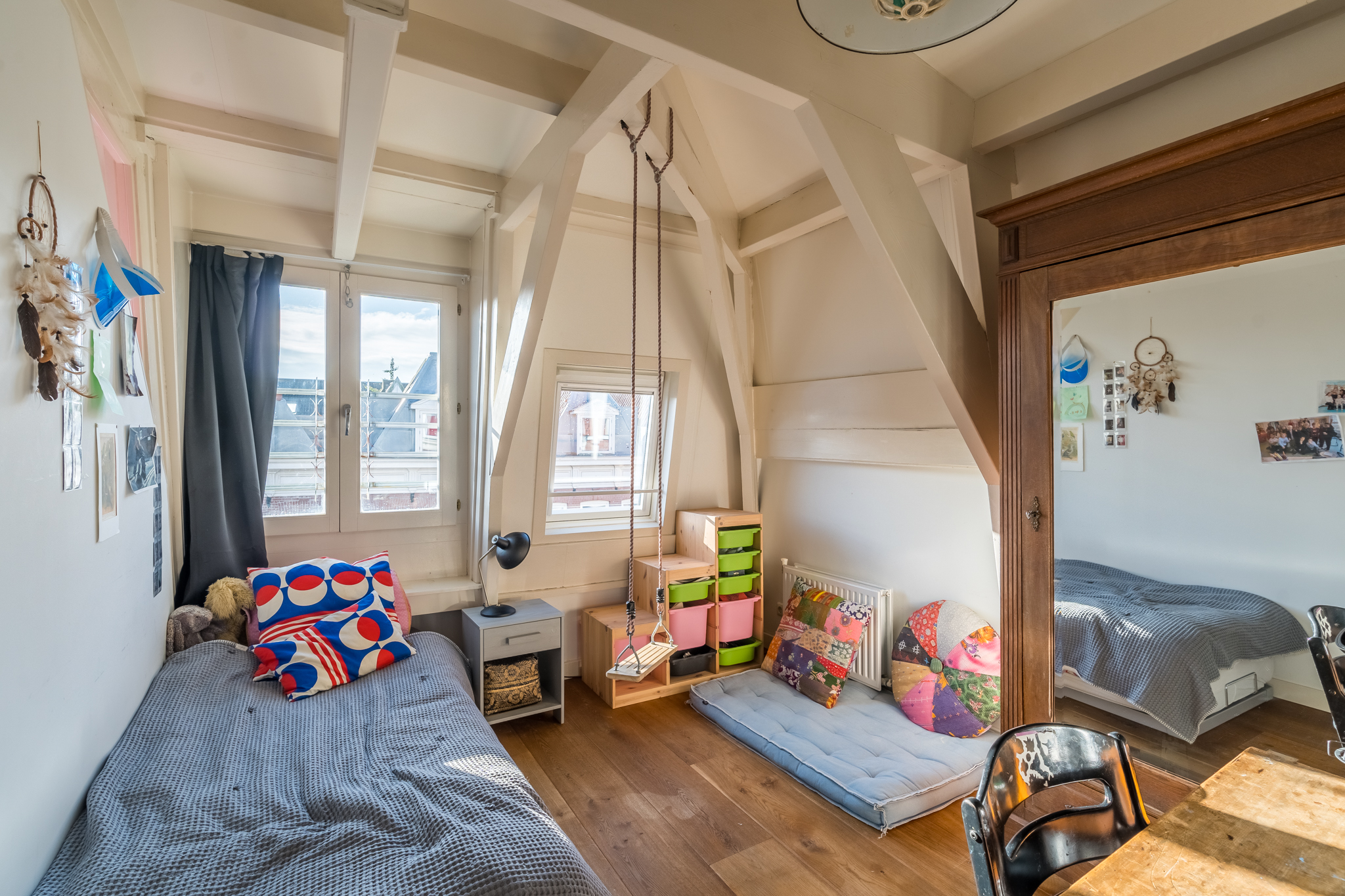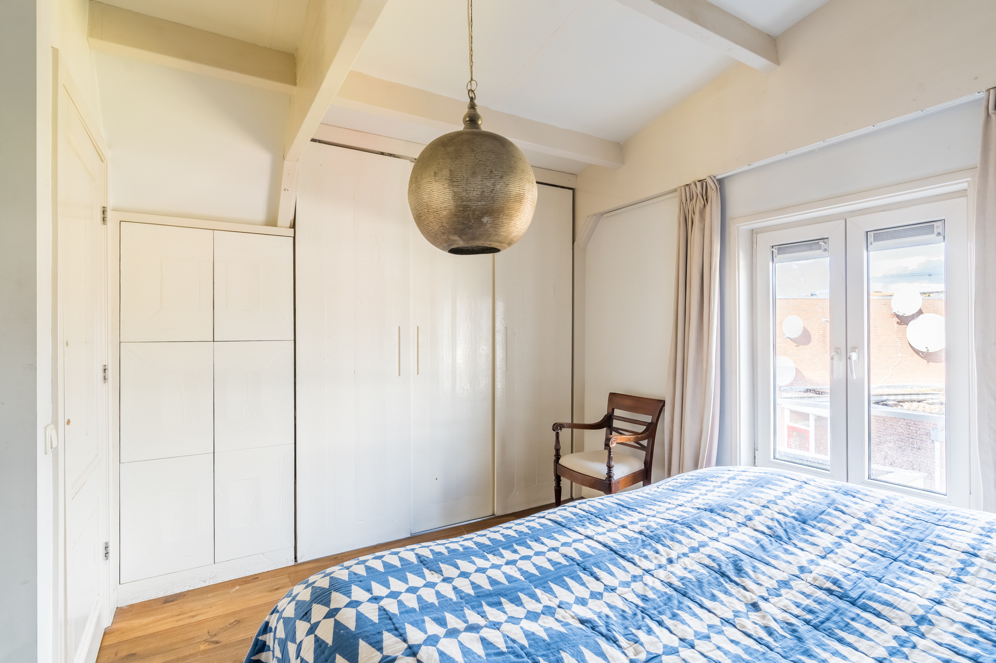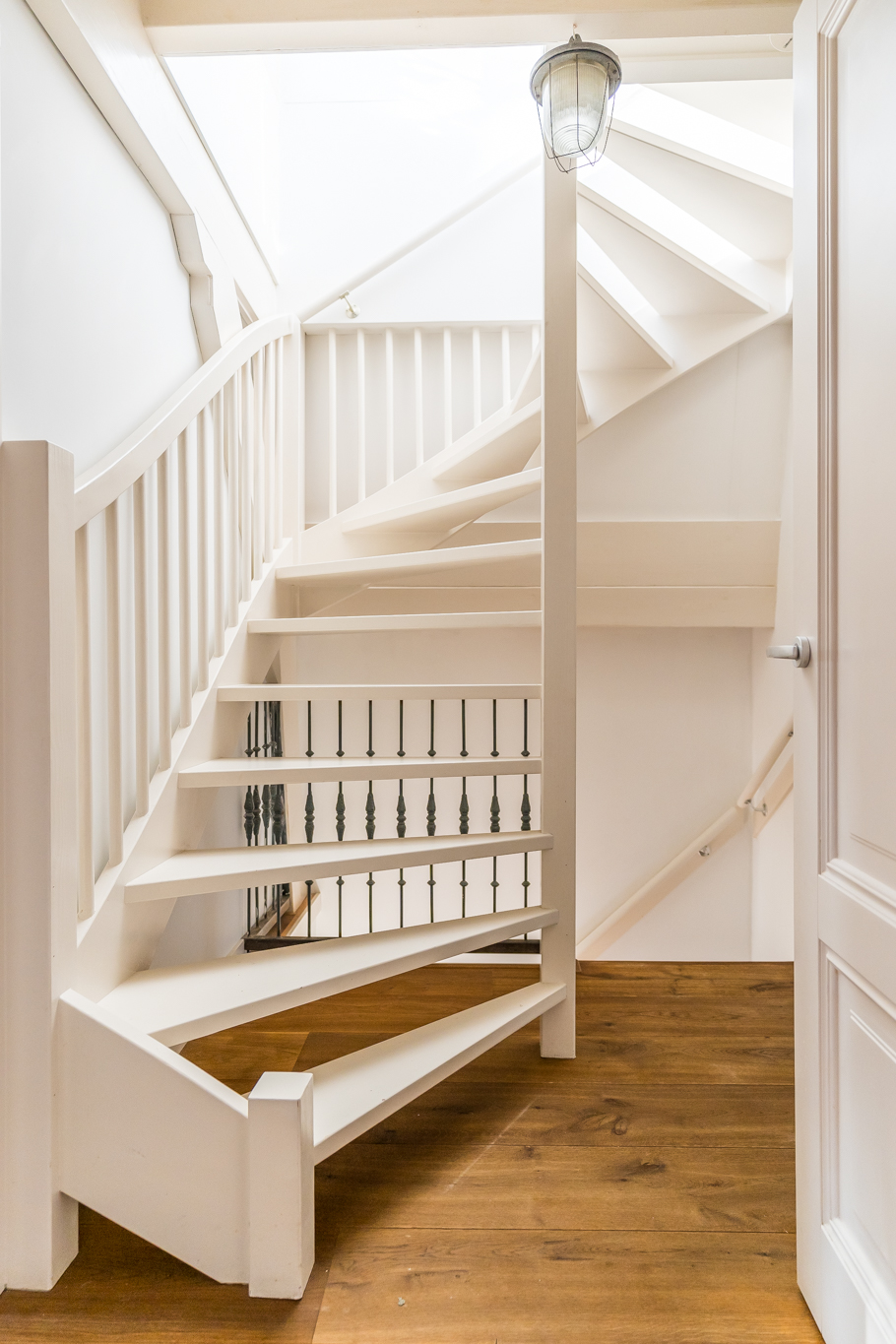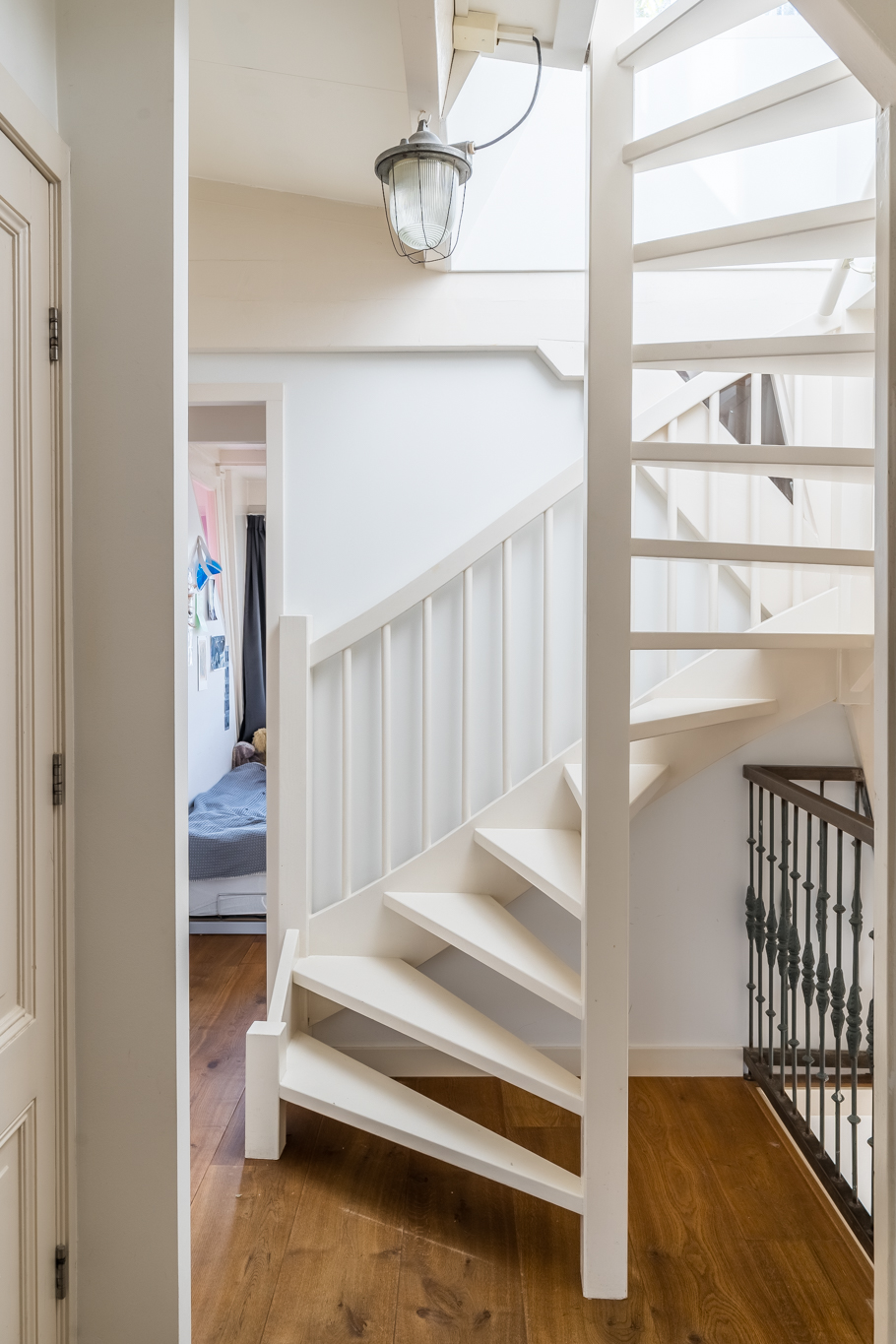 Op de vierde etage bevindt zich de slaapverdieping. Je vindt er drie flinke kamers, allen met hoge plafonds en de houten draagbalken speels en karakteristiek in het zicht. De master bedroom heeft een kledingkastenwand van vloer tot aan het plafond. De tweede wc met fontein is ook hier separaat gehouden van de badkamer. De badkamer heeft een schuifraam om wijn aangereikt te krijgen als je in bad ligt, of om de dag door te nemen met je partner terwijl je onder de douche staat.