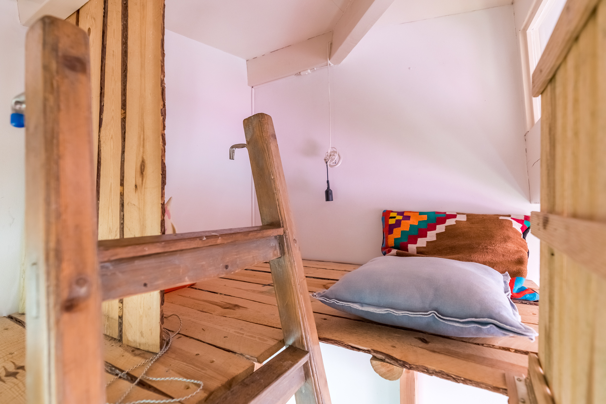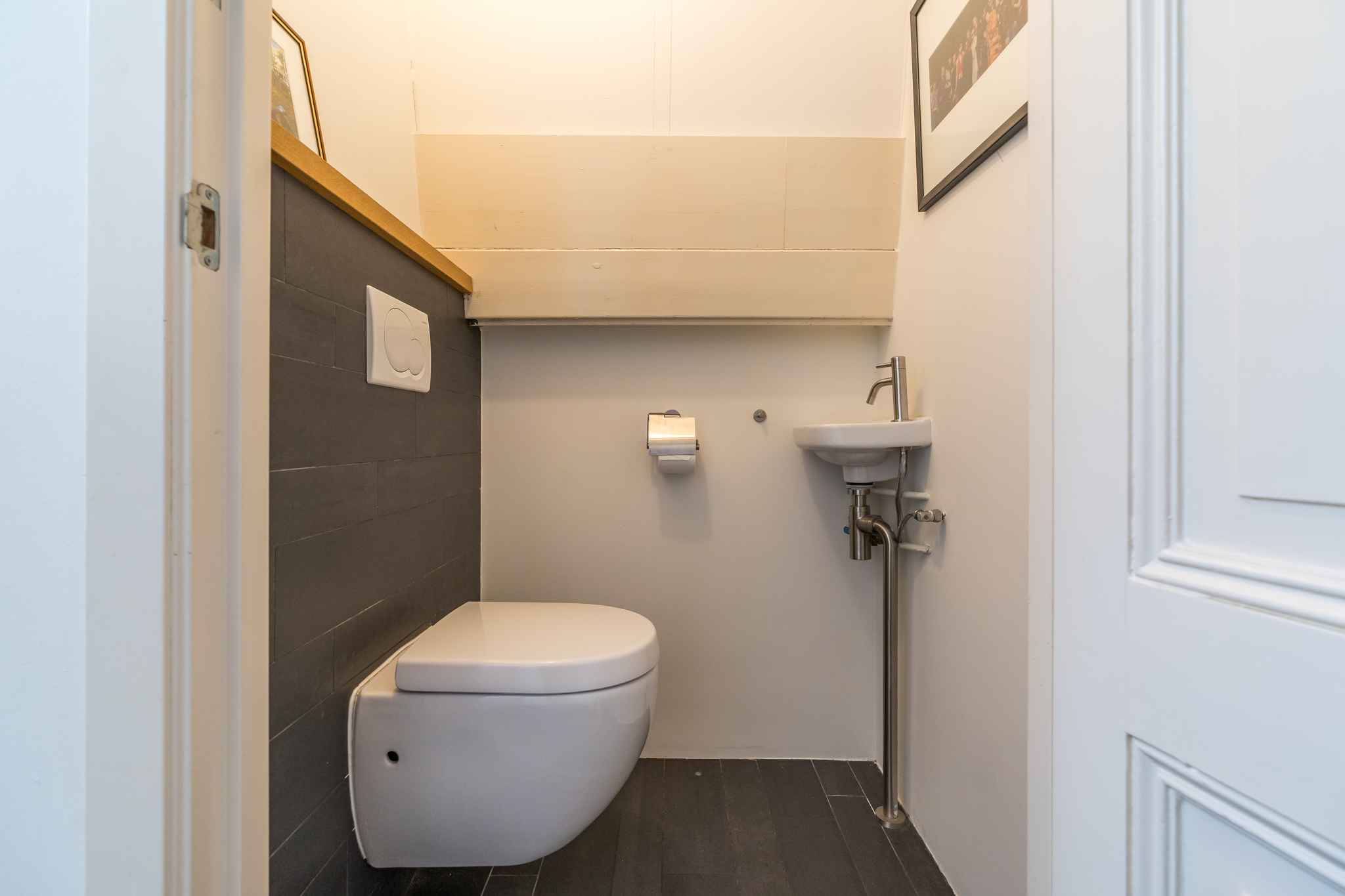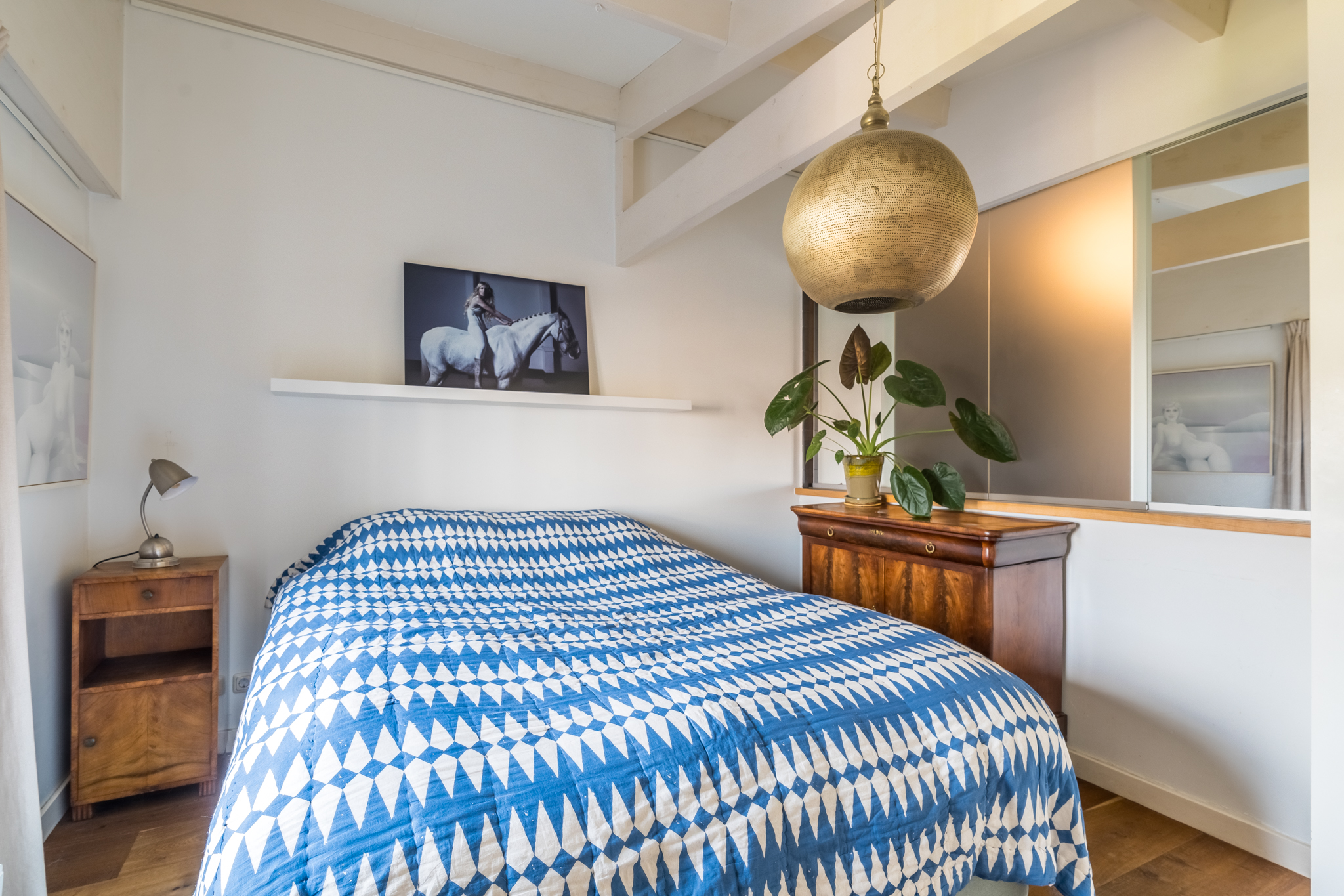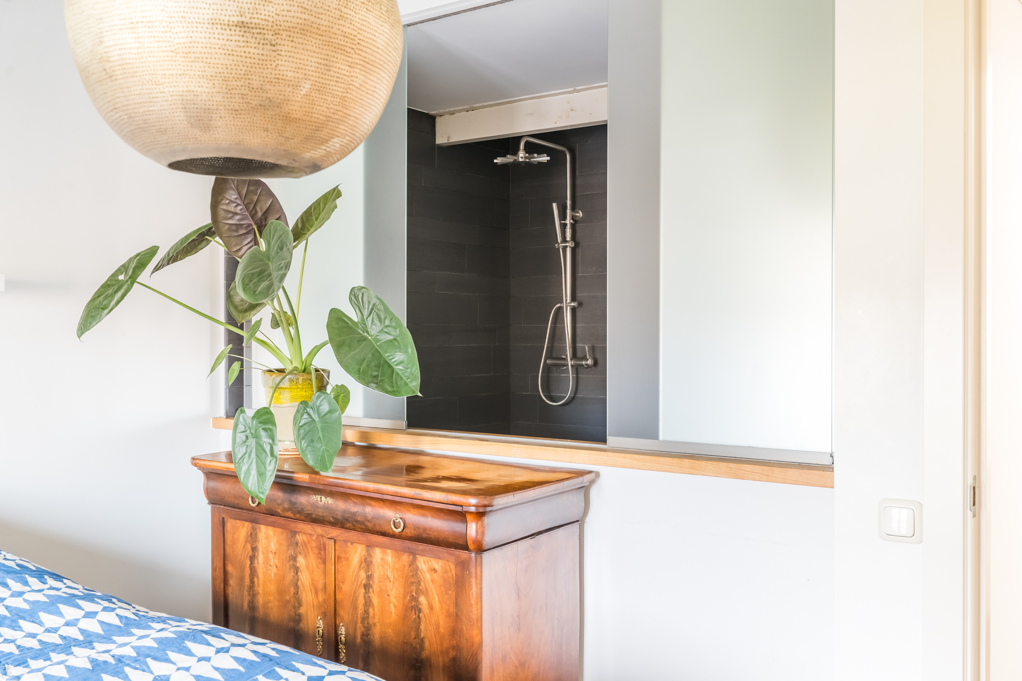 Op de vierde etage bevindt zich de slaapverdieping. Je vindt er drie flinke kamers, allen met hoge plafonds en de houten draagbalken speels en karakteristiek in het zicht. De master bedroom heeft een kledingkastenwand van vloer tot aan het plafond. De tweede wc met fontein is ook hier separaat gehouden van de badkamer. De badkamer heeft een schuifraam om wijn aangereikt te krijgen als je in bad ligt, of om de dag door te nemen met je partner terwijl je onder de douche staat.