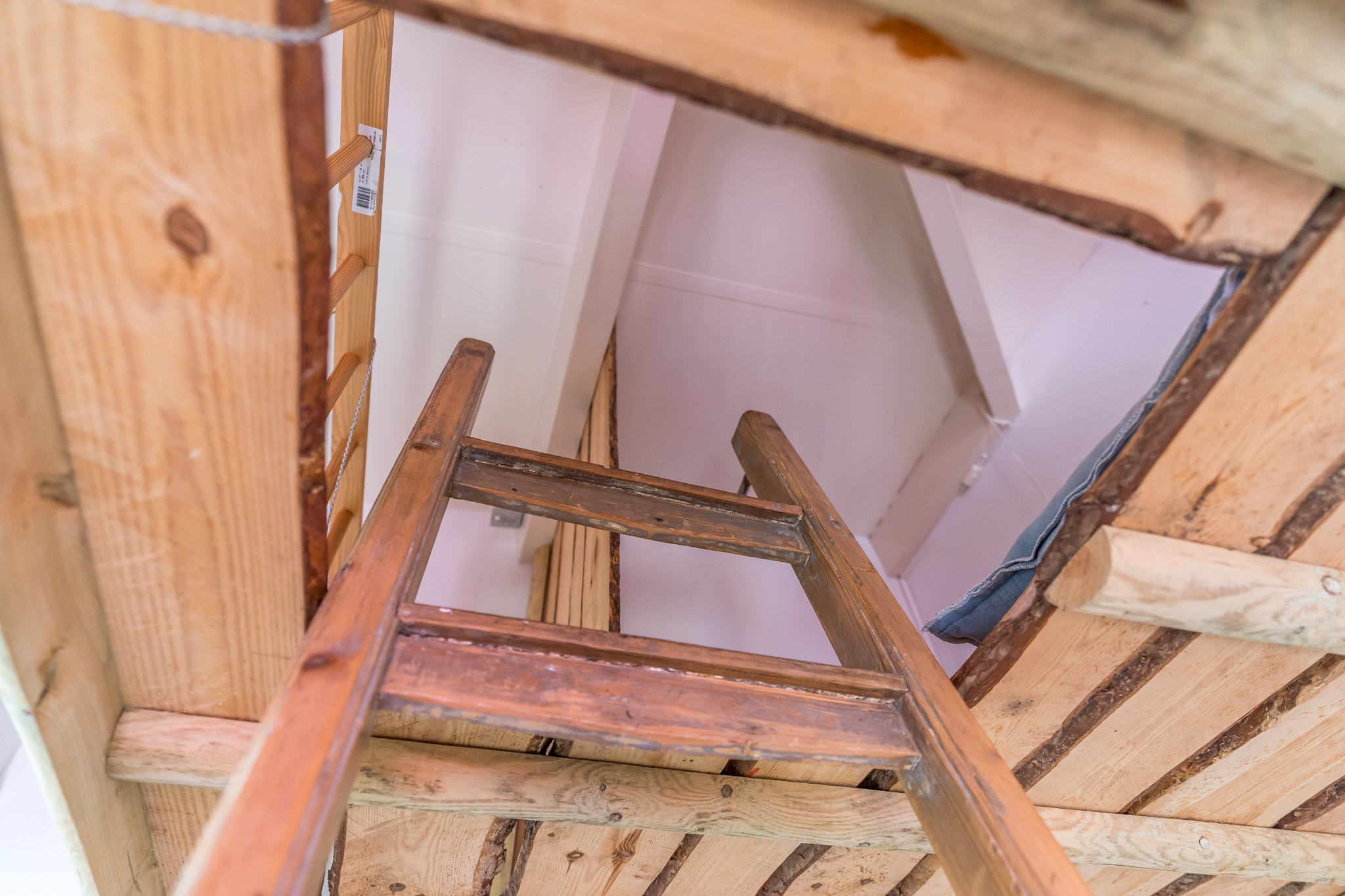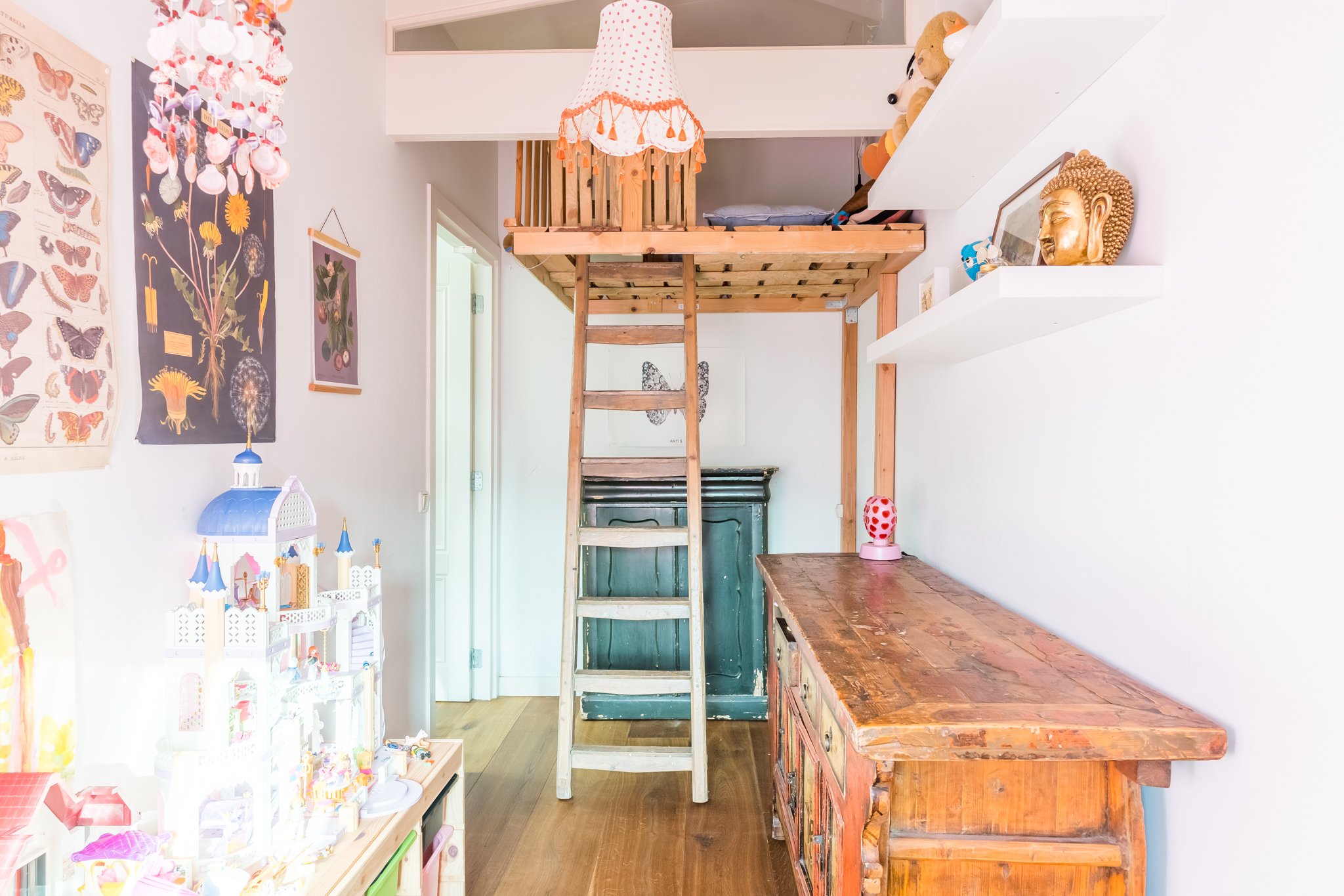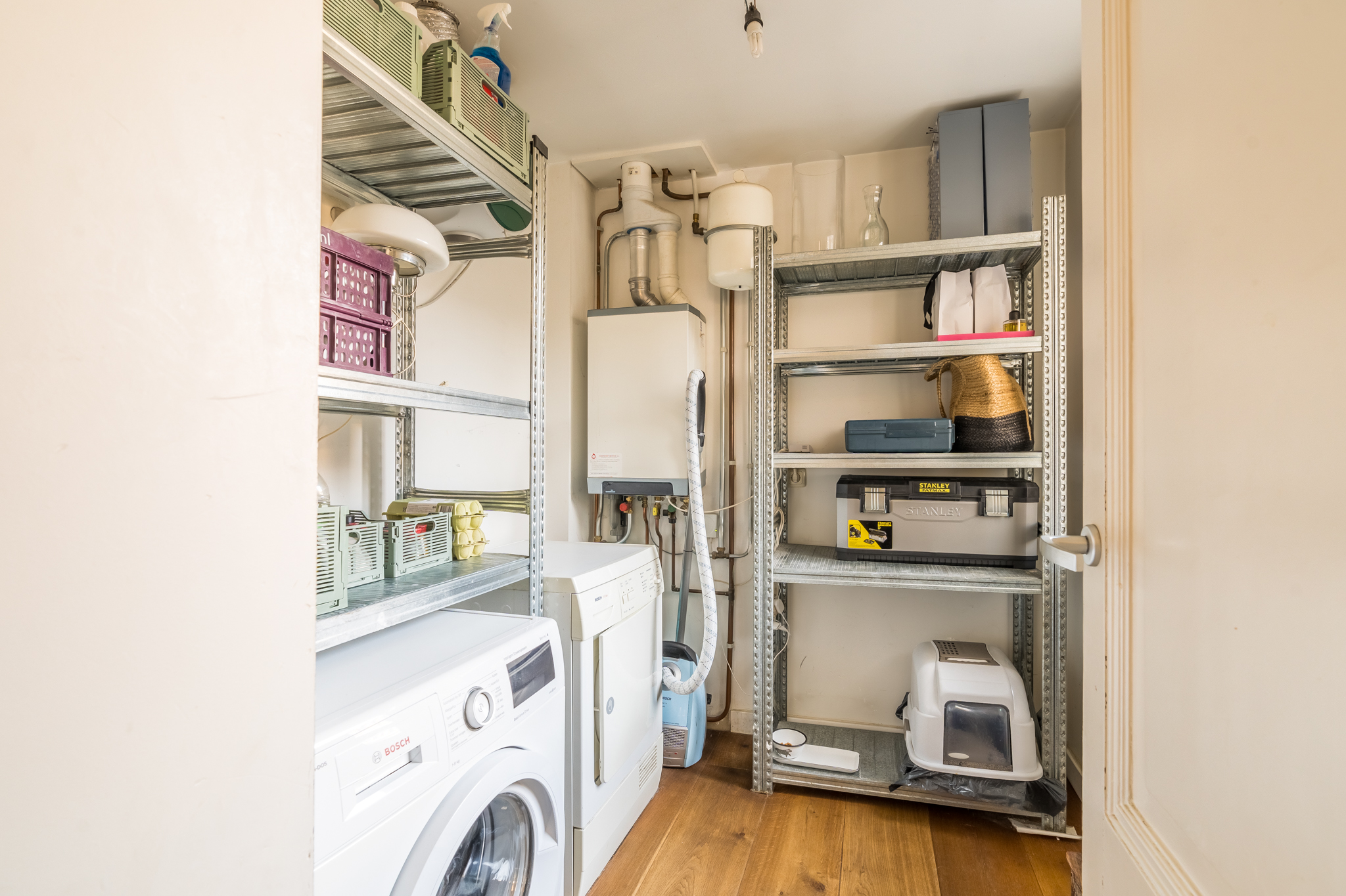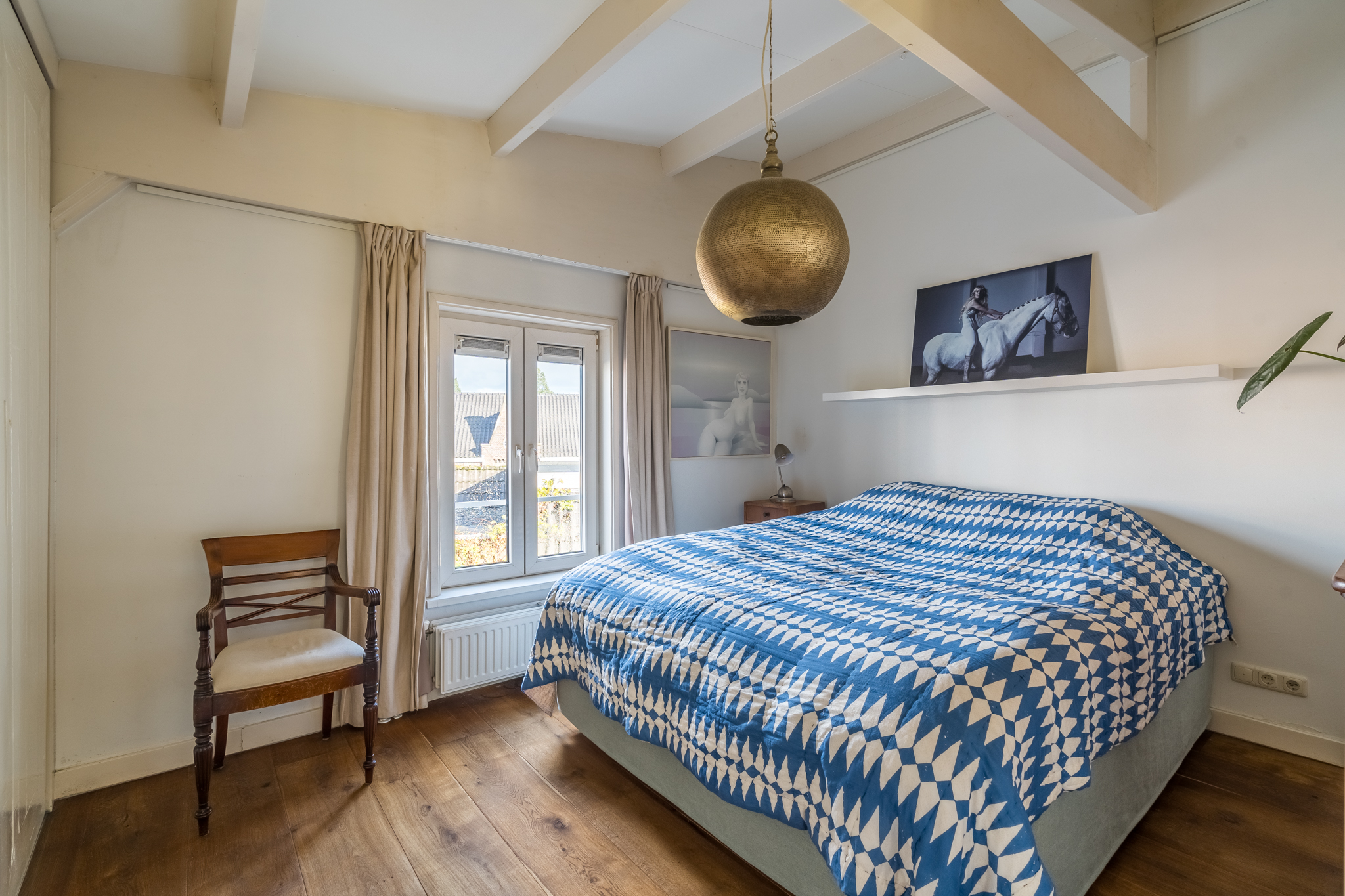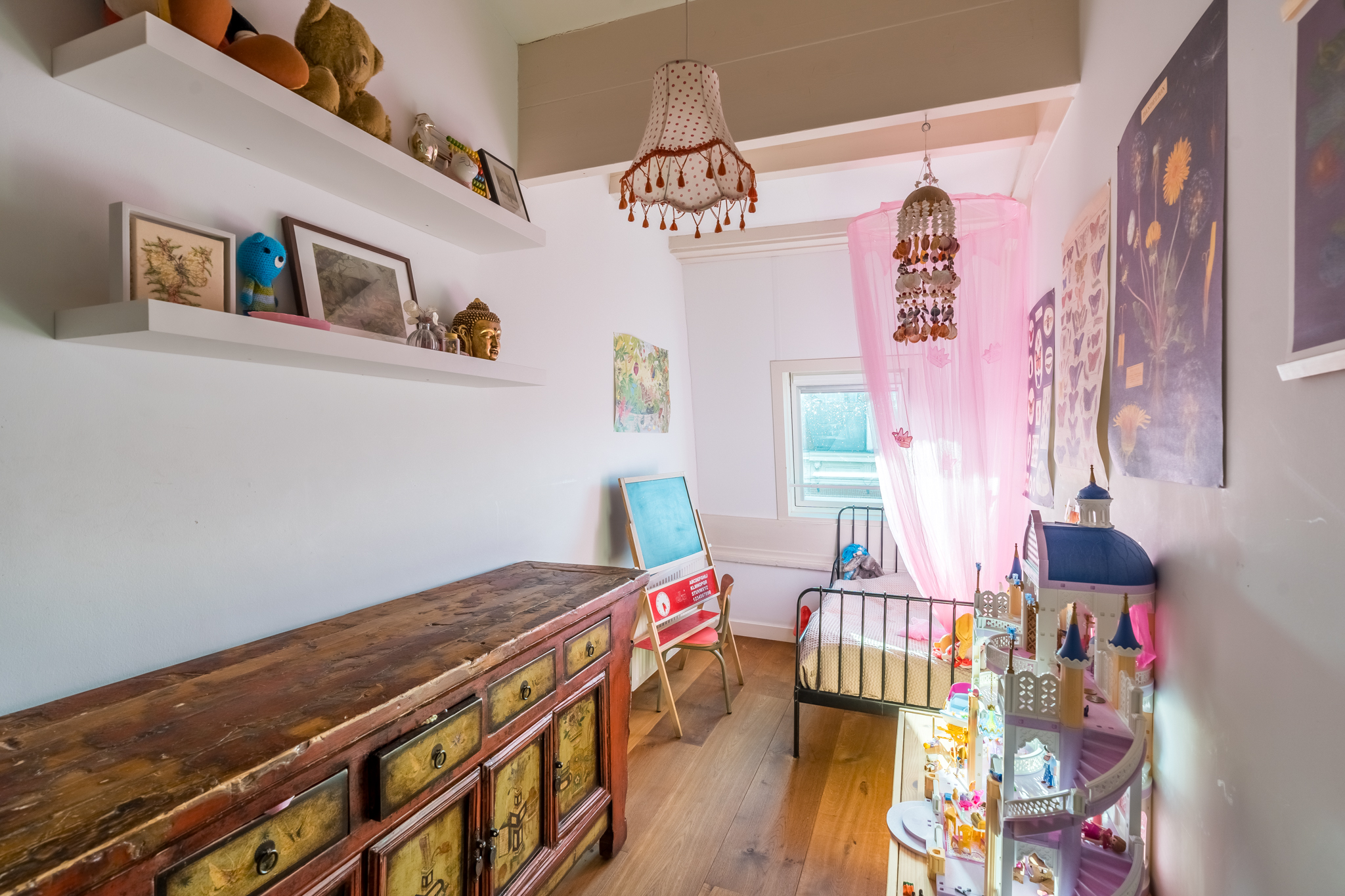 Op de vierde etage bevindt zich de slaapverdieping. Je vindt er drie flinke kamers, allen met hoge plafonds en de houten draagbalken speels en karakteristiek in het zicht. De master bedroom heeft een kledingkastenwand van vloer tot aan het plafond. De tweede wc met fontein is ook hier separaat gehouden van de badkamer. De badkamer heeft een schuifraam om wijn aangereikt te krijgen als je in bad ligt, of om de dag door te nemen met je partner terwijl je onder de douche staat.