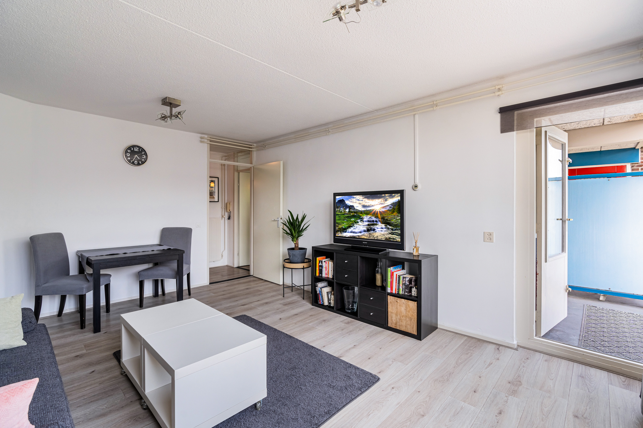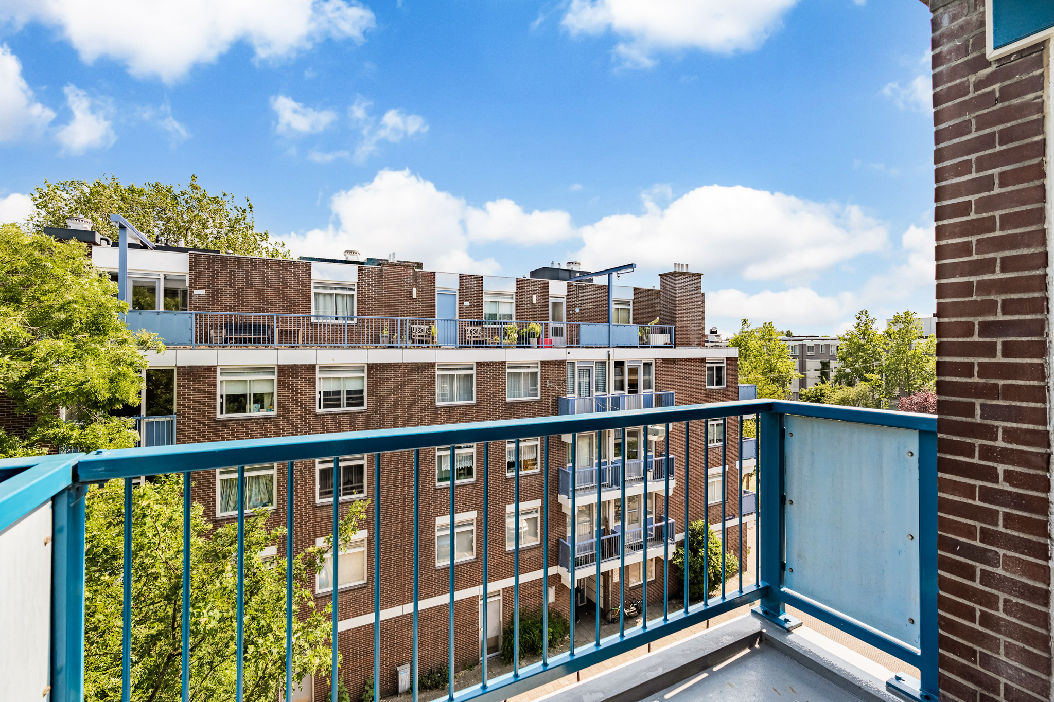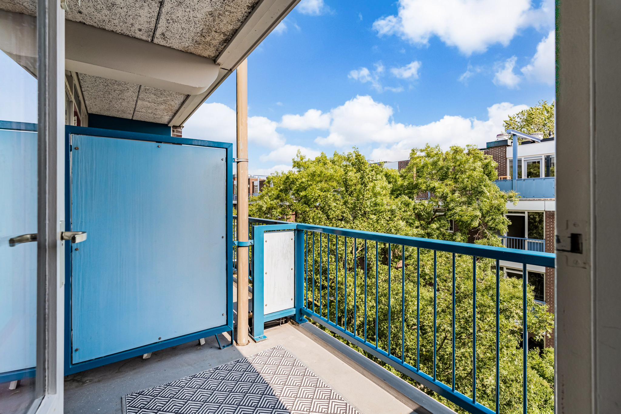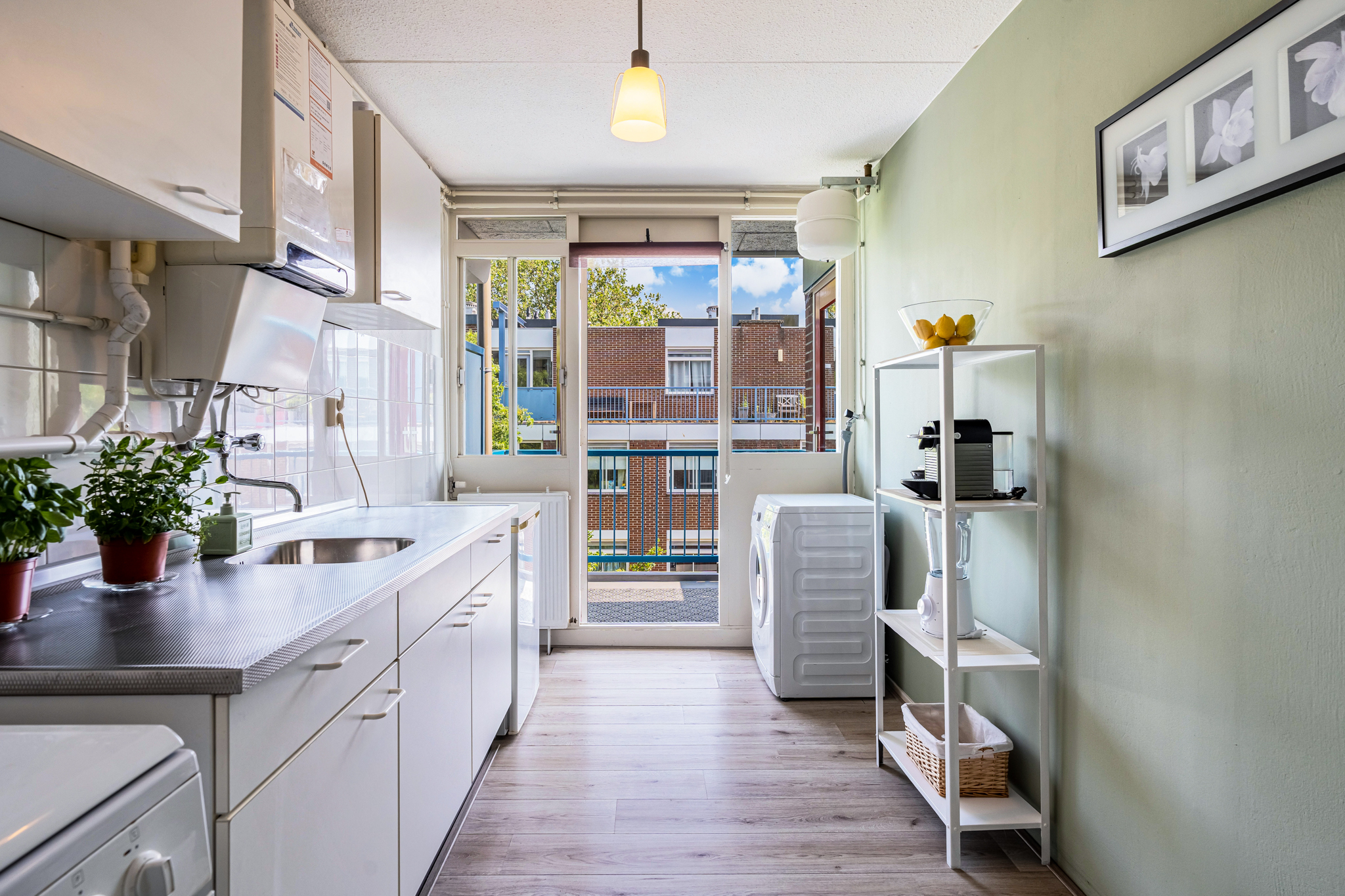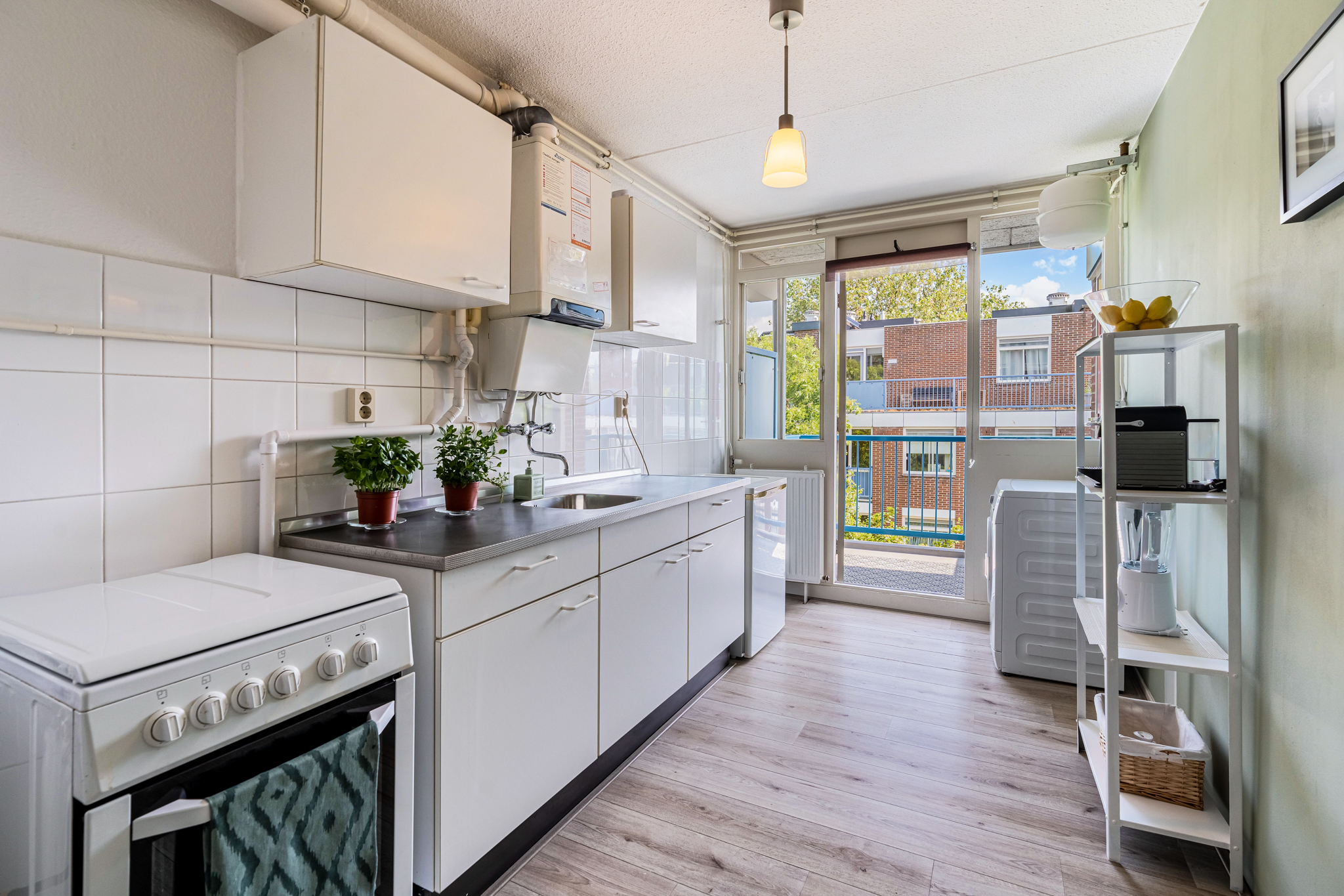 Het zonnige balkon, op het zuiden gelegen, biedt de hele middag zon en is een heerlijke plek om te ontspannen of gezellig te borrelen met vrienden. Zowel de woonkamer als de keuken bieden toegang tot het balkon.