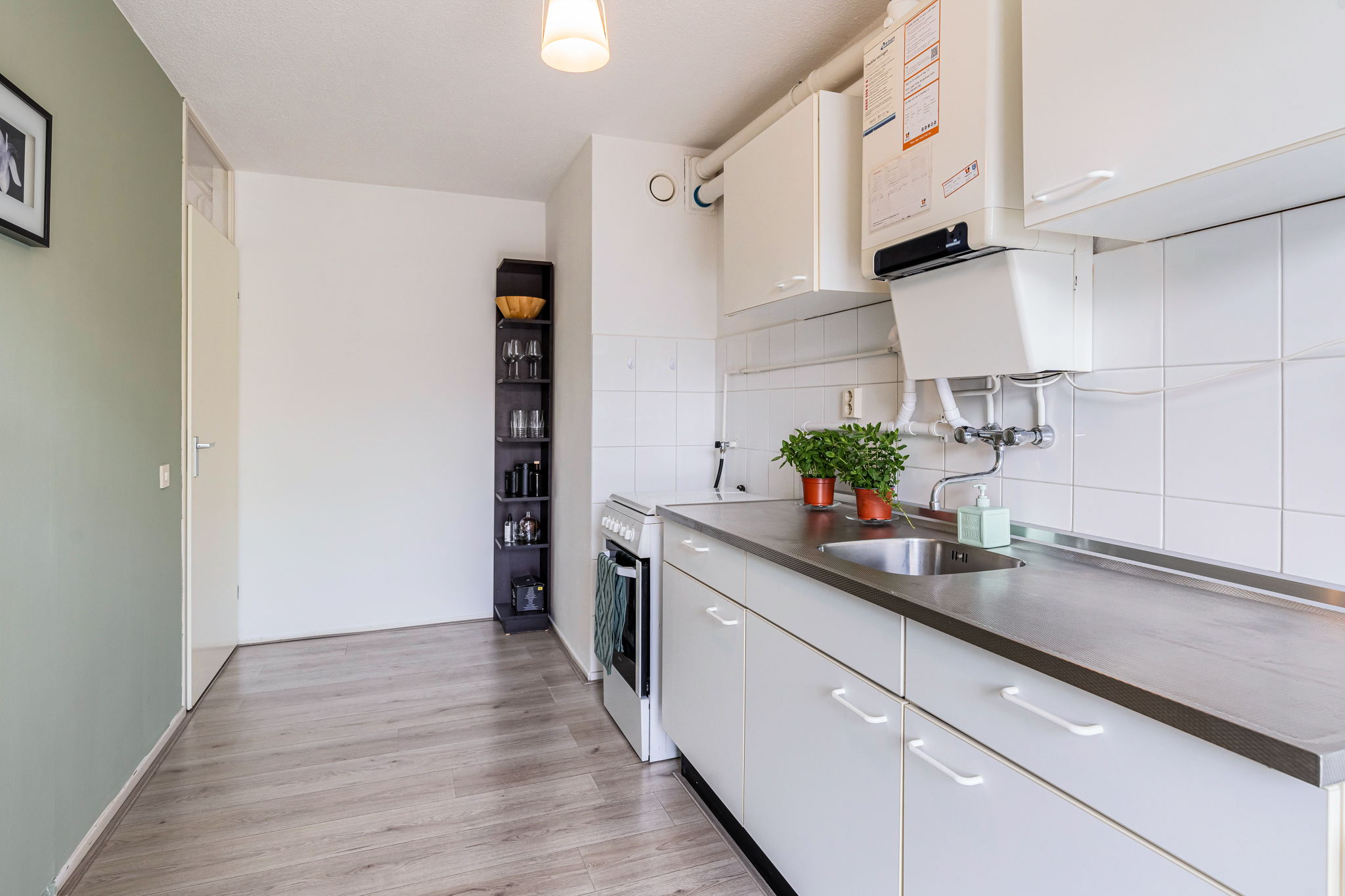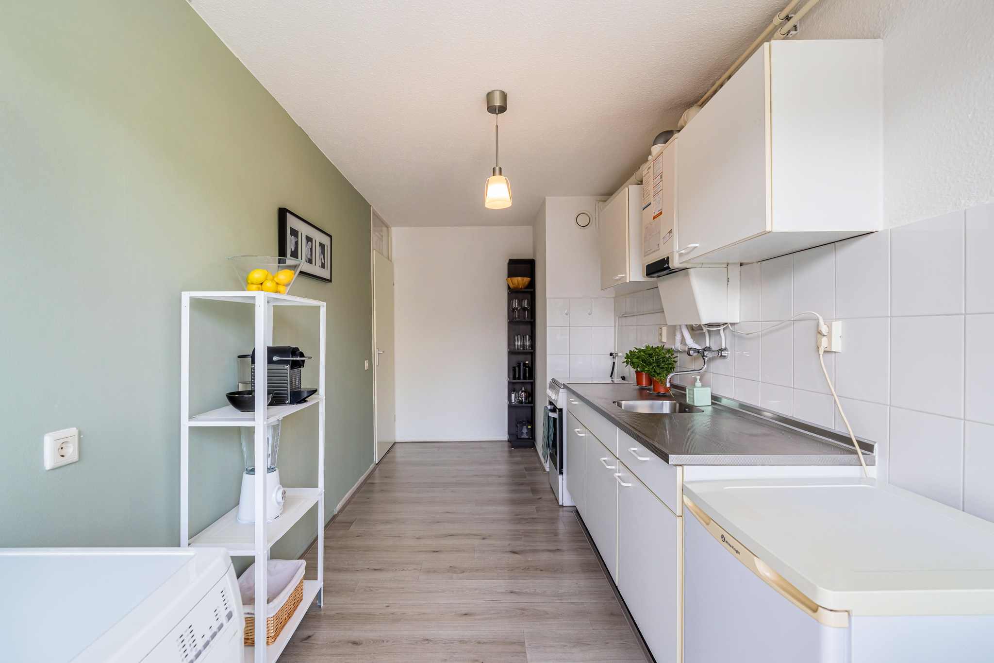 De woonkamer, gelegen aan de voorzijde van het pand, is een lichte en goed ingedeelde ruimte met levendig uitzicht op de straat. Grenzend aan de woonkamer bevindt zich de ruime keuken, die naast de standaardapparatuur ook voorzien is van aansluitingen voor een wasmachine en droger.