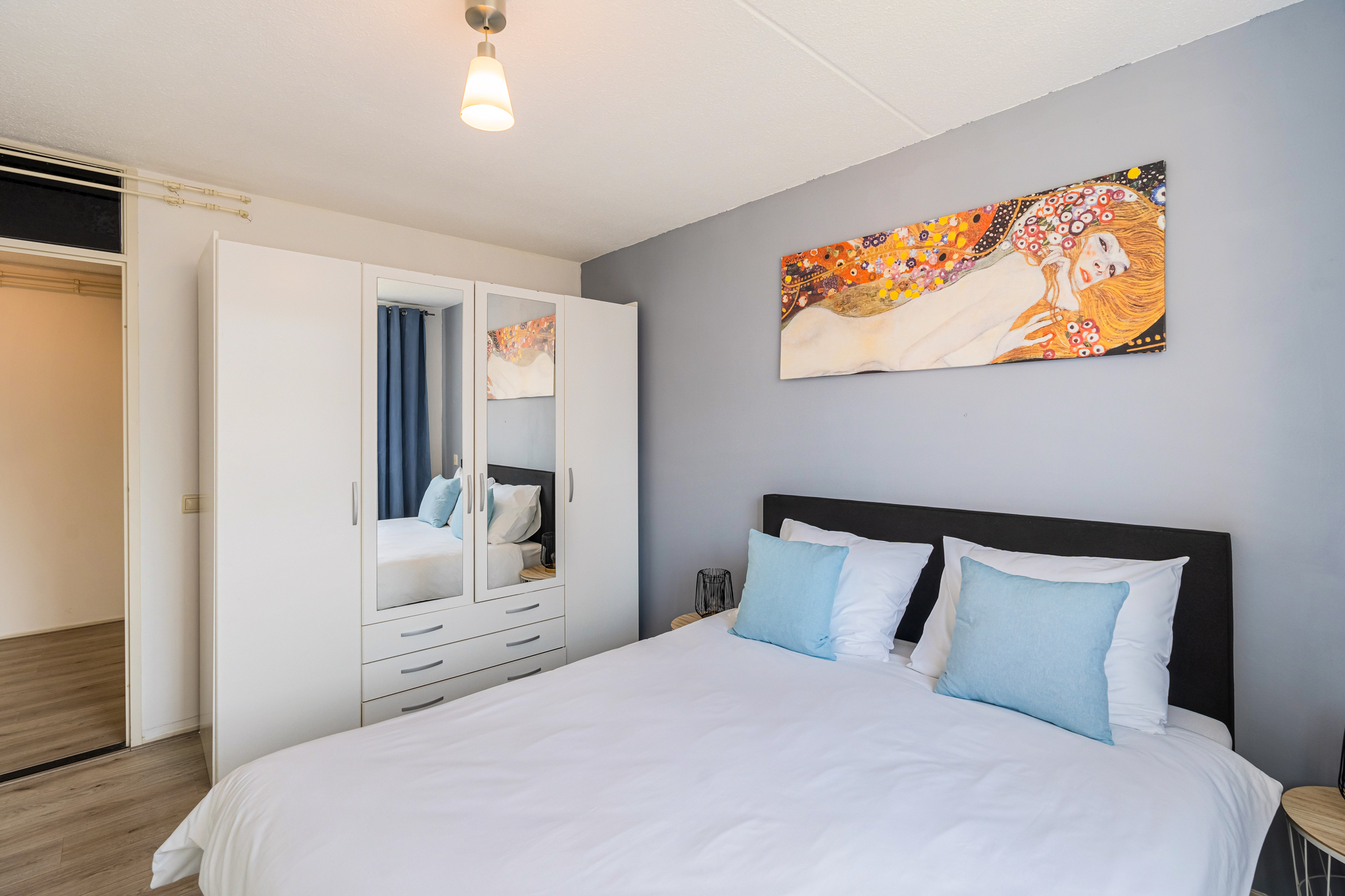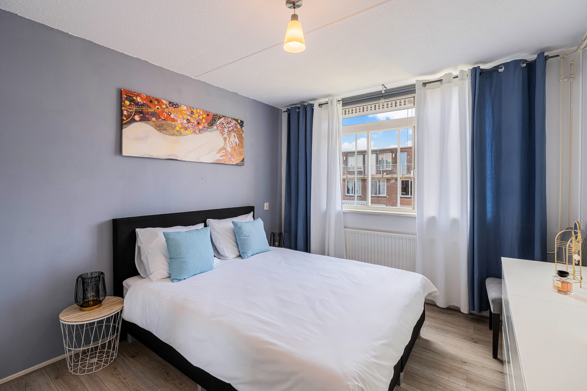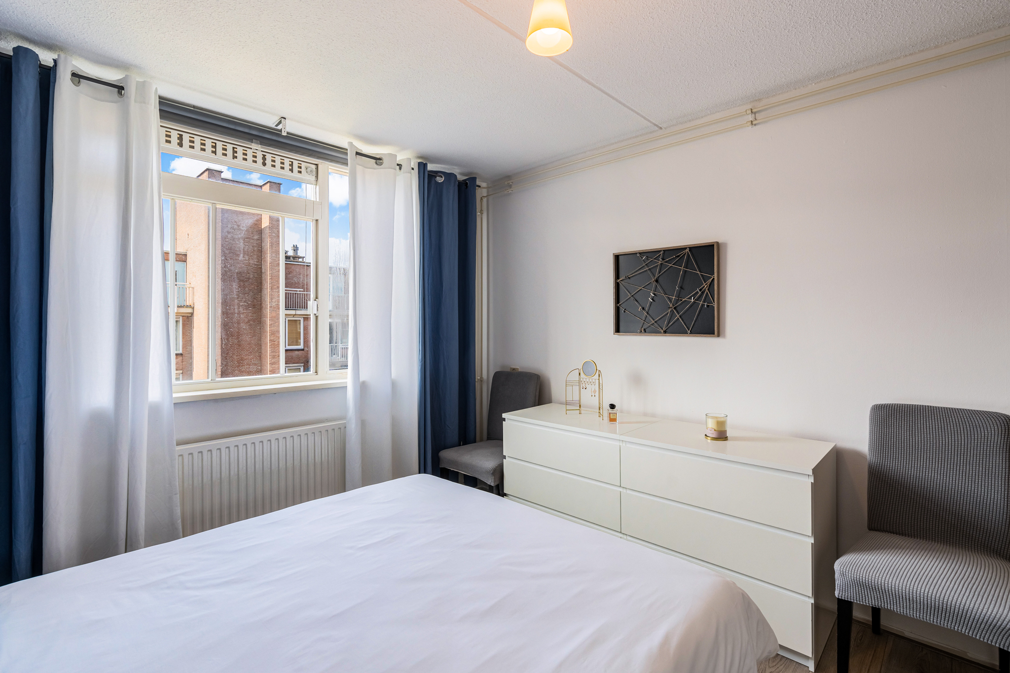 De slaapkamer is aan de achterzijde gelegen en heeft een comfortabel formaat. Vanuit hier geniet je van uitzicht op de groene binnentuin, waar in de zomer de vogels vrolijk fluiten.