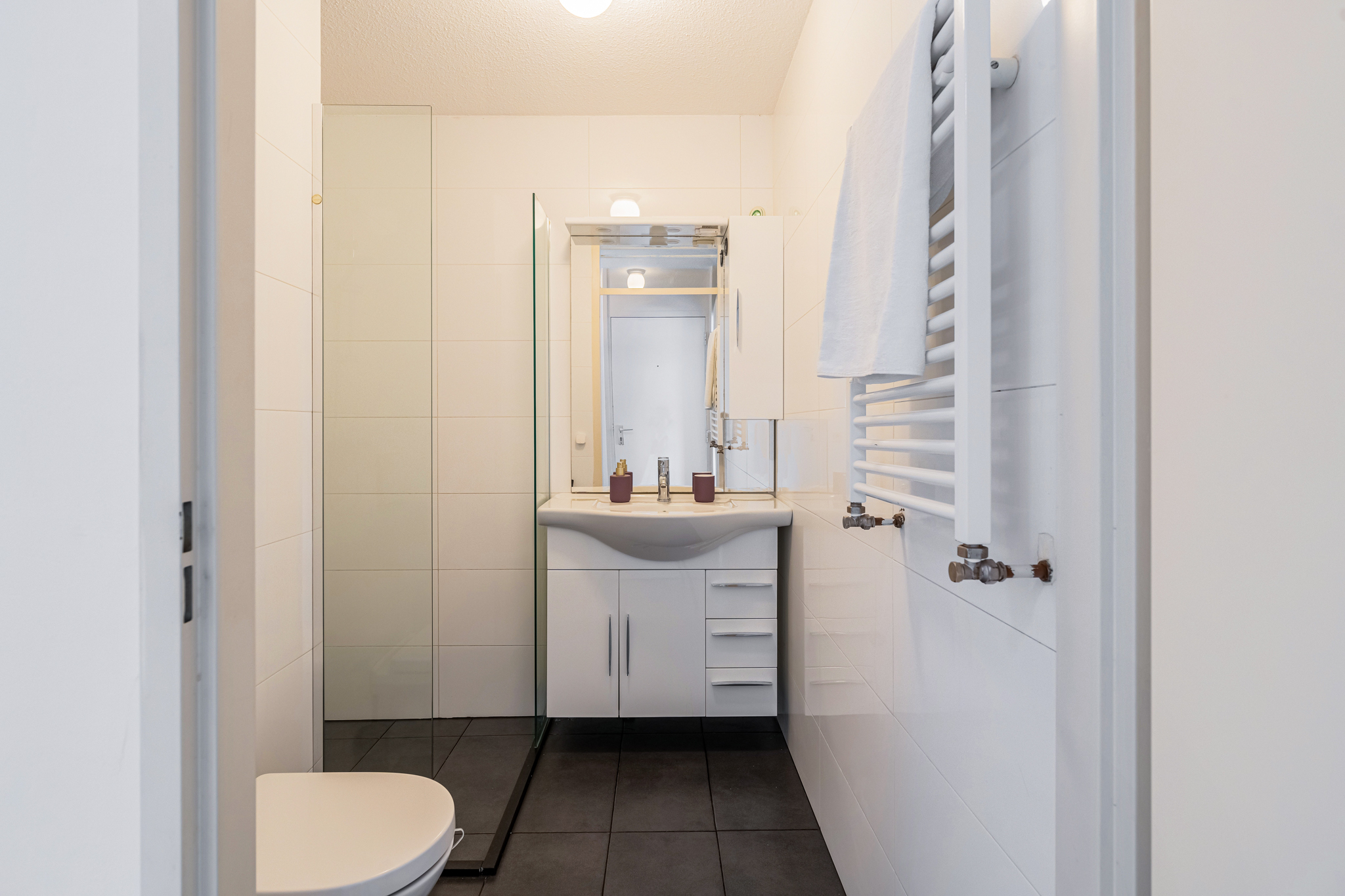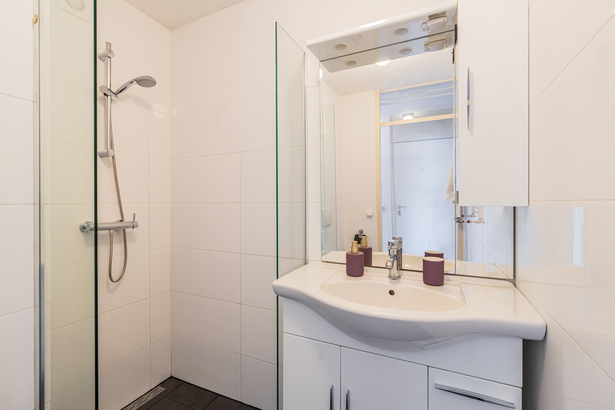 De badkamer bevindt zich tussen de woonkamer en de slaapkamer en is uitgerust met een wastafel, inloopdouche en WC.