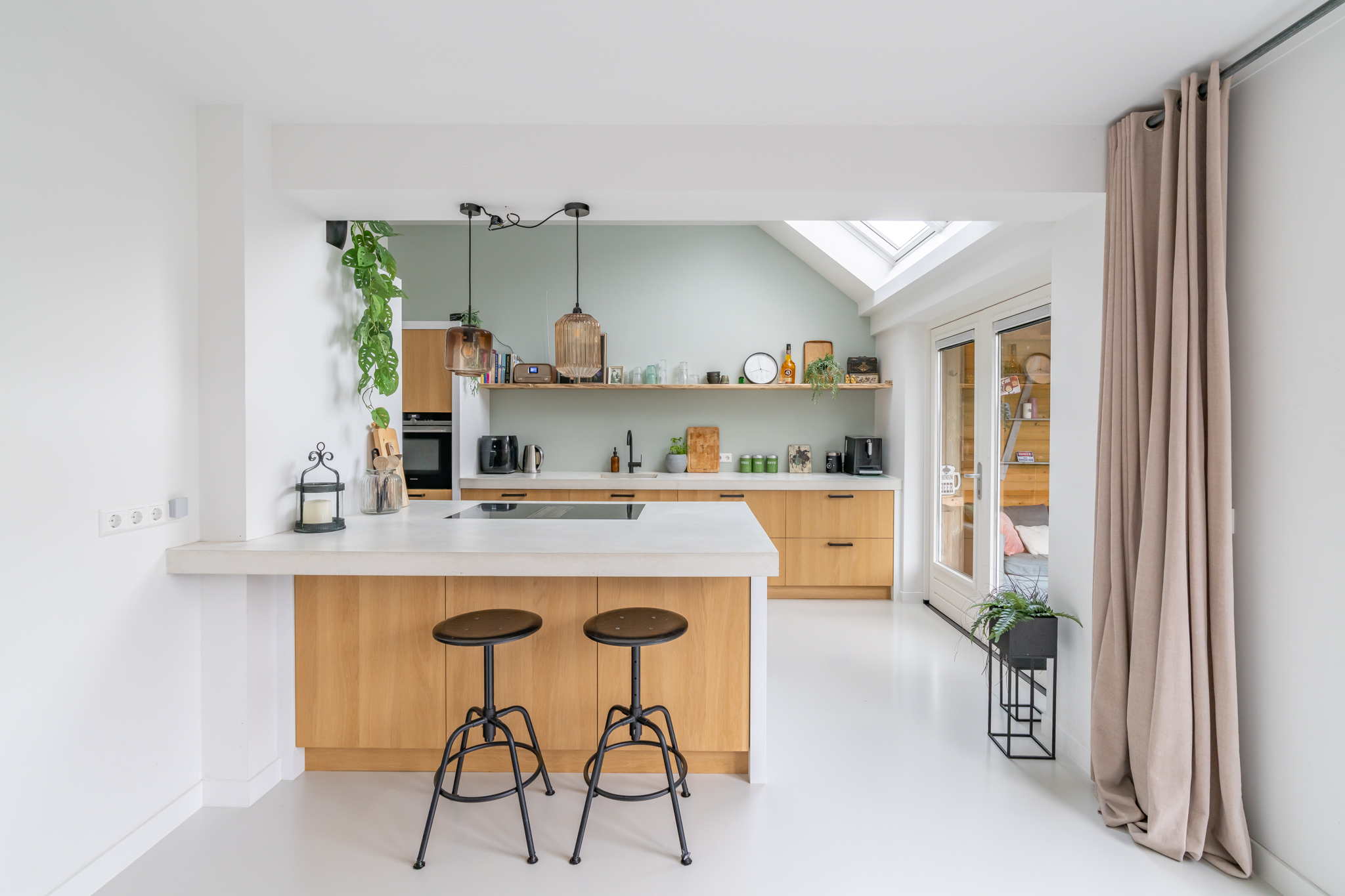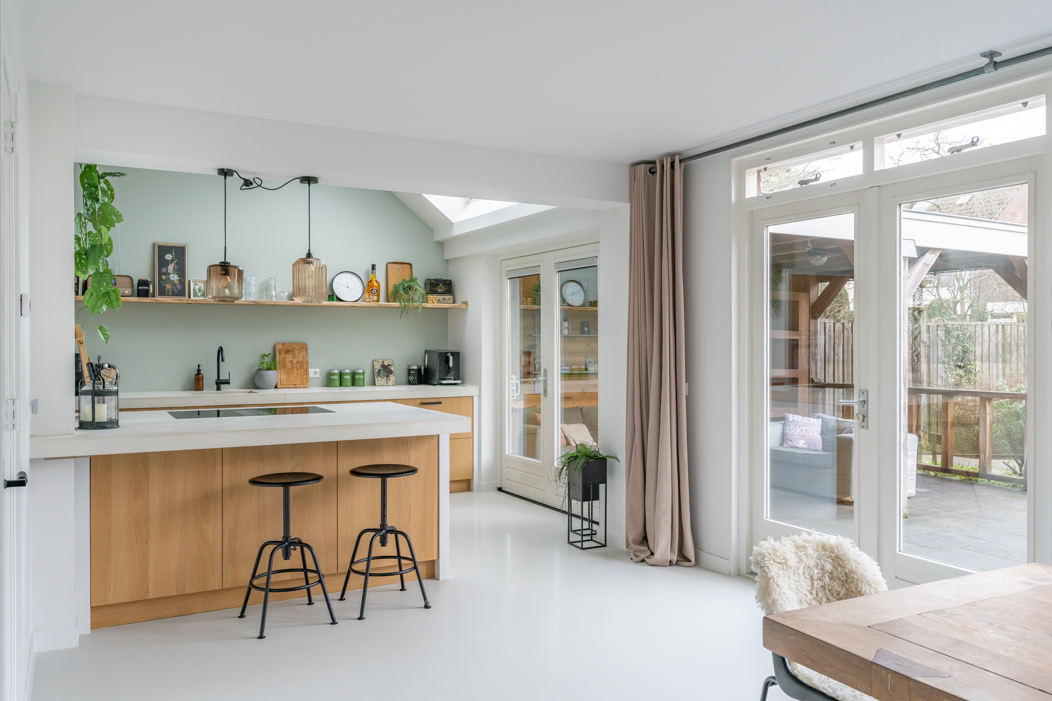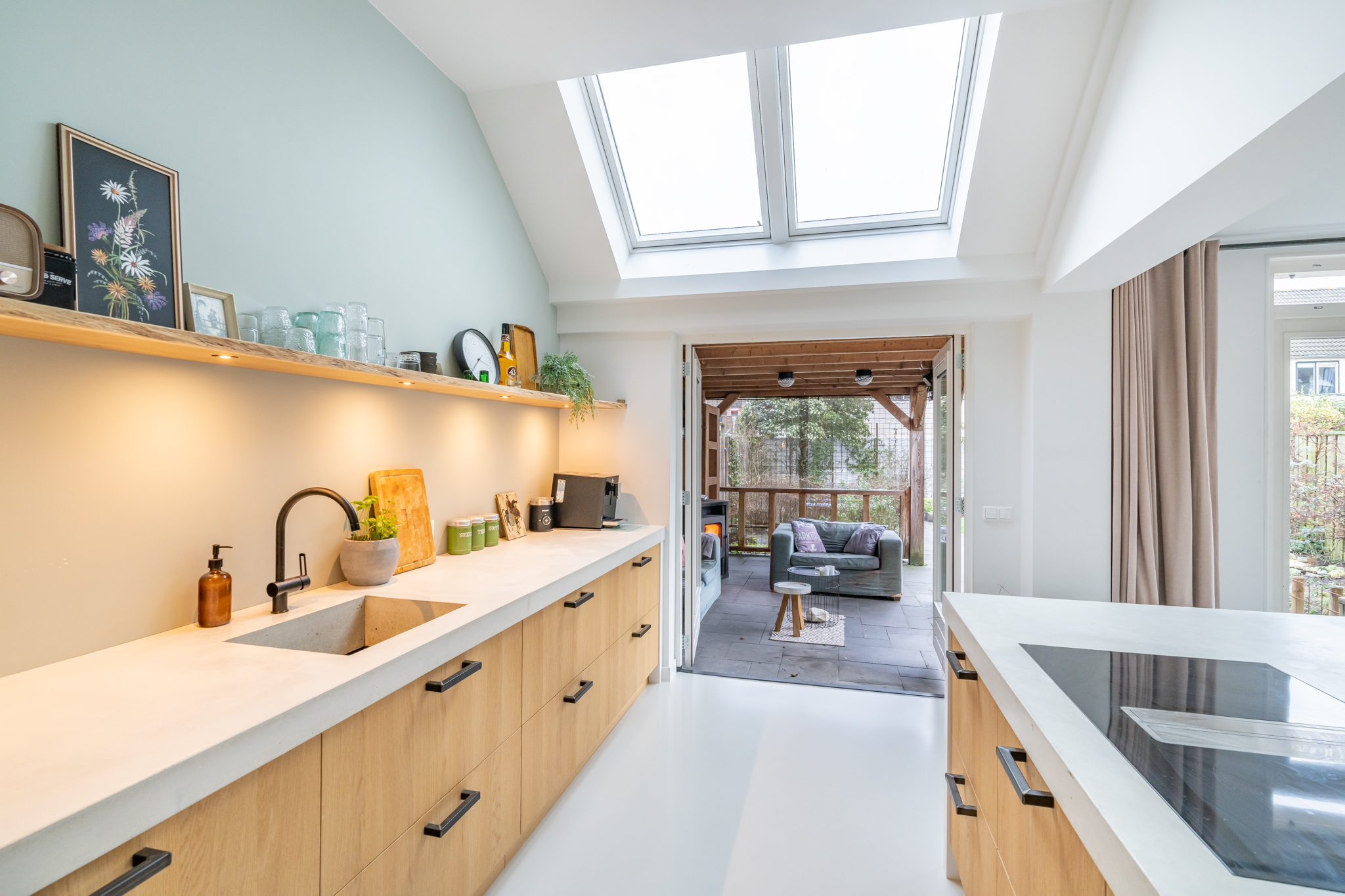 De voormalige garage is verbouwd tot keuken, hal en hobbyzolder.