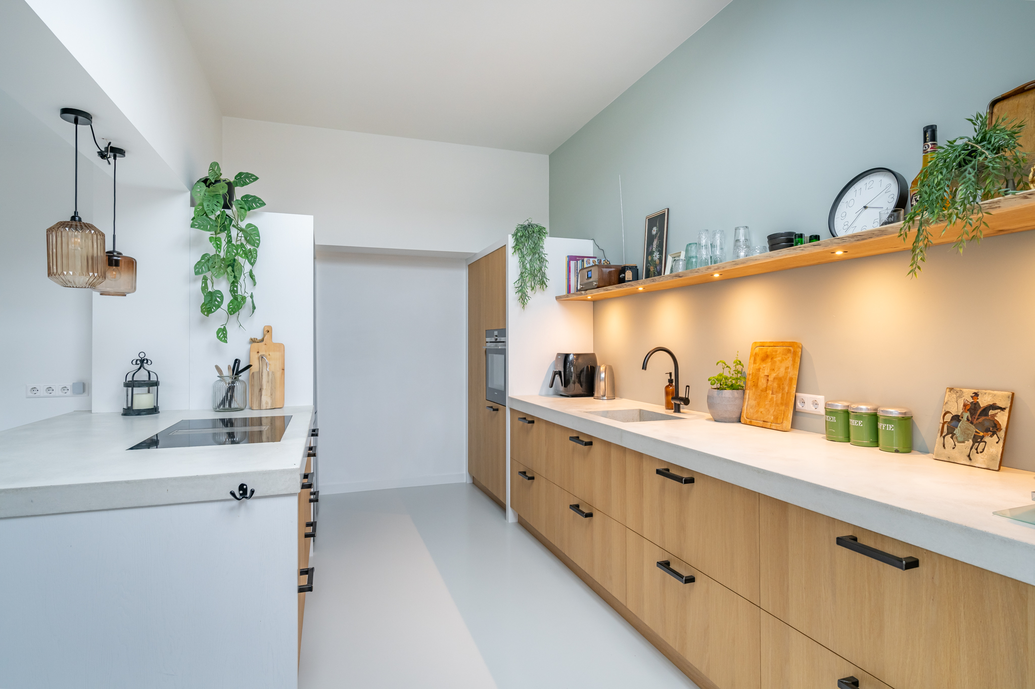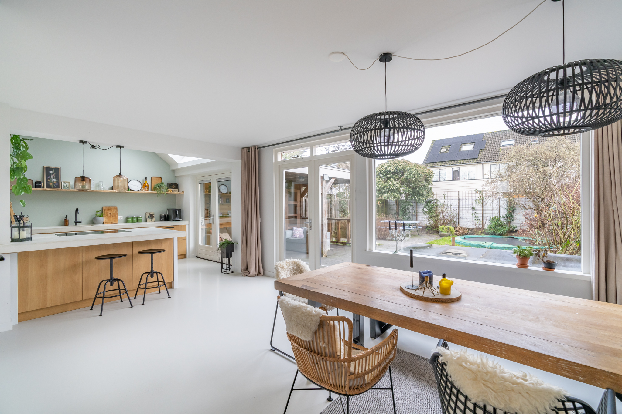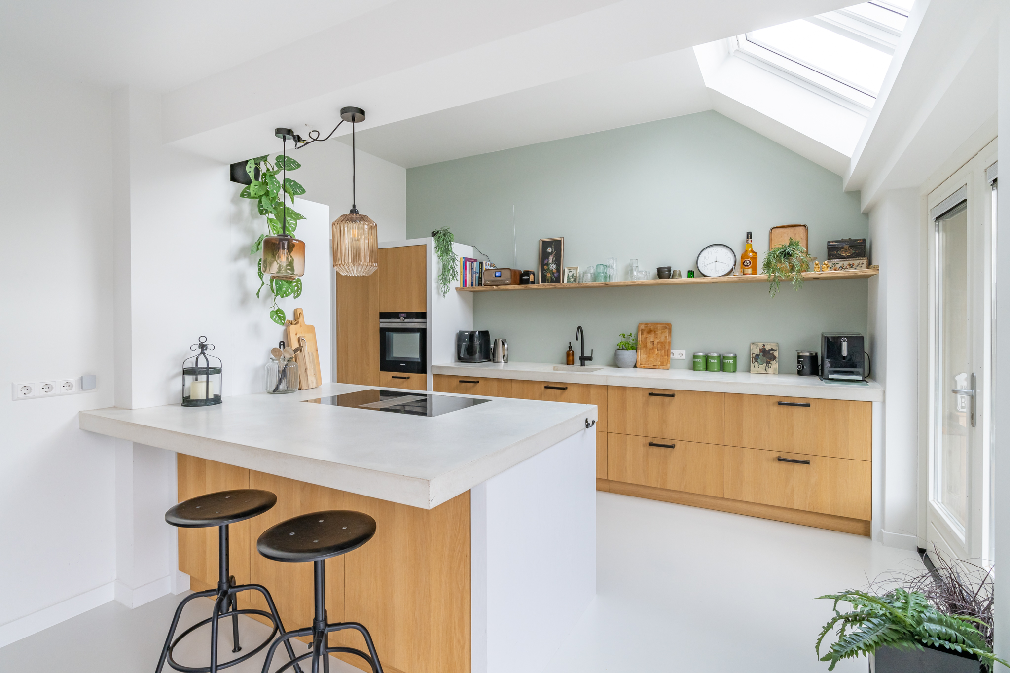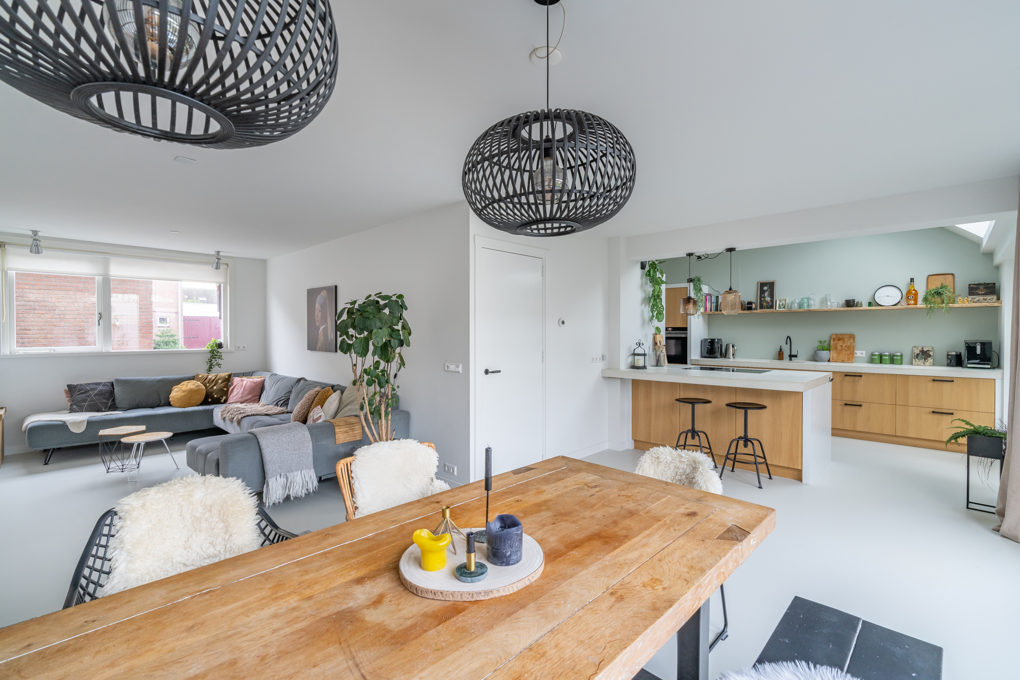 De voormalige garage is verbouwd tot keuken, hal en hobbyzolder.