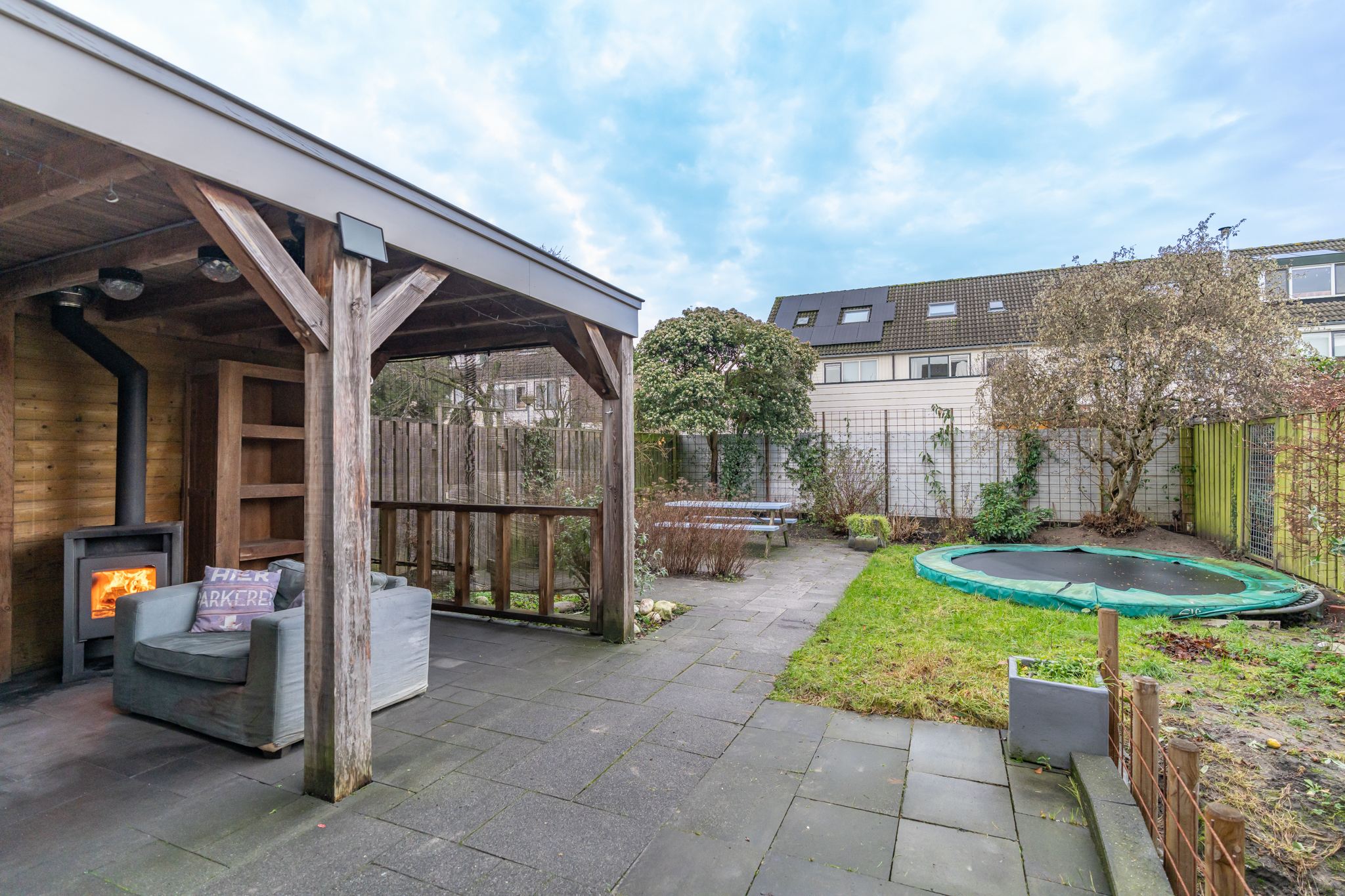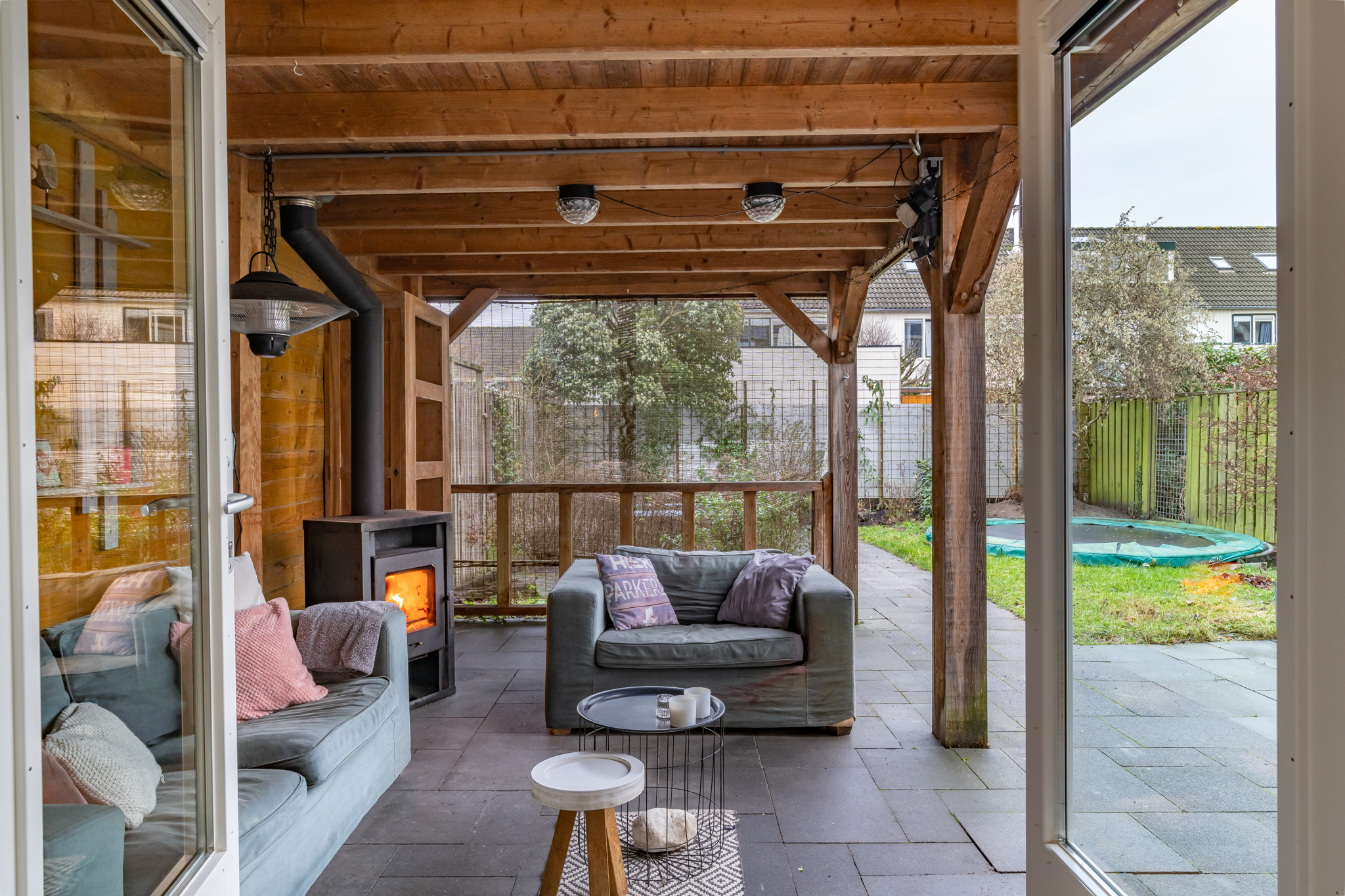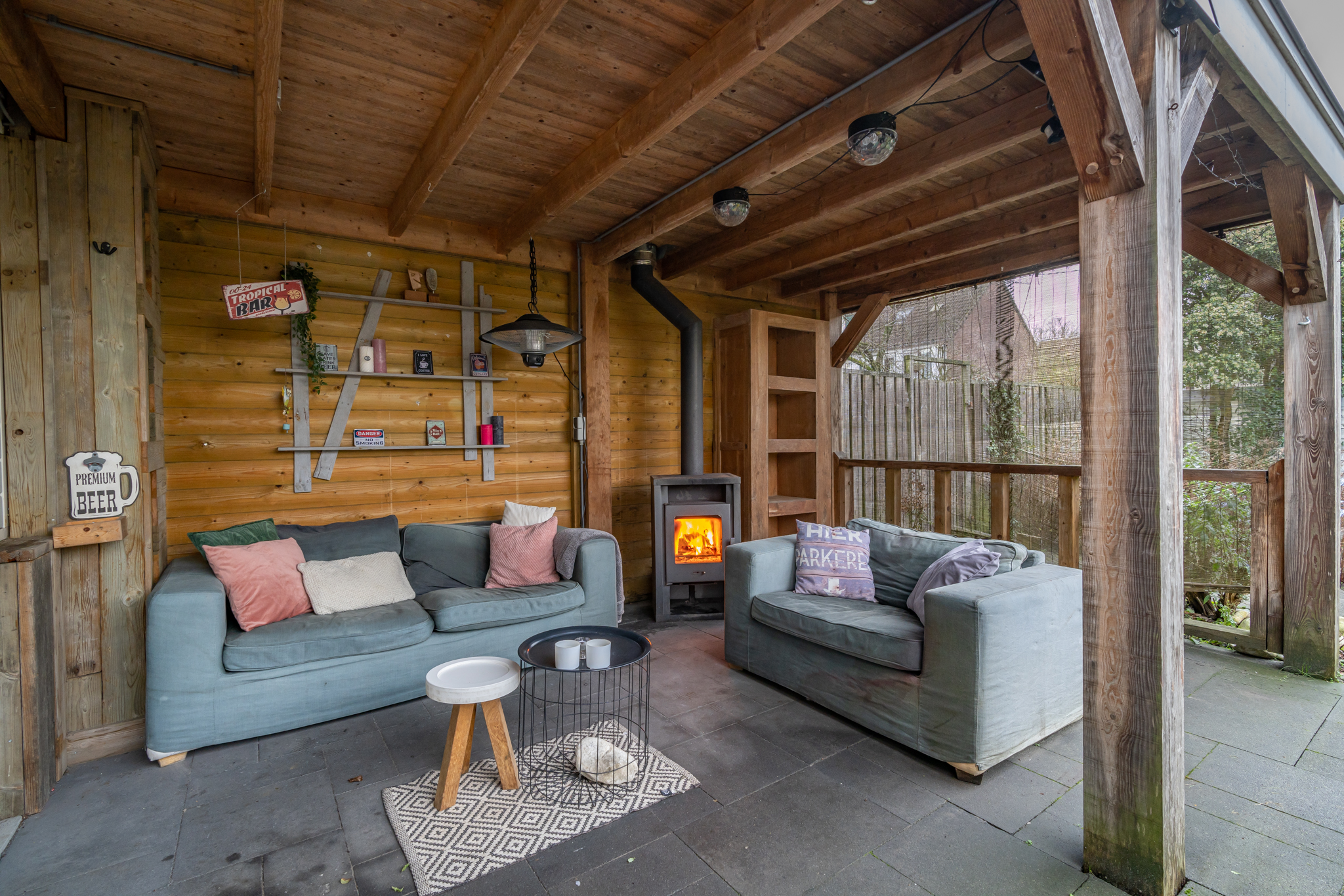 De diepe achtertuin met achterom ligt op het Oosten en heeft de hele dag zon. In de gezellige veranda met houtkachel kun je ieder jaargetijden fijn vertoeven.