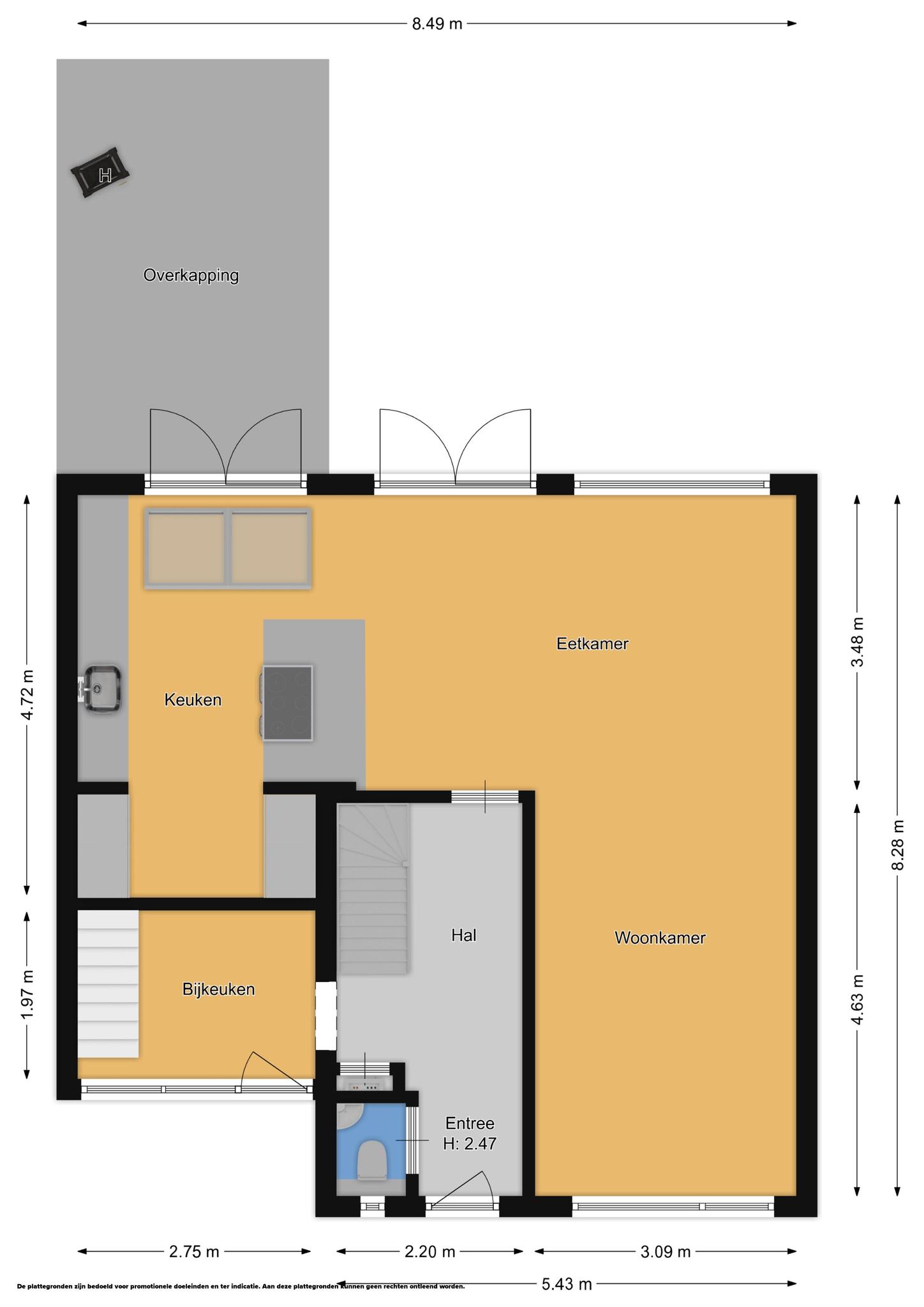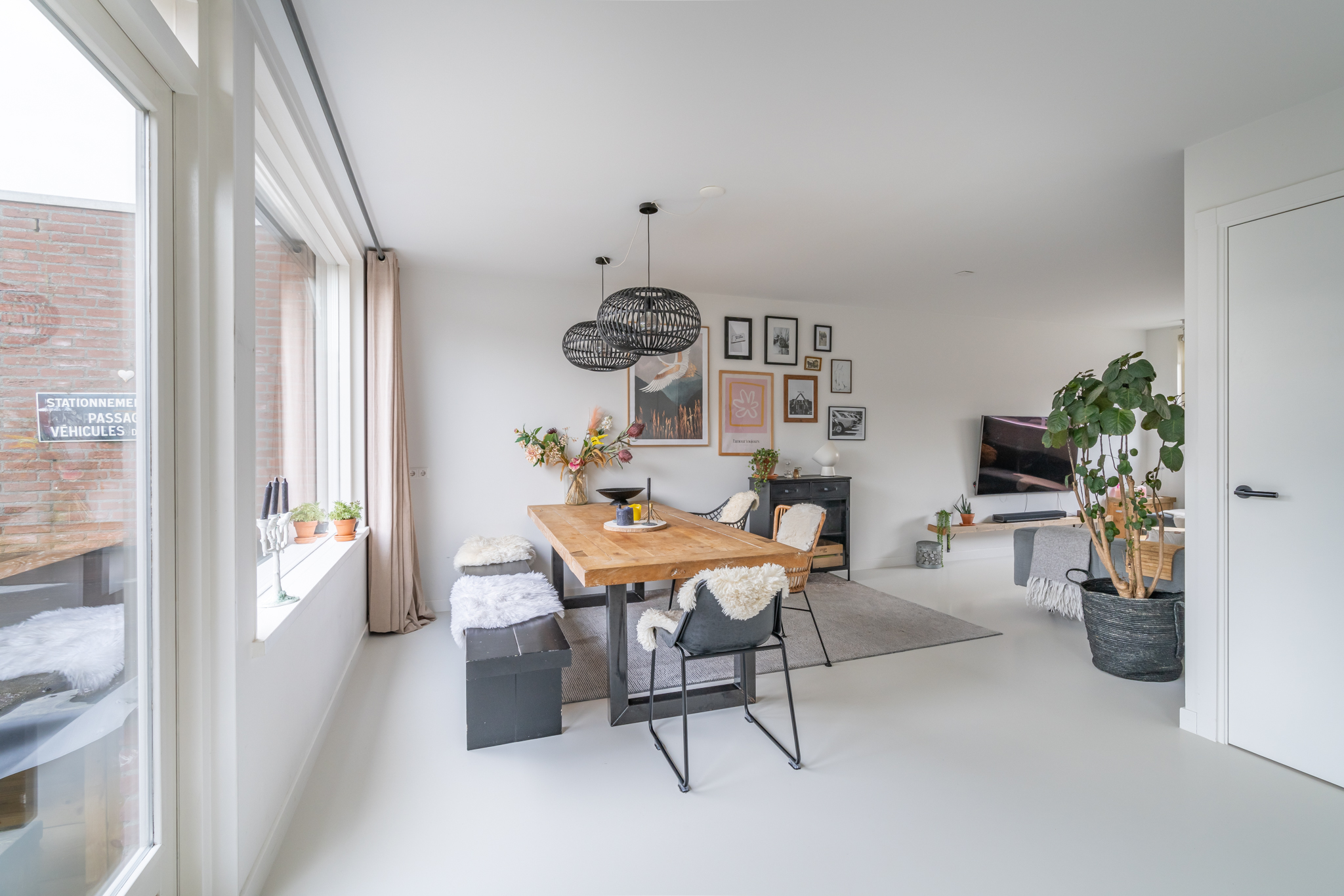Entree, hal, toilet met fonteintje, zeer ruime en lichte woonkamer met dubbele openslaande deuren naar de tuin en fraaie gietvloer met vloerverwarming, aan de voorzijde de zithoek, aan de tuinzijde de lichte eethoek en de luxe open keuken v.v. inbouwapparatuur en fraai betonnen werkblad. (de voormalige garage is bij de woonkamer getrokken). Tweede entree, hal, trap naar de zolder met een gezellige tv hoek/logeerplek.