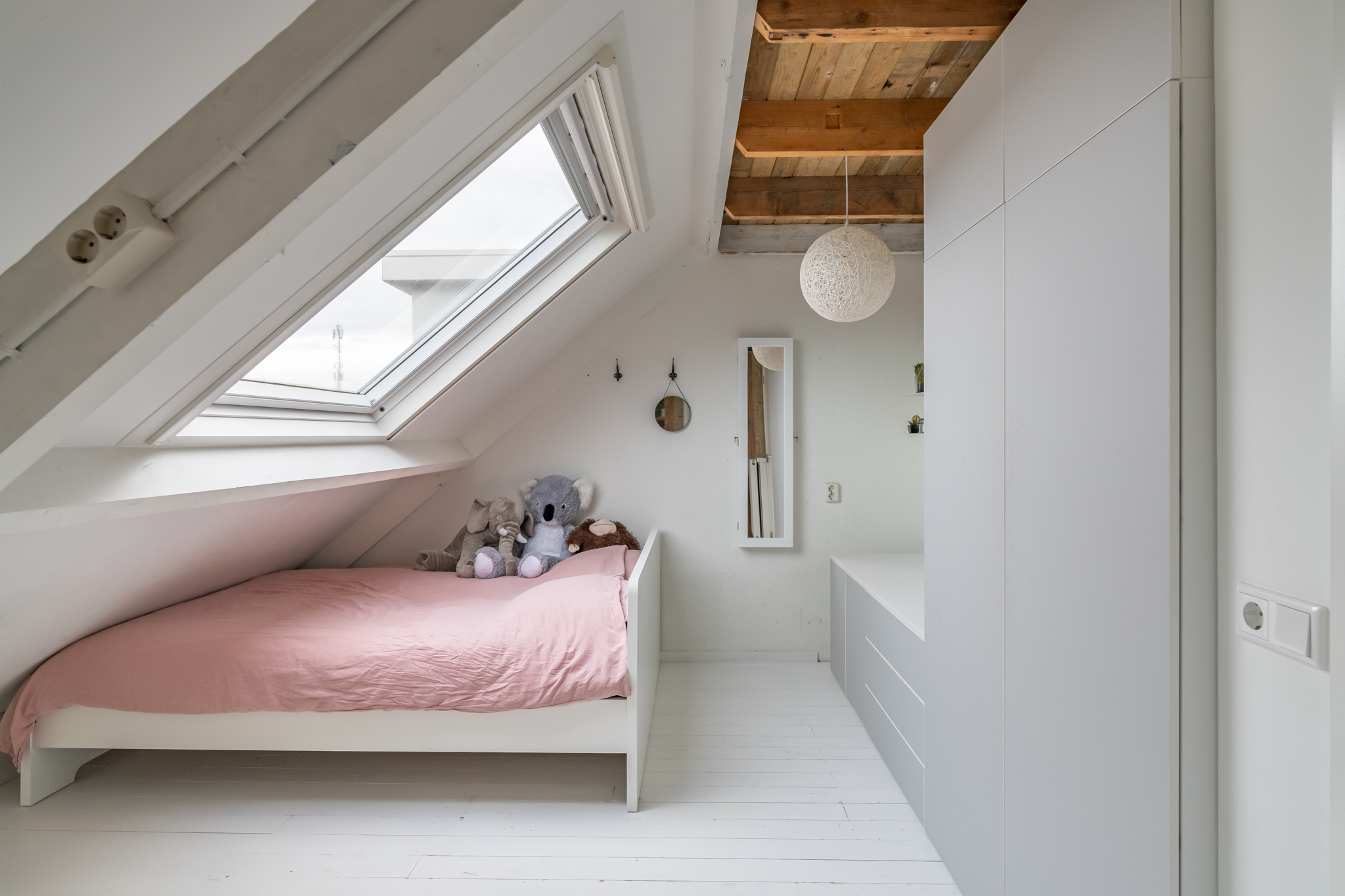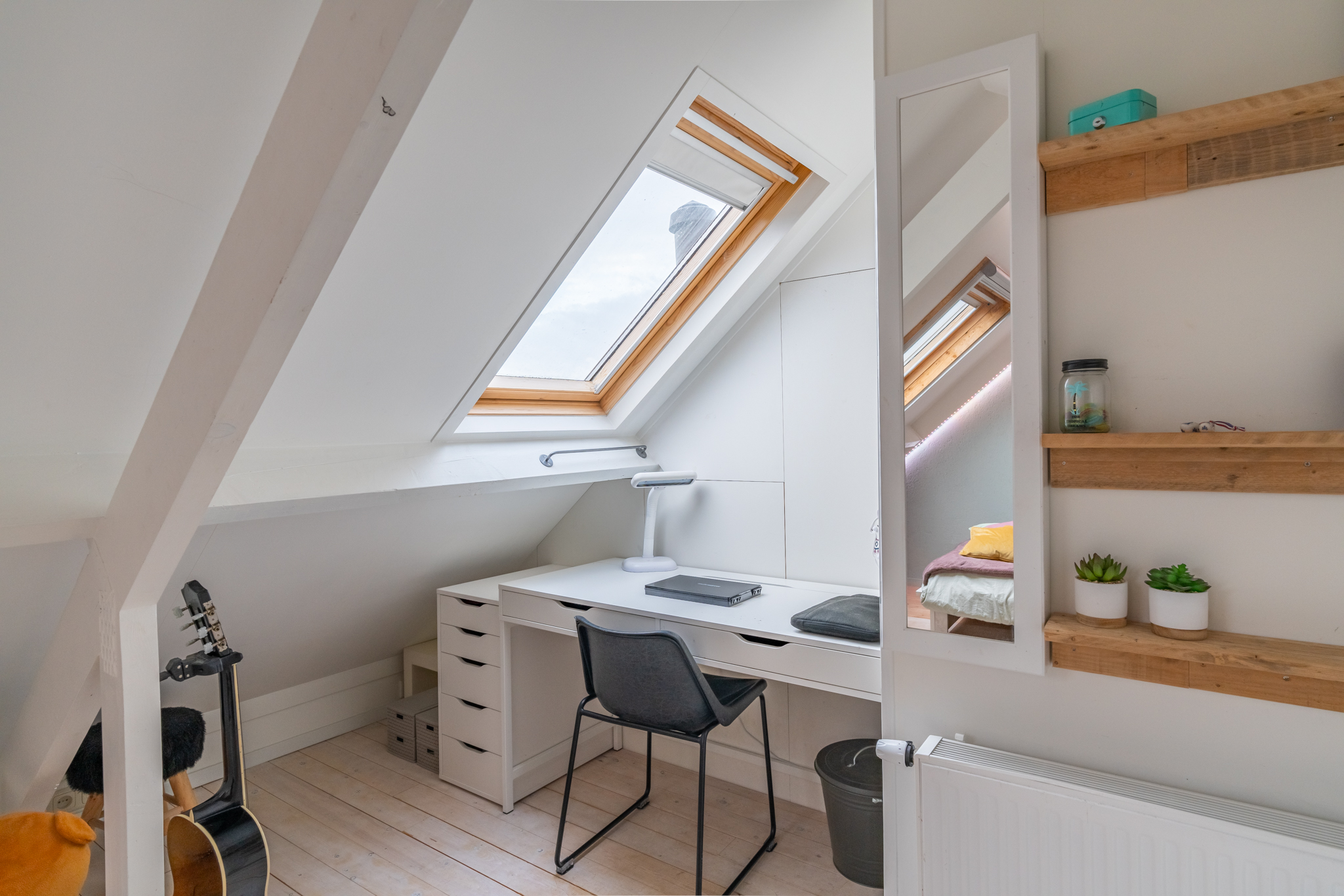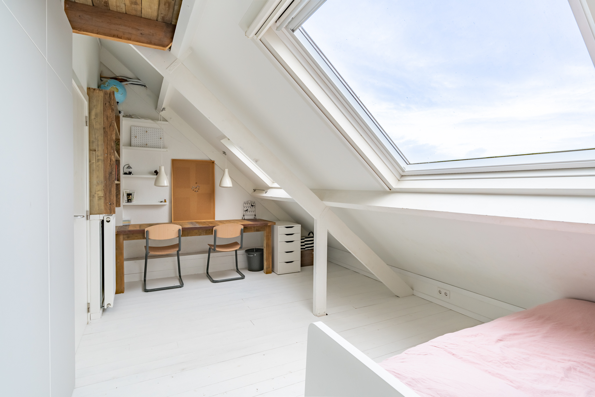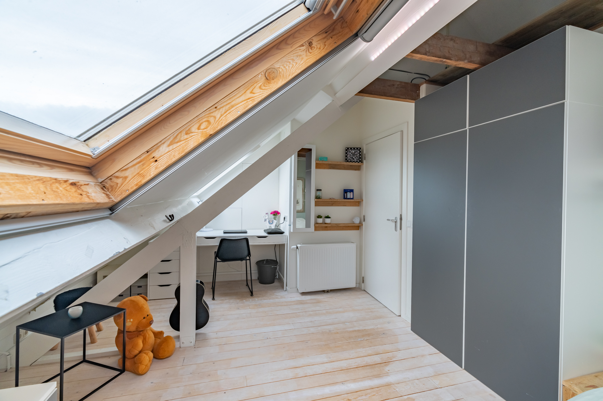 Overloop, 4e slaapkamer met vaste kast en Velux dakraam aan de voorzijde, 5e slaapkamer eveneens met dakraam en vaste kast aan de tuinzijde.