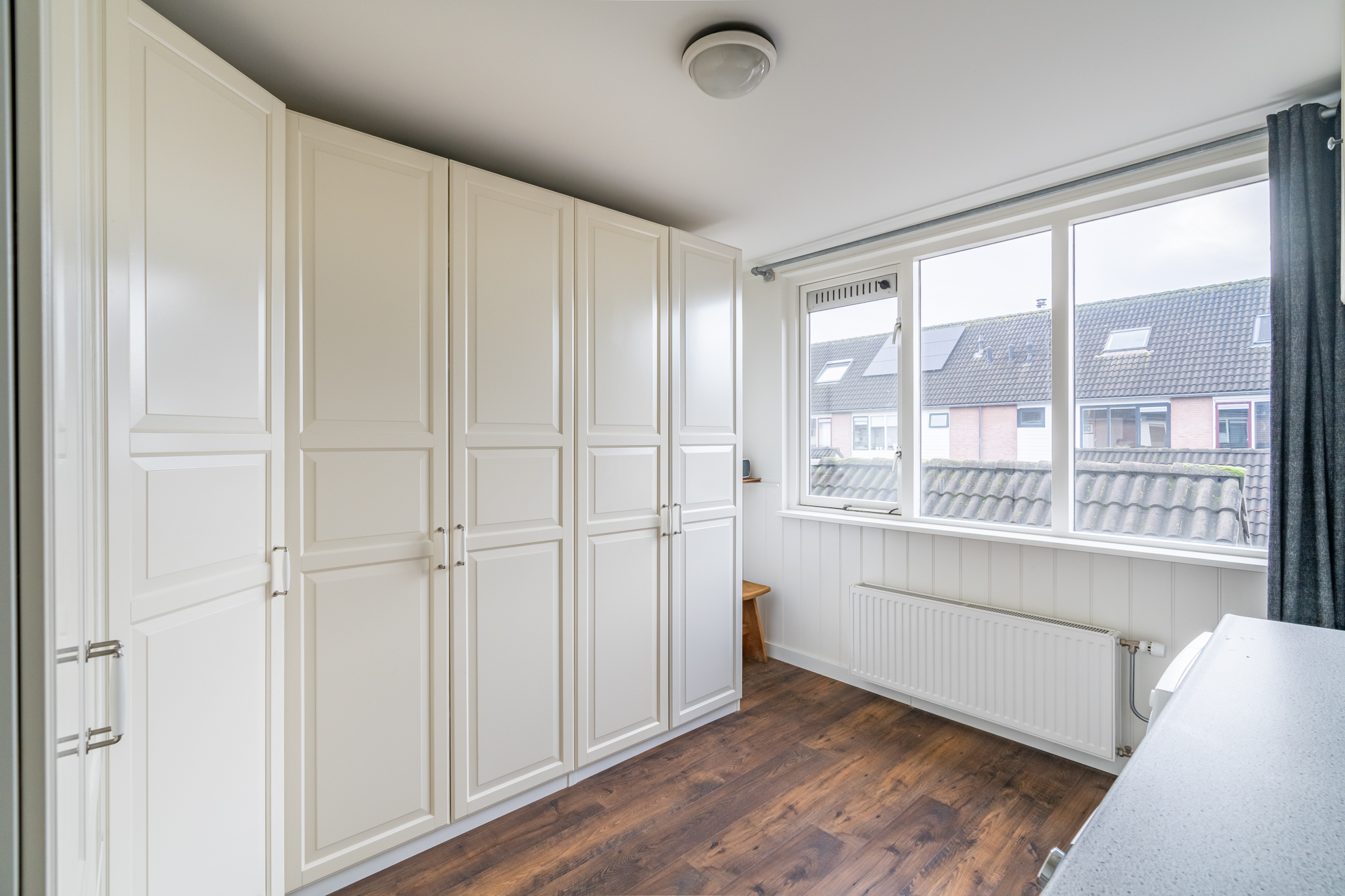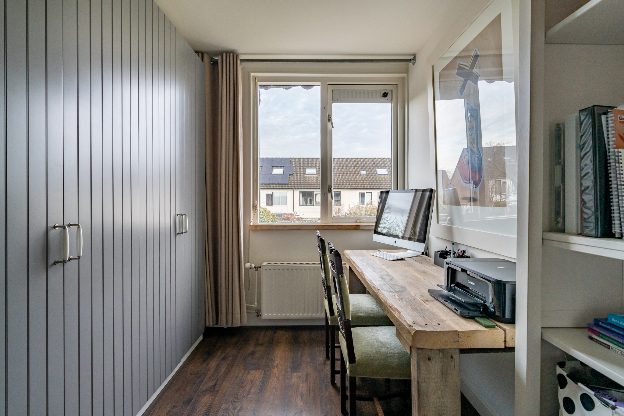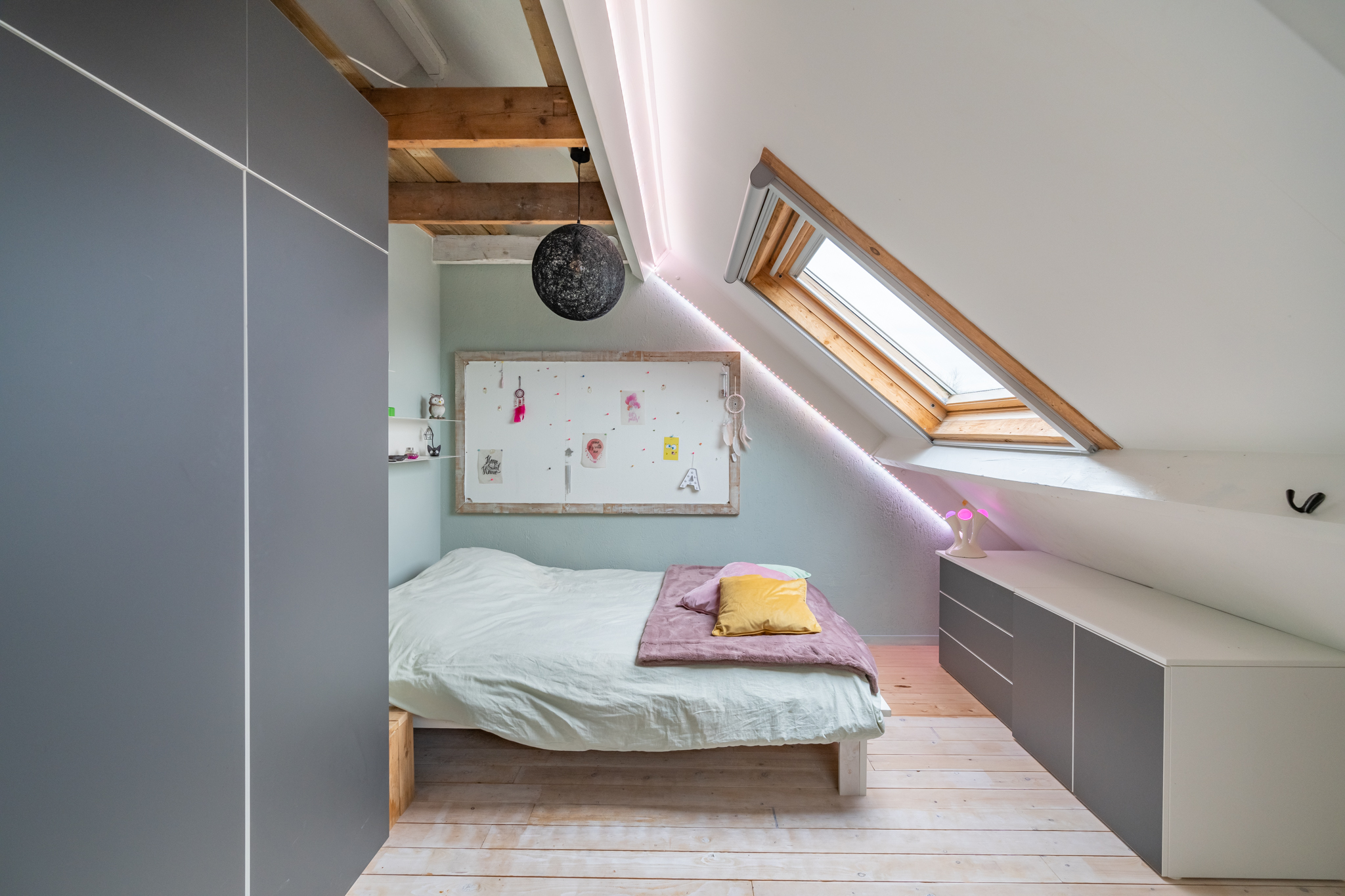 Overloop, 4e slaapkamer met vaste kast en Velux dakraam aan de voorzijde, 5e slaapkamer eveneens met dakraam en vaste kast aan de tuinzijde.