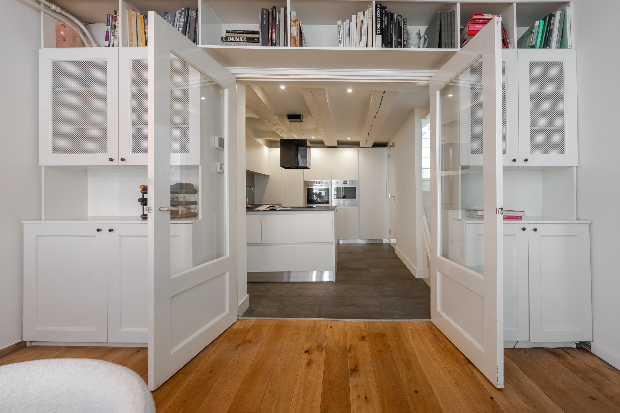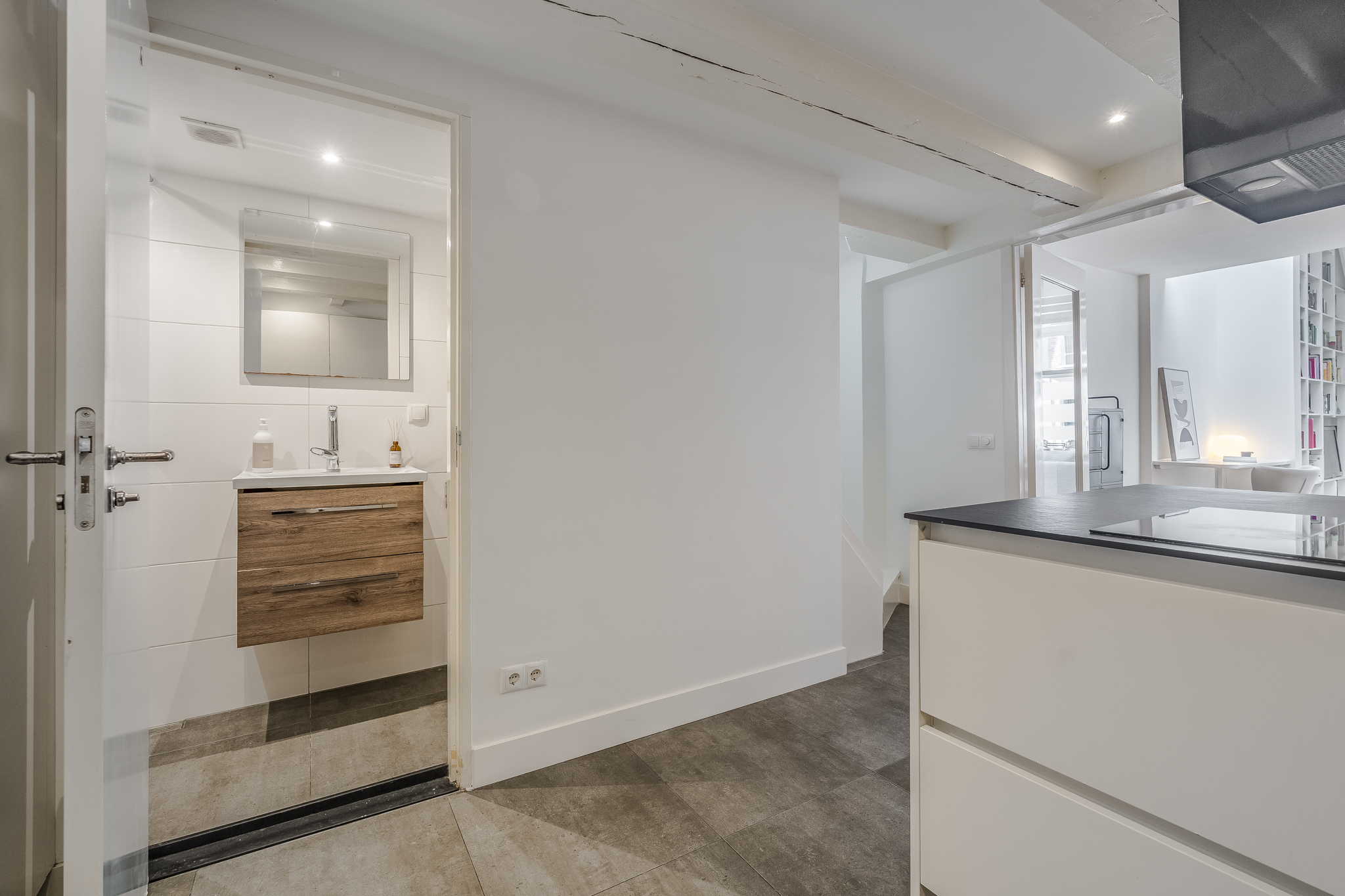 De woning beschikt over een charmante entree met grote raampartijen en een uitnodigend buitenbankje. Via de originele voordeur betreedt u het tochtportaal met ruime garderobekasten. De hoge plafonds (ca. 3,7 m) en daklichten geven de royale living (ca. 46 m²) een ruimtelijk karakter. De open keuken is volledig uitgerust met moderne voorzieningen. Op deze verdieping bevindt zich tevens een badkamer met inloopdouche, wastafel(meubel) en toilet.