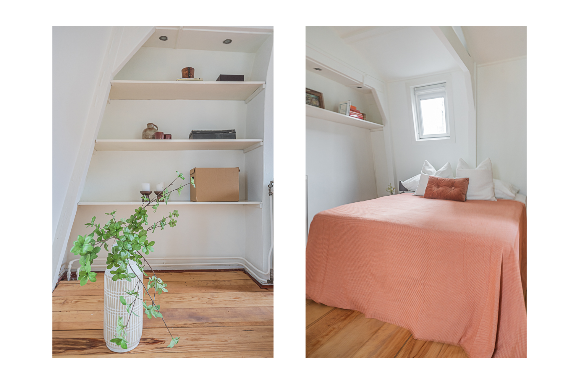 De derde verdieping beschikt over een royale overloop met wasmachine- en drogeraansluiting, grote kastenwand en biedt toegang tot twee ruime slaapkamers aan zowel de voor- als achterzijde van de woning. Tevens is hier een ruime vliering/berging gesitueerd.