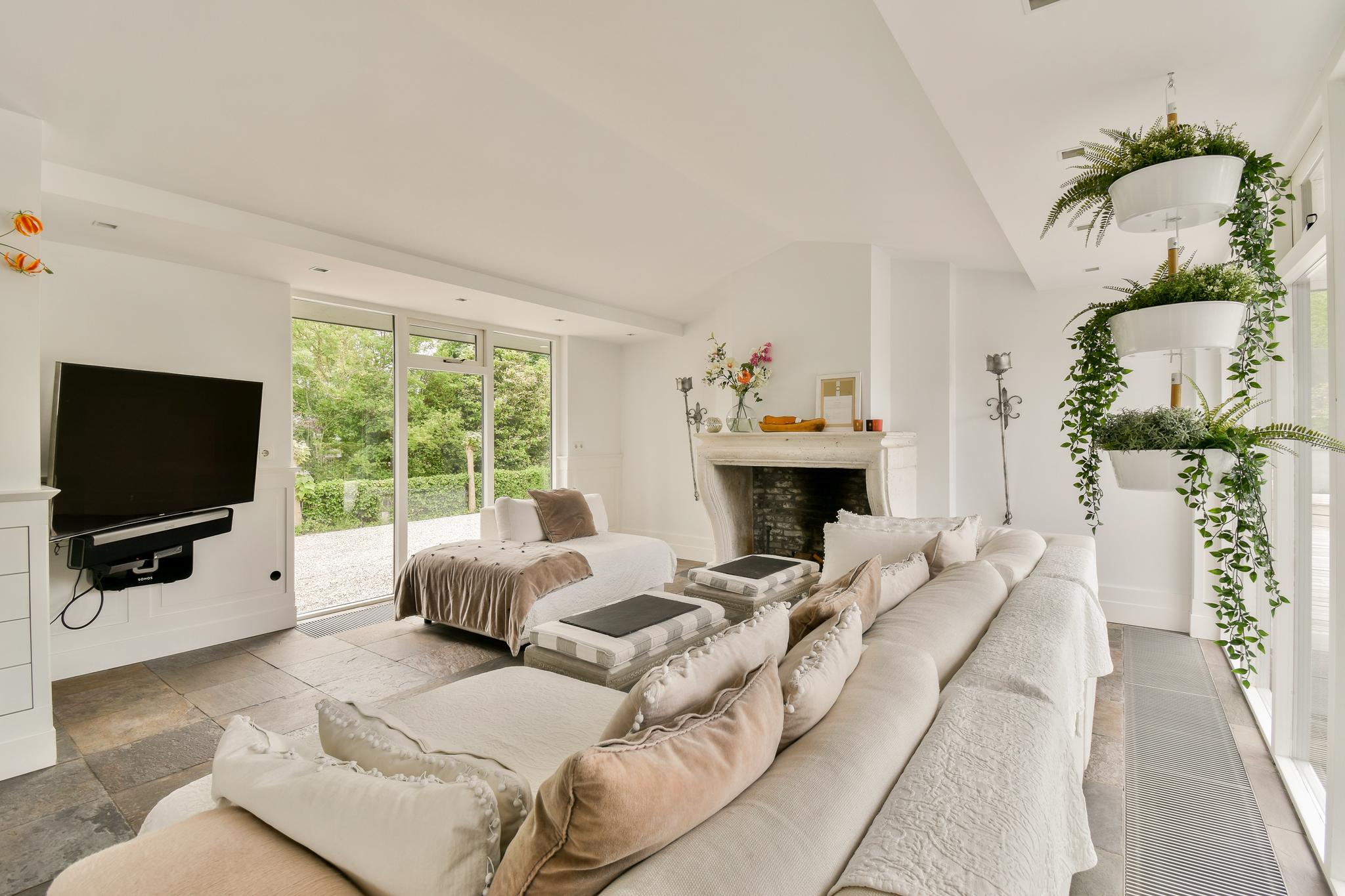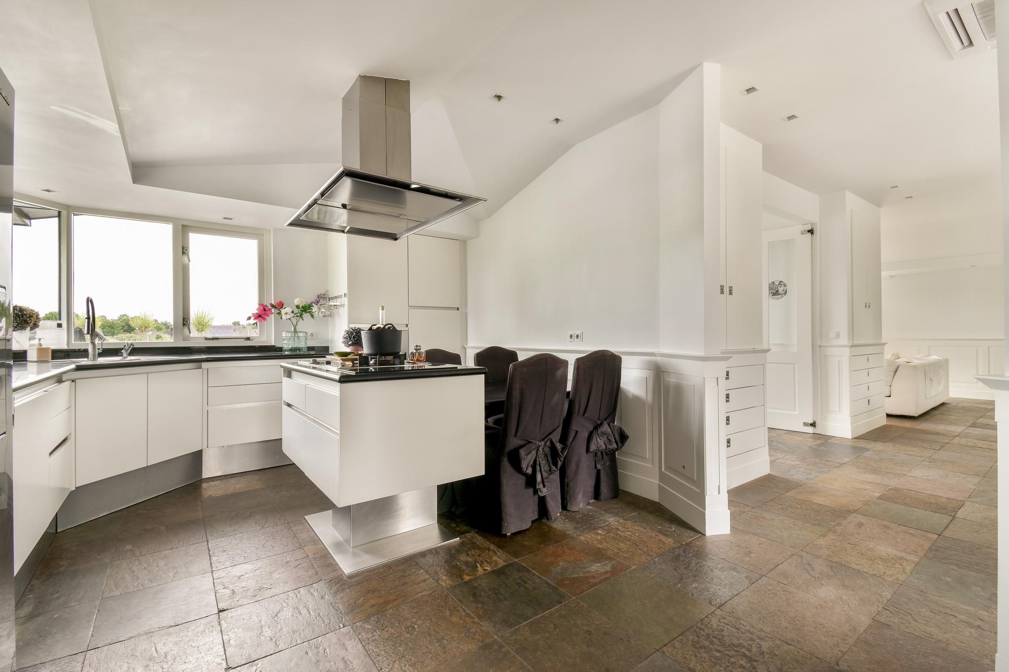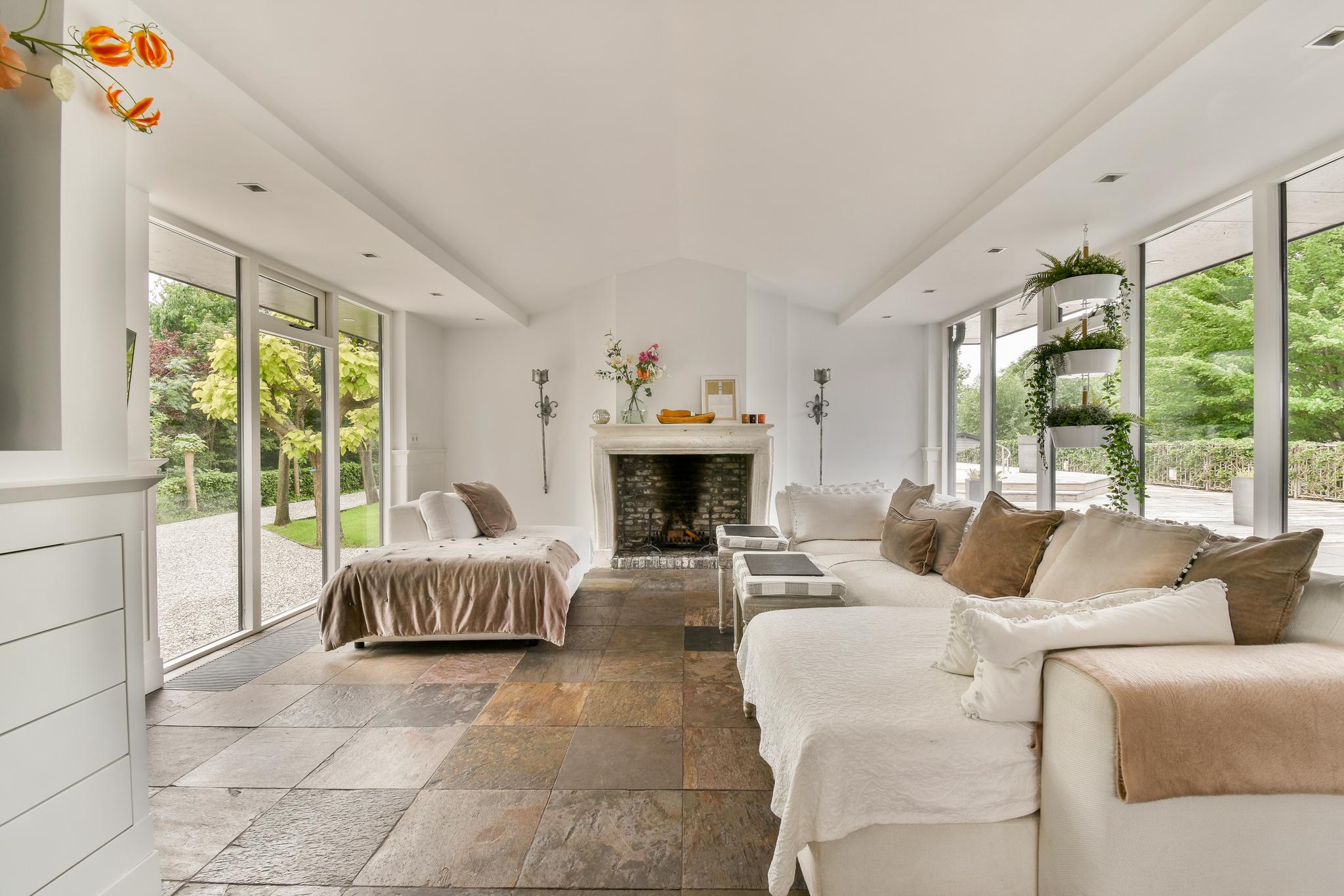 Via de ruime entree kom je in de grote lichte woonkamer met fraaie leistenen vloer, openhaard en diverse openslaande deuren naar het enorme terras. De grote raampartijen zorgen voor een veel lichtinval en een fenomenaal uitzicht!