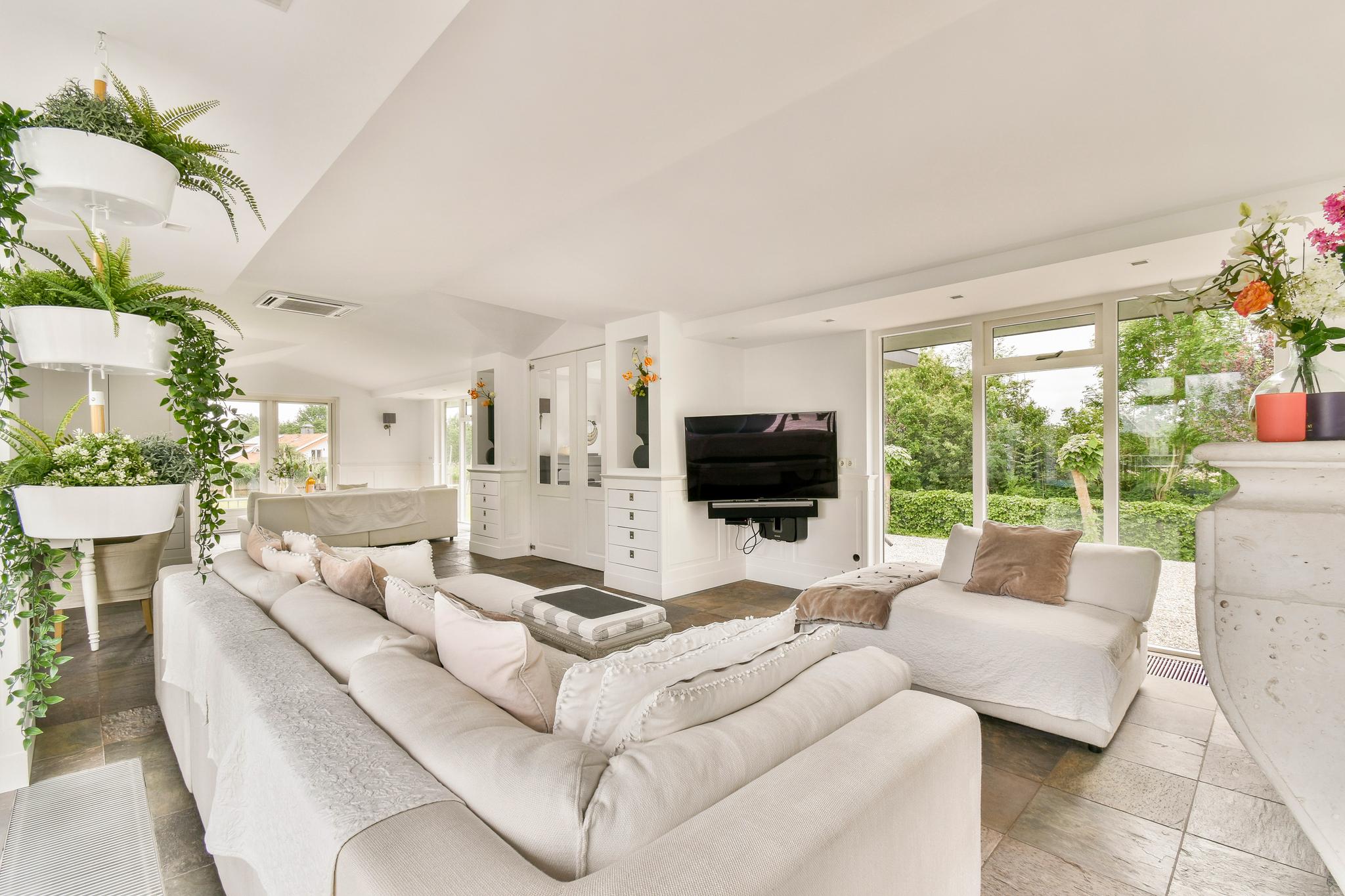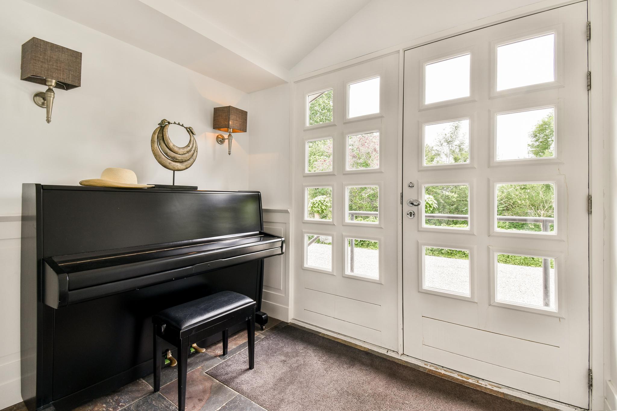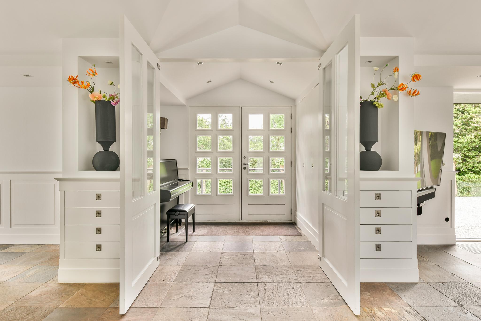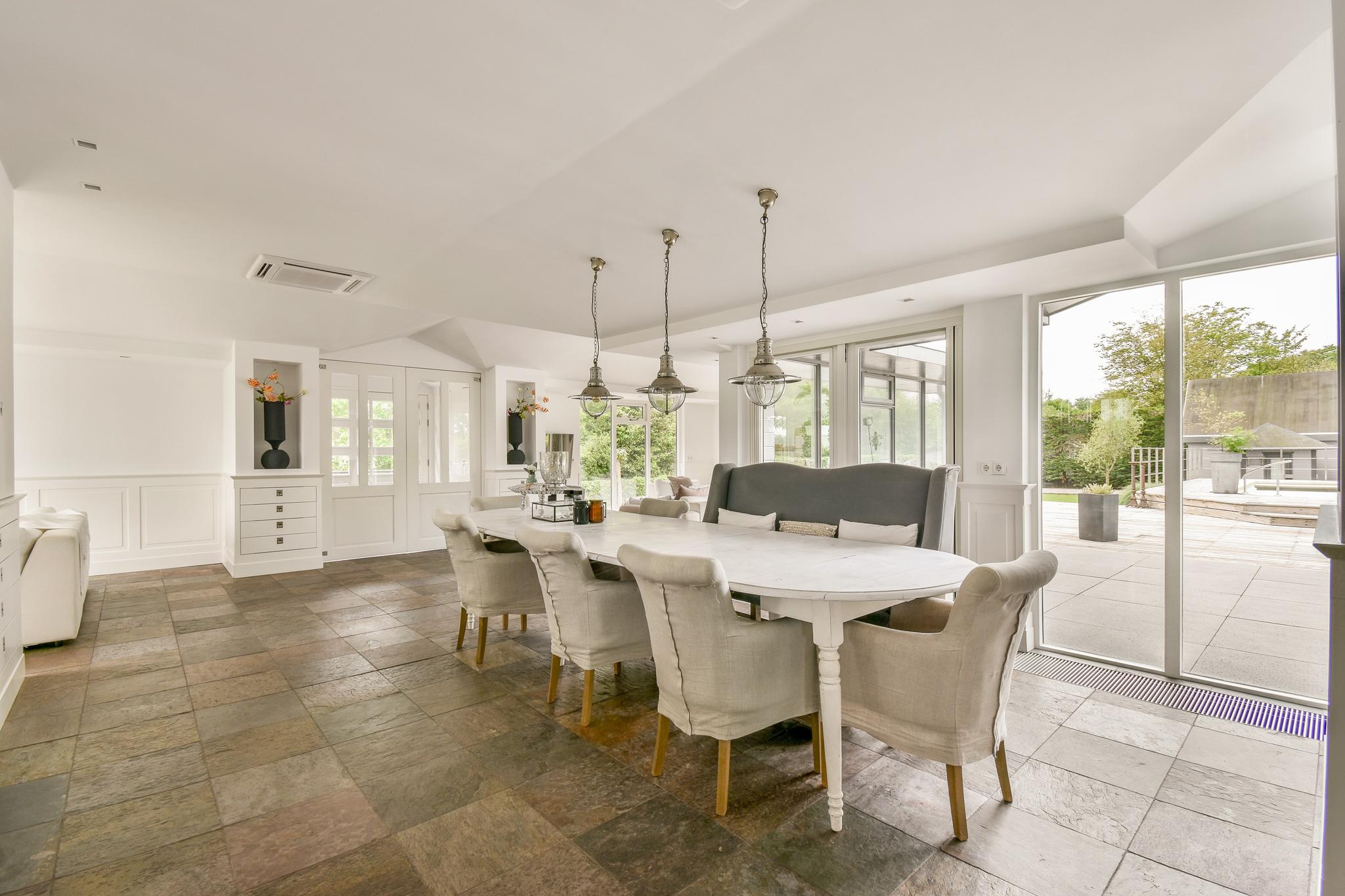 Via de ruime entree kom je in de grote lichte woonkamer met fraaie leistenen vloer, openhaard en diverse openslaande deuren naar het enorme terras. De grote raampartijen zorgen voor een veel lichtinval en een fenomenaal uitzicht!