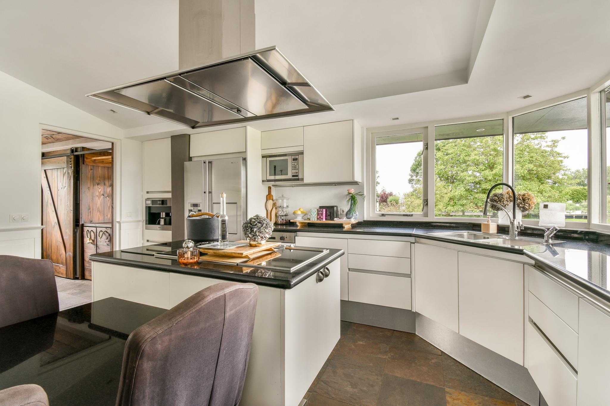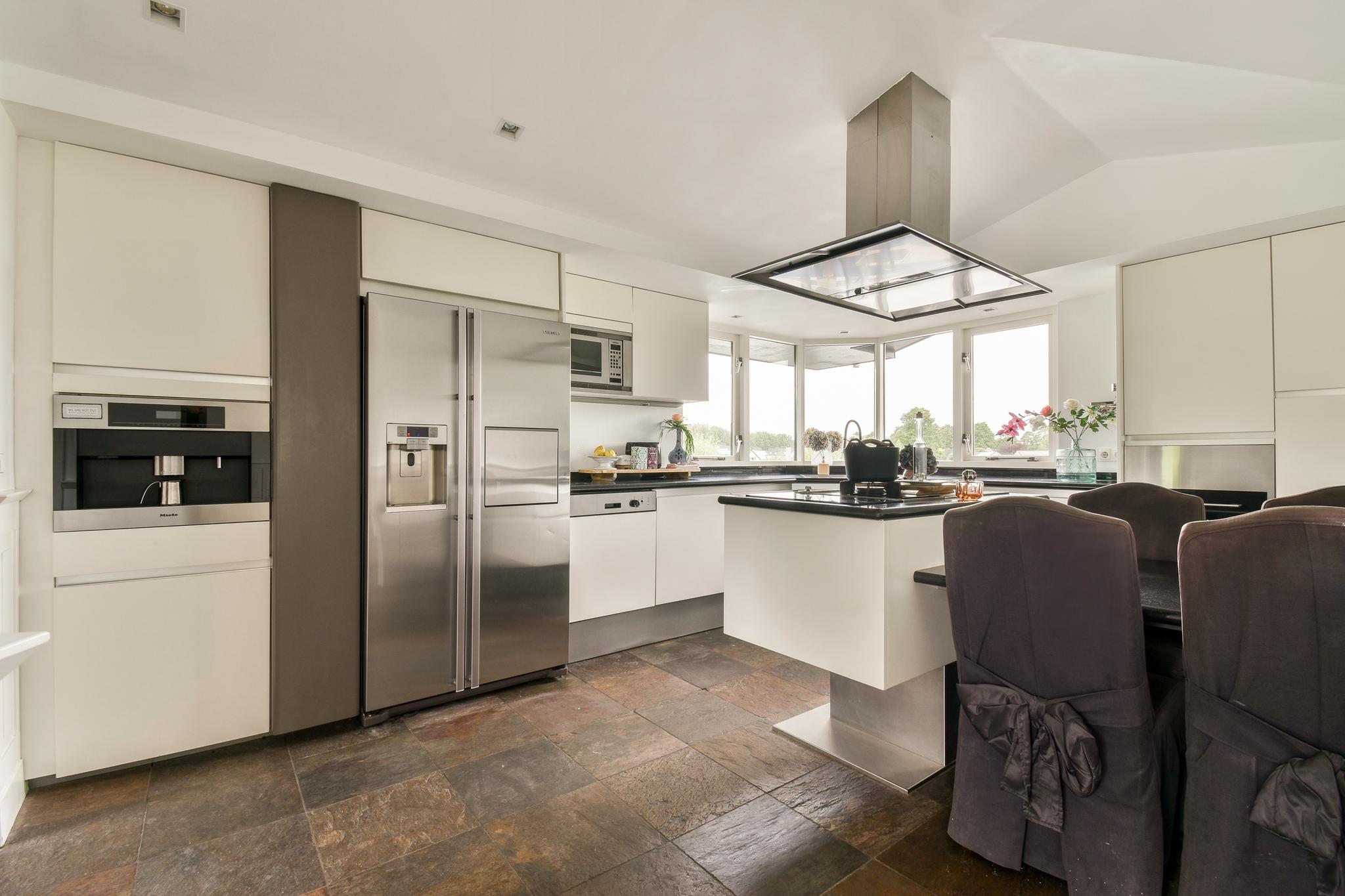 De woonkamer loopt door in de moderne, semi-open keuken met kookeiland, hier vind je alle denkbare apparatuur en ruimte voor de eettafel. Vanuit de keuken heb je toegang tot de bijkeuken met de aansluiting voor de was apparatuur, opstelling van de CV-ketel en een achterdeur naar het terras.