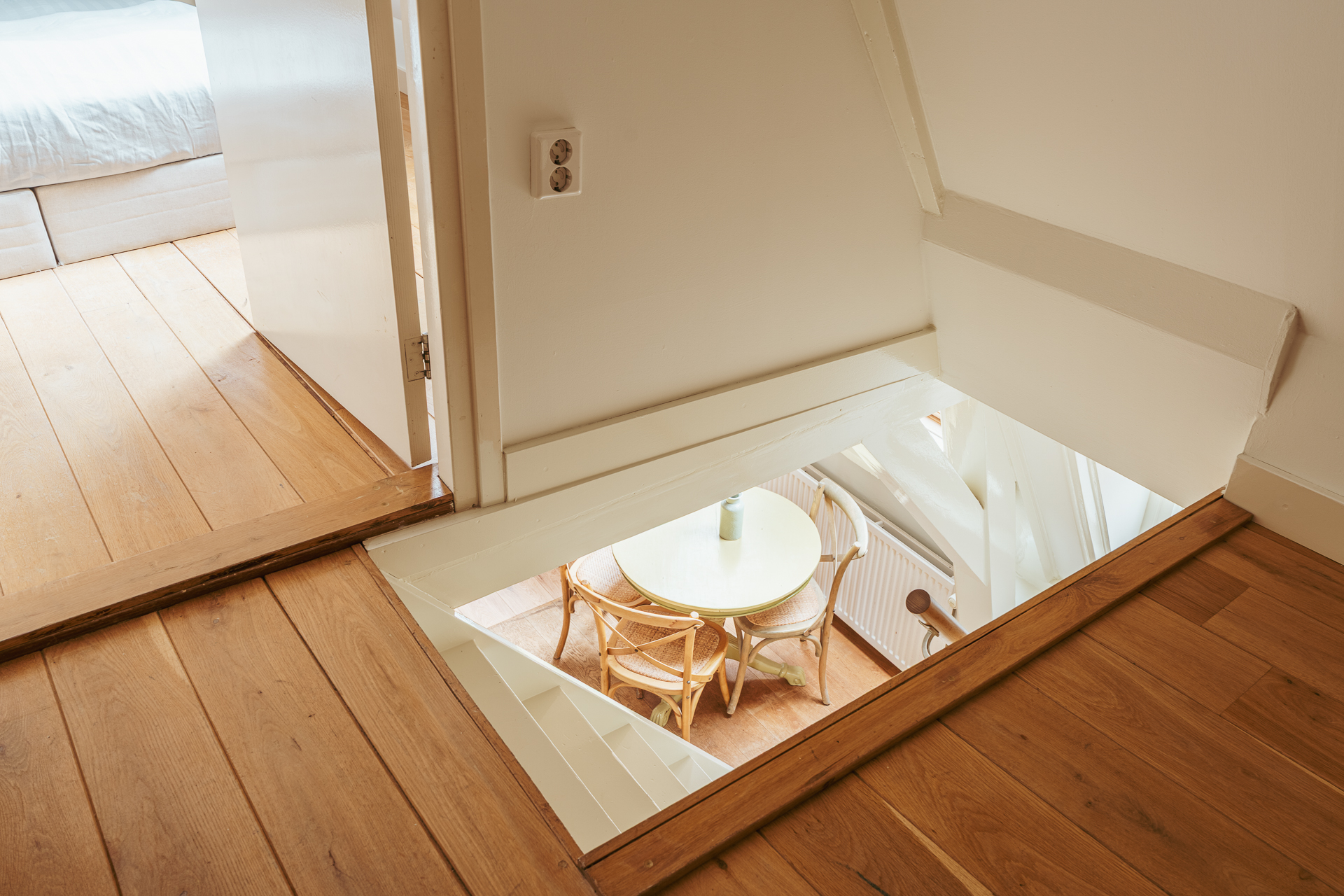 De vierde slaapkamer bevindt zich op de derde verdieping van het grachtenpand. Hier zijn eveneens een woonkamer met een compacte keuken en de badkamer met wastafel, wc en een ligbad te vinden. Vanuit hier is met een vaste trap de vierde verdieping te bereiken, waar een ruime berging met cv-ketel en de vijfde slaapkamer zijn gelegen.