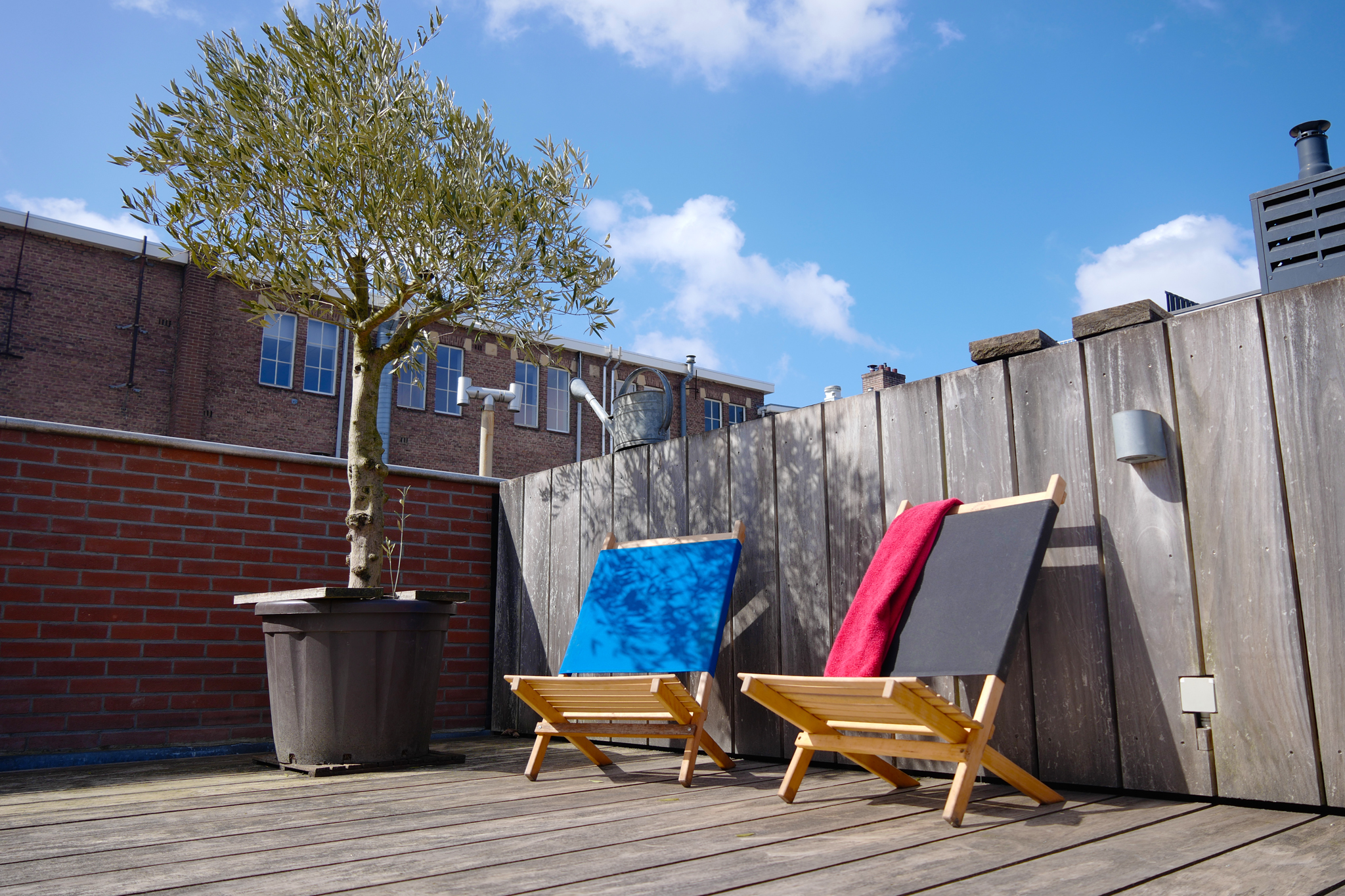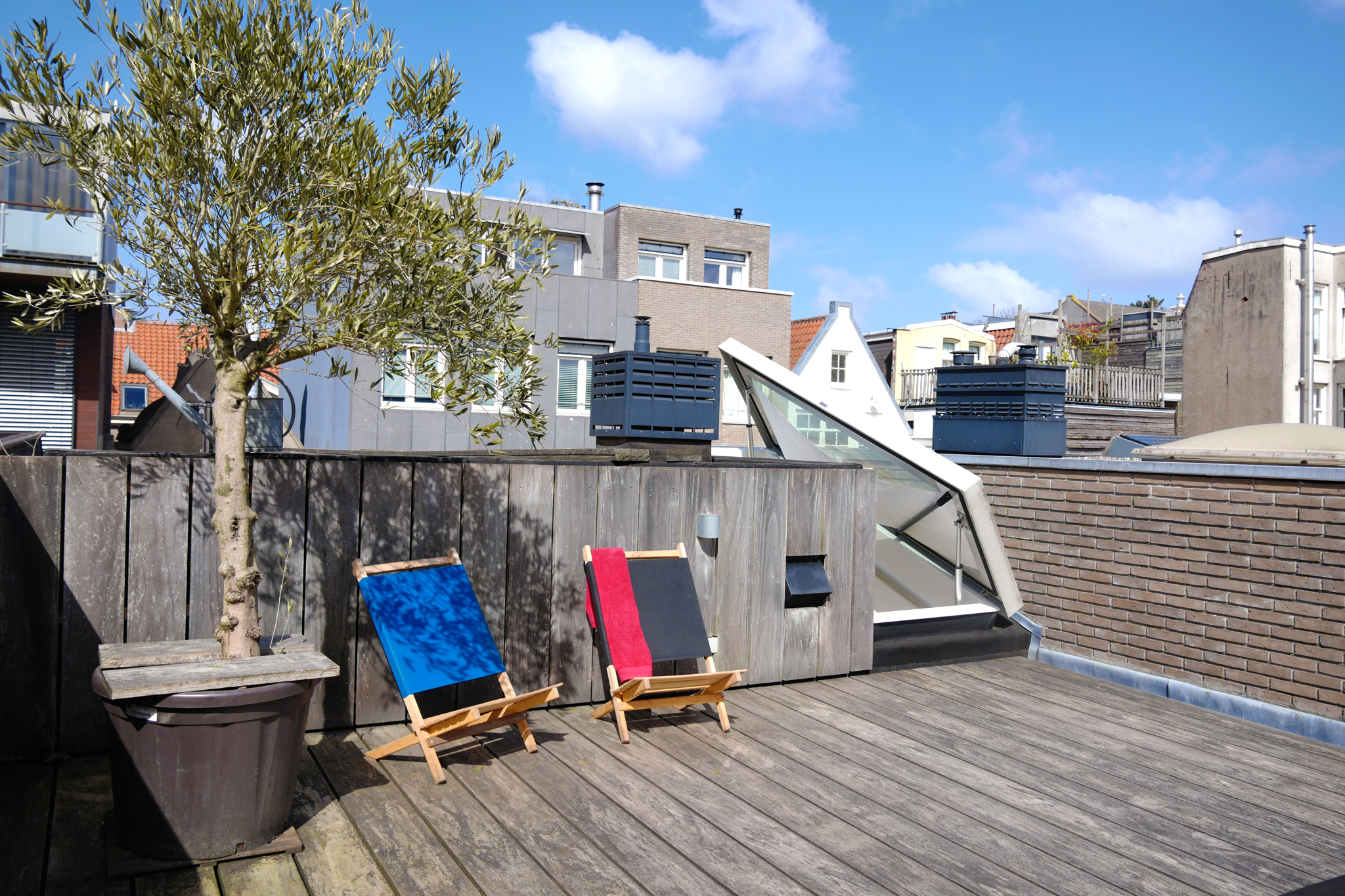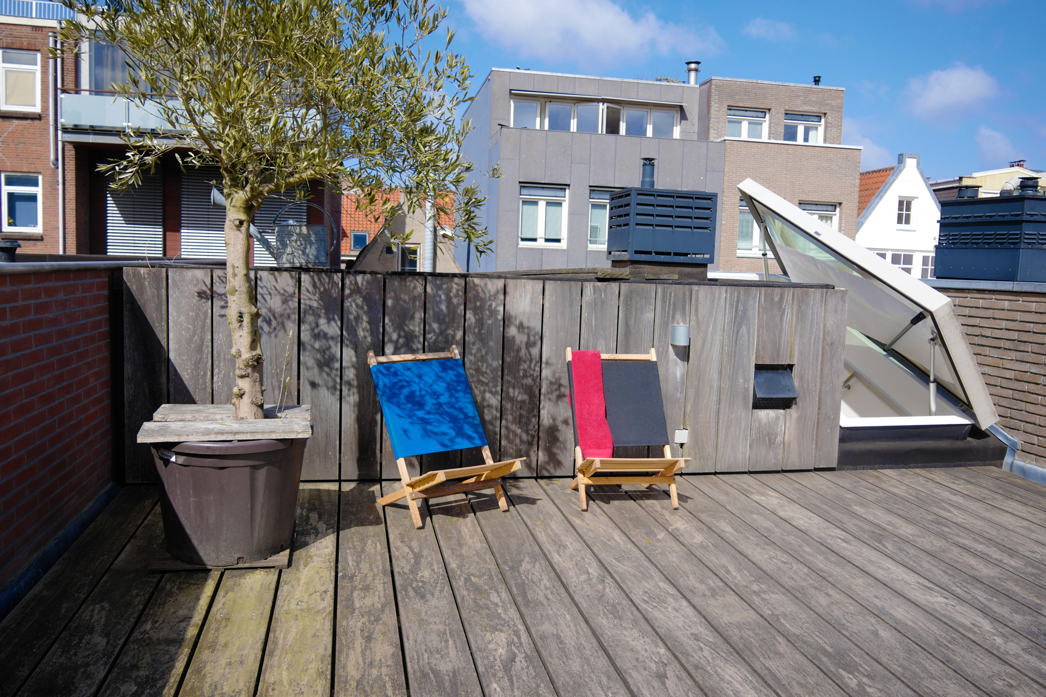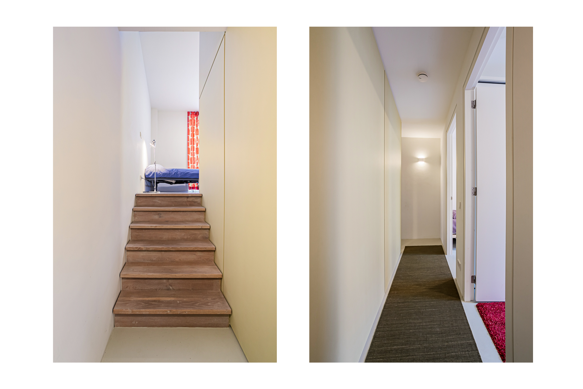 Op de tweede verdieping bevinden zich twee slaapkamers, welke door middel van de harmonica tussenwand gemakkelijk als één grotere slaapkamer te gebruiken is. De badkamer is voorzien van een wastafelmeubel, regendouche, ligbad en toilet. De master bedroom is gelegen op de derde verdieping, voorzien van veel bergruimte en een vaste trap naar het elektrisch bedienbare dakluik dat naar het heerlijk ruime dakterras leidt. Langs de achterkant van het huis ligt een strook kiezelstenen. Deze strook geeft de mogelijkheid voor het plaatsen van planten.