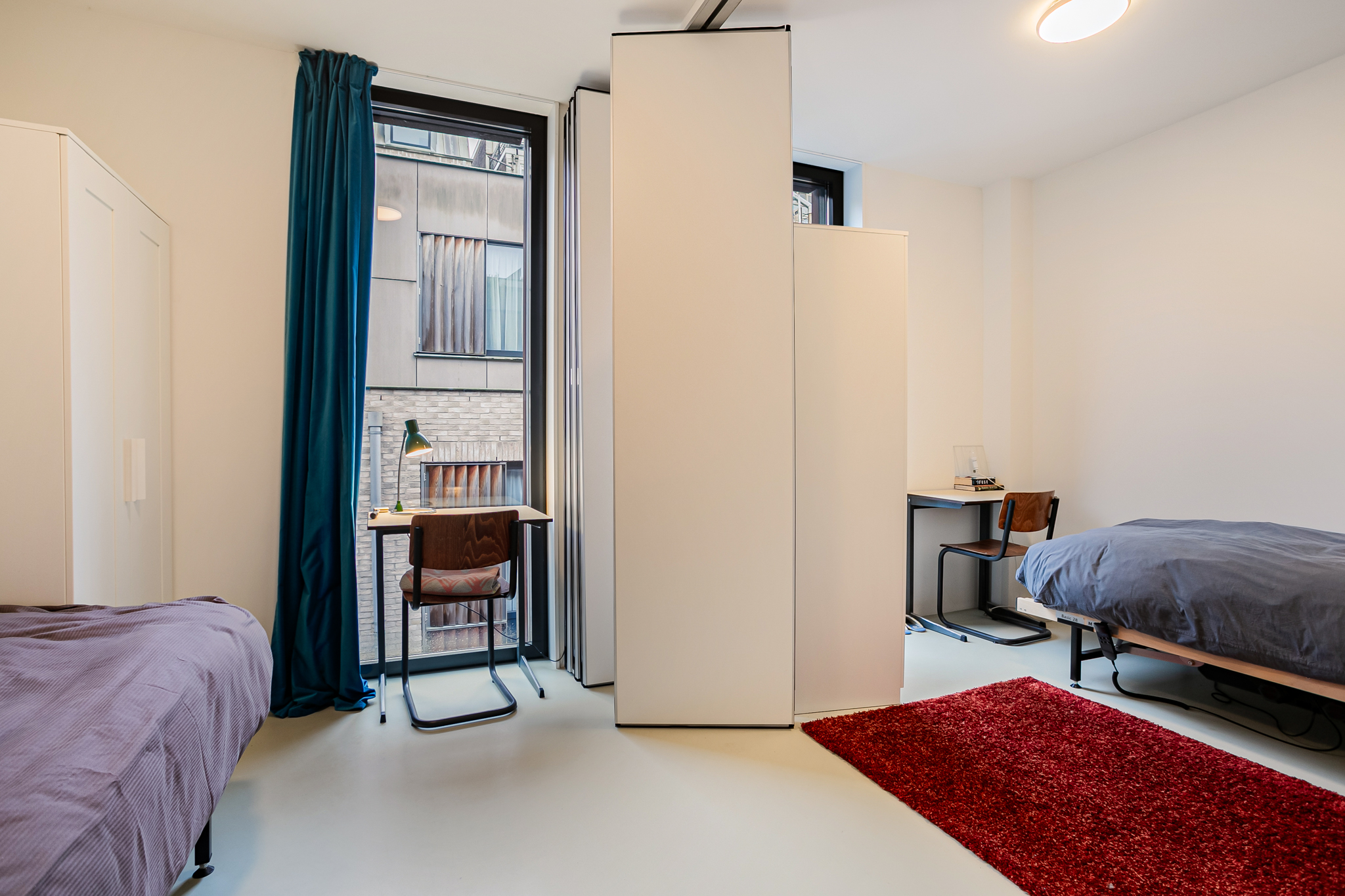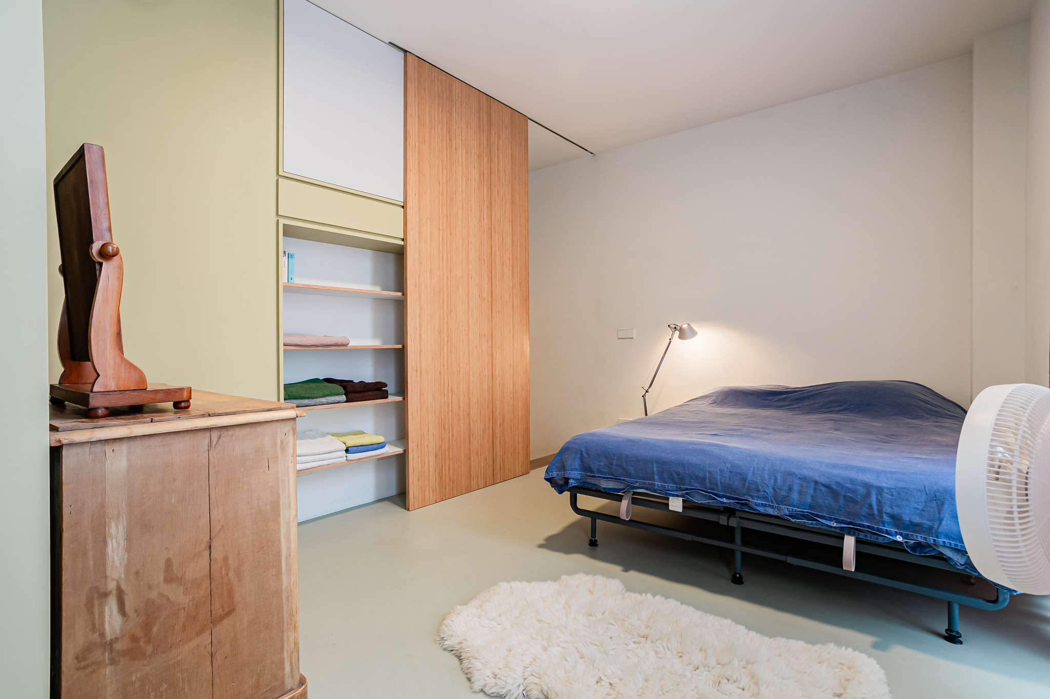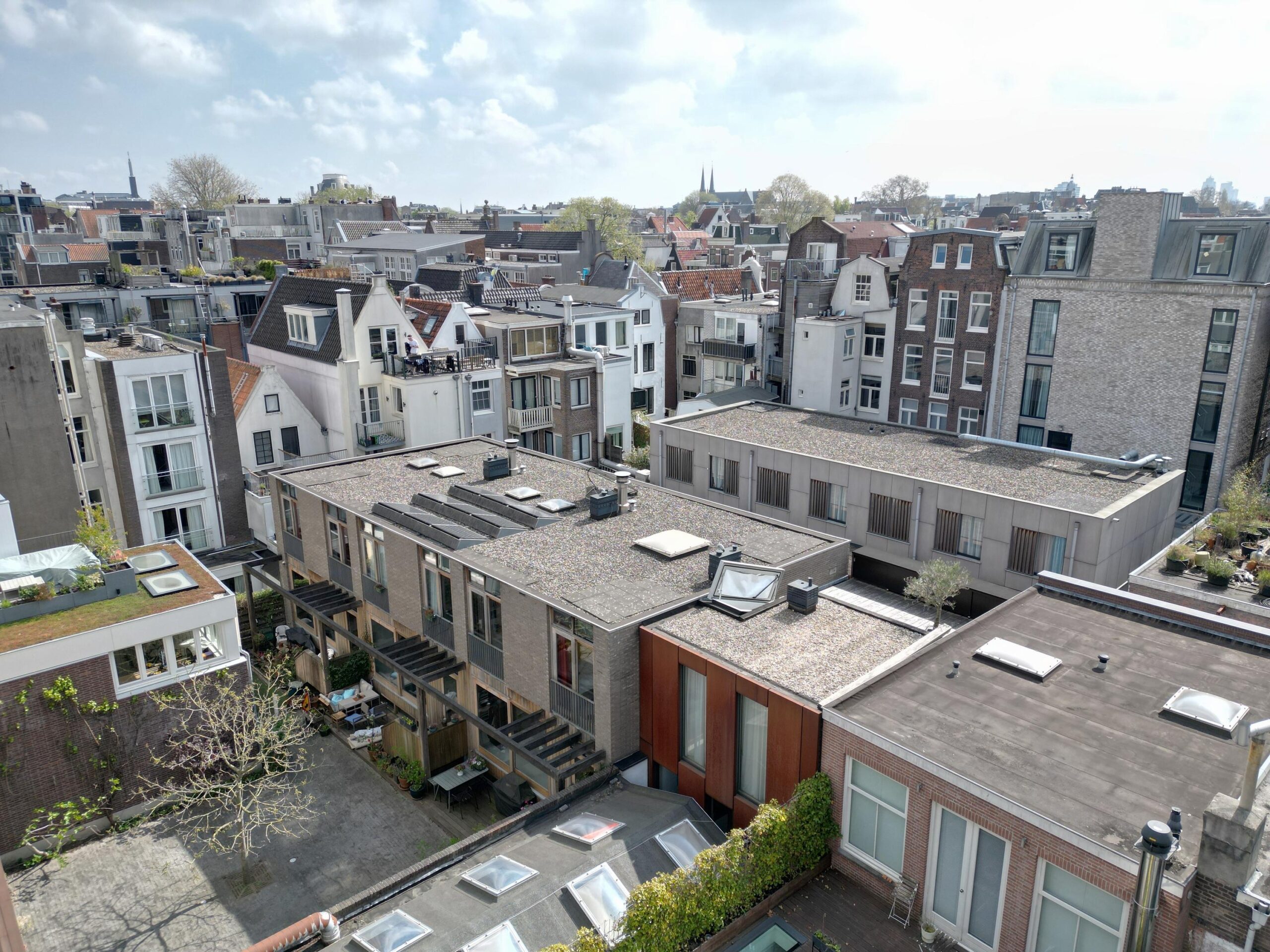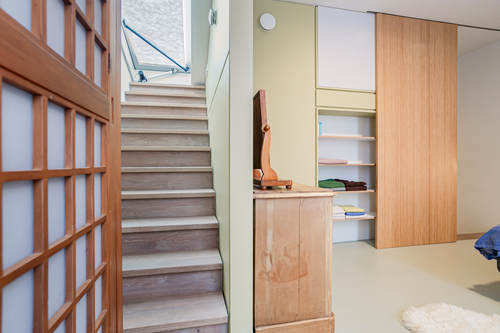 Op de tweede verdieping bevinden zich twee slaapkamers, welke door middel van de harmonica tussenwand gemakkelijk als één grotere slaapkamer te gebruiken is. De badkamer is voorzien van een wastafelmeubel, regendouche, ligbad en toilet. De master bedroom is gelegen op de derde verdieping, voorzien van veel bergruimte en een vaste trap naar het elektrisch bedienbare dakluik dat naar het heerlijk ruime dakterras leidt. Langs de achterkant van het huis ligt een strook kiezelstenen. Deze strook geeft de mogelijkheid voor het plaatsen van planten.