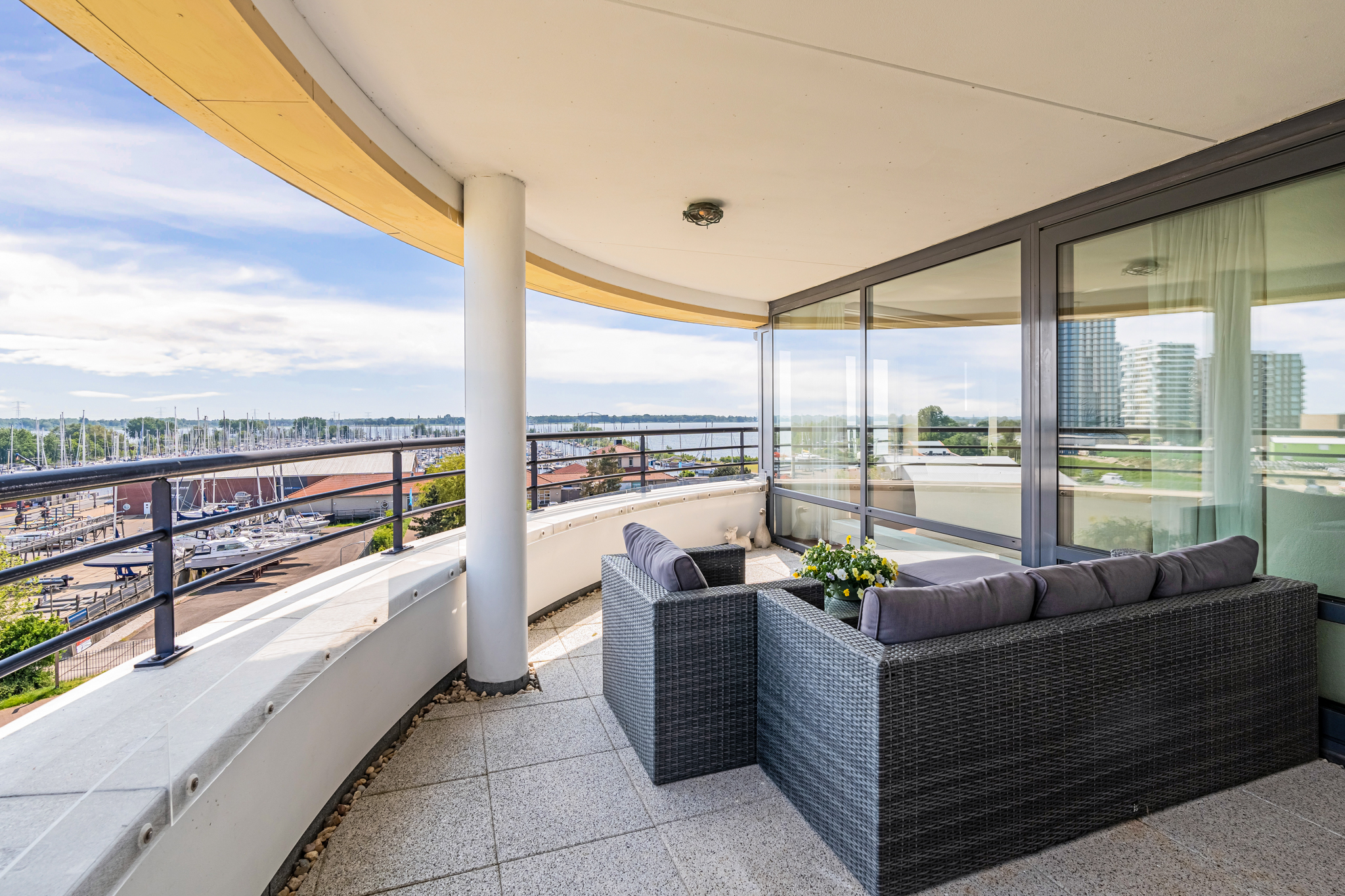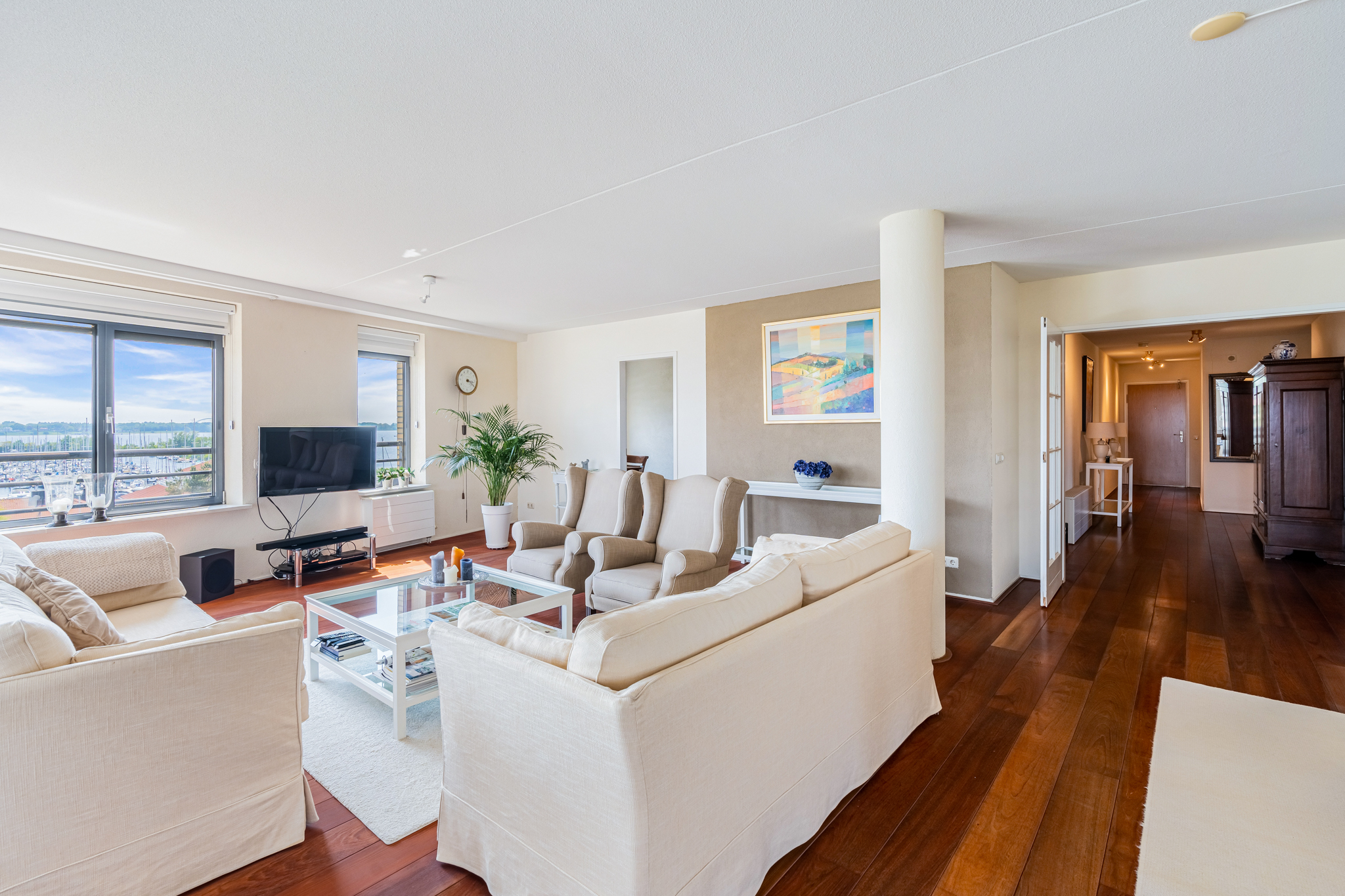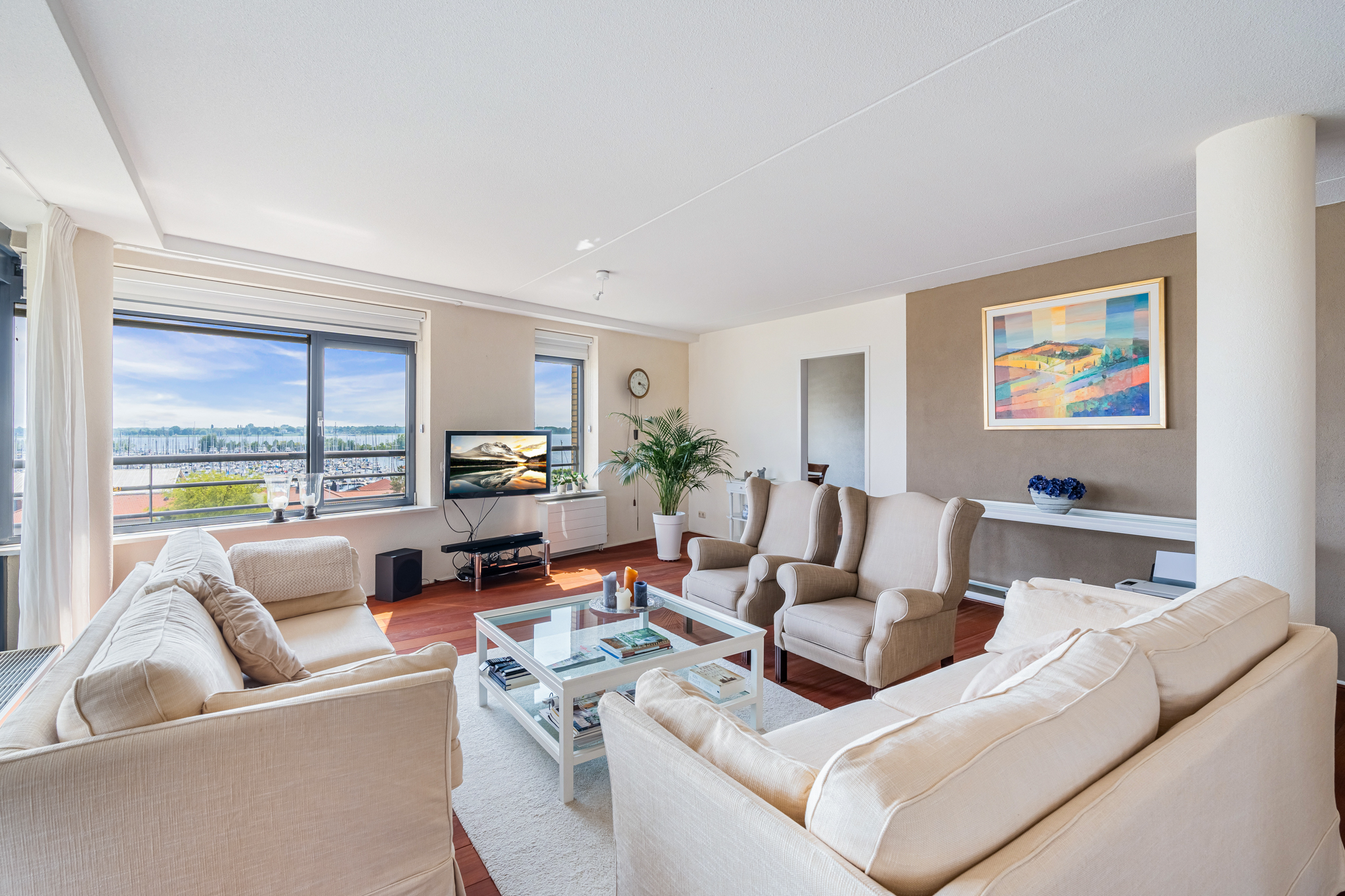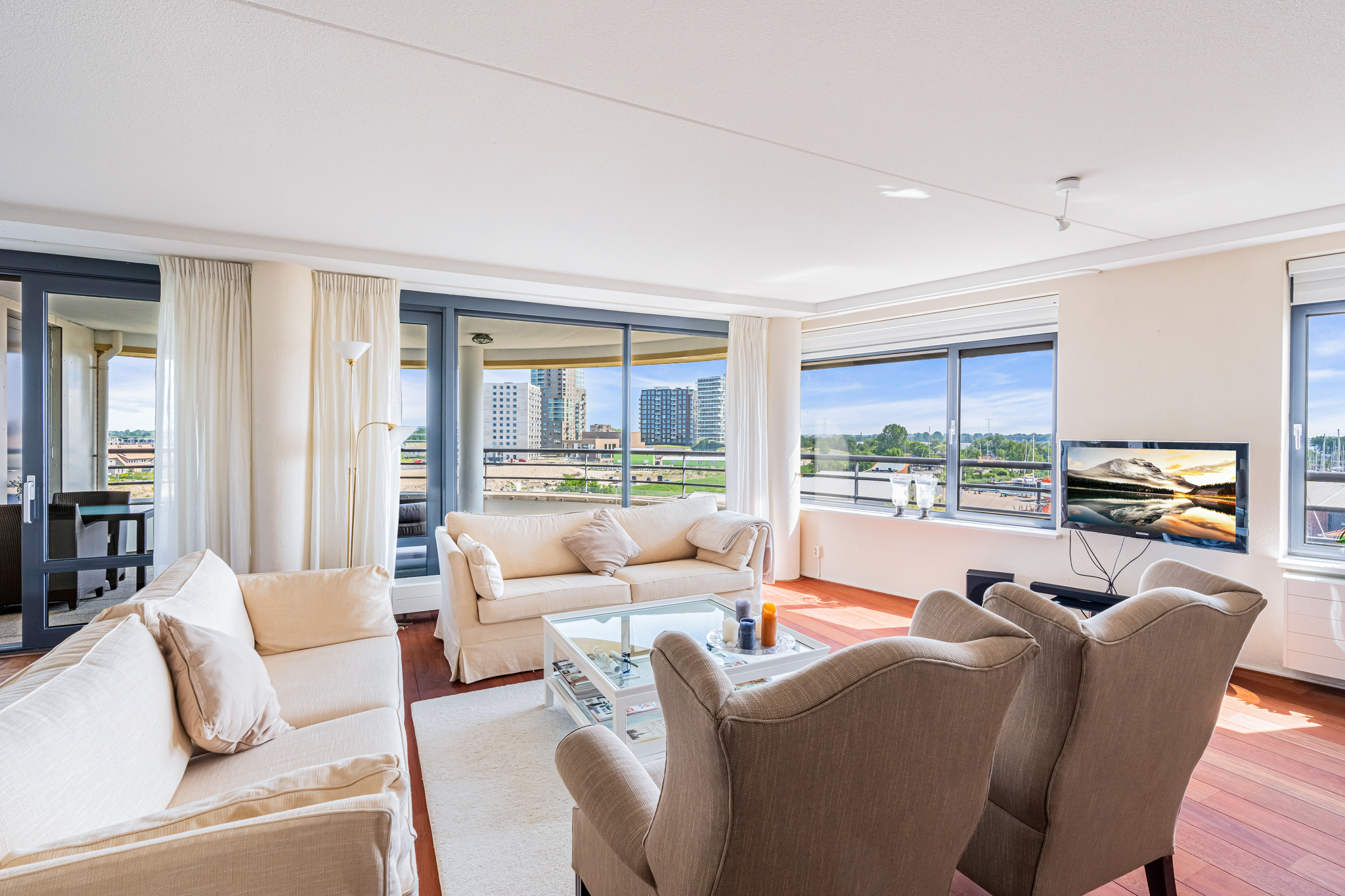 • zeer ruime, lichte, L-vormige living met schuifpui naar terras; met panoramisch uitzicht over de jachthaven