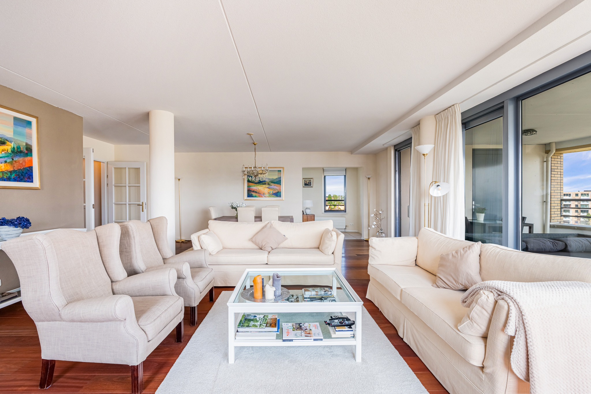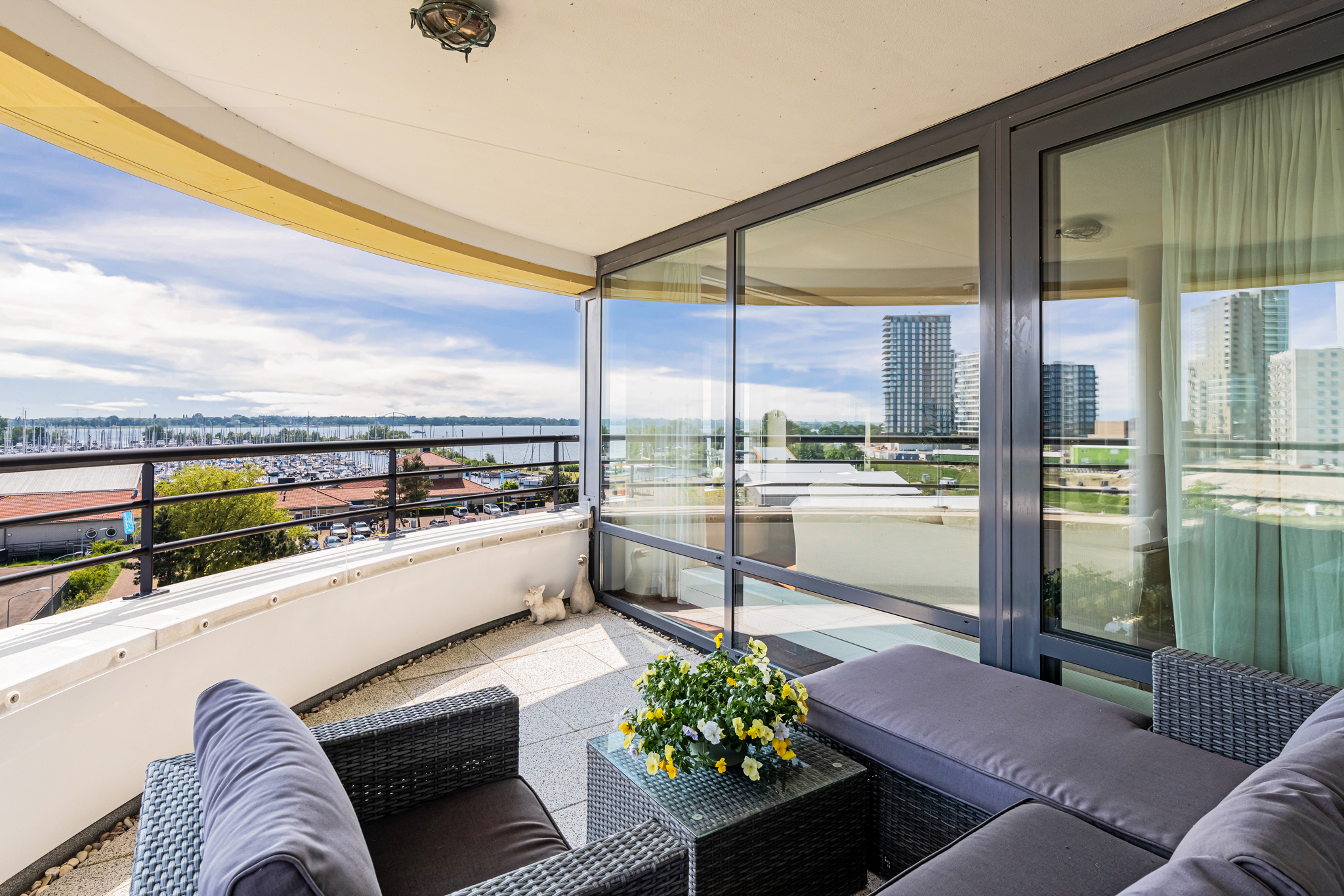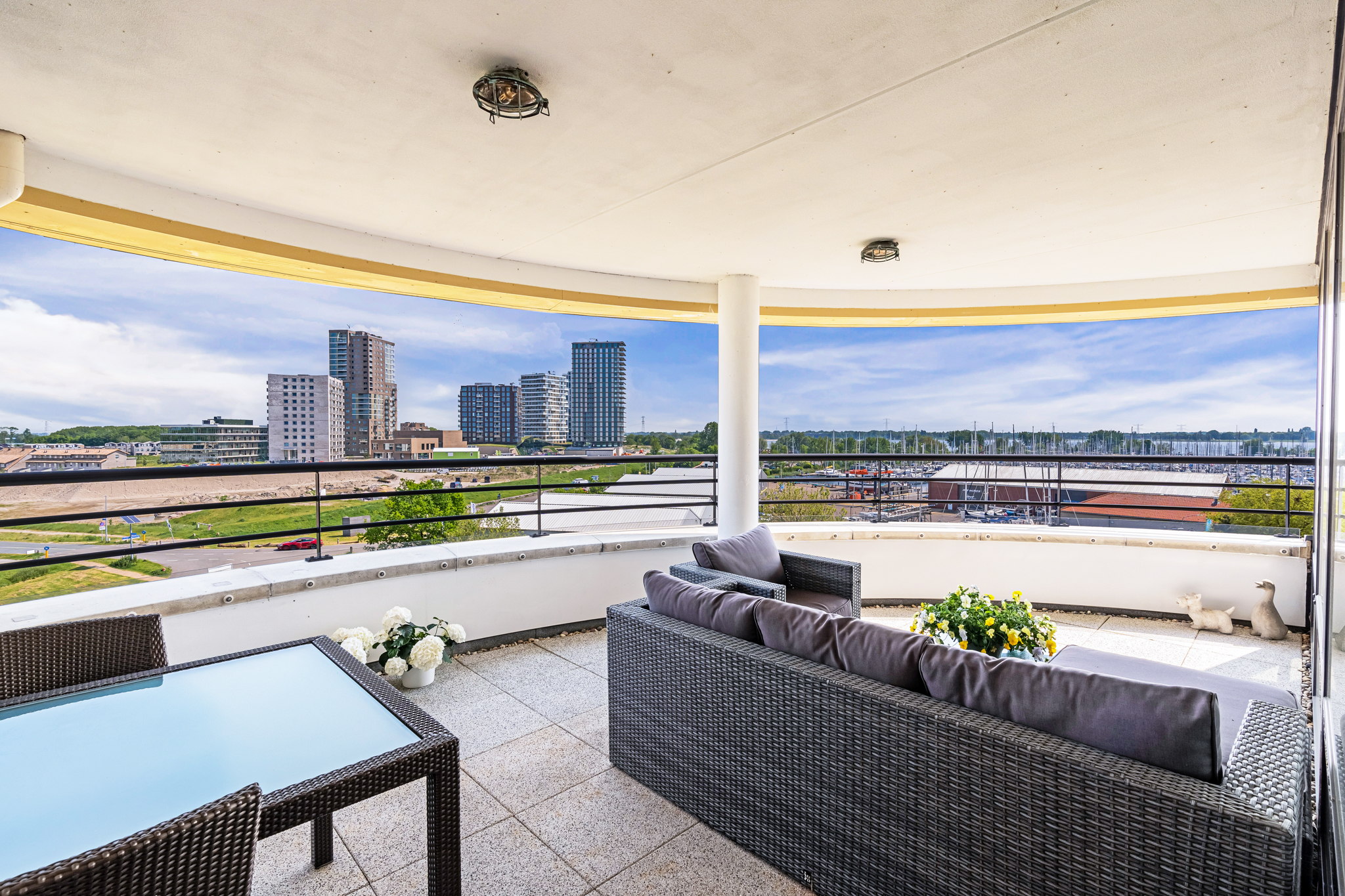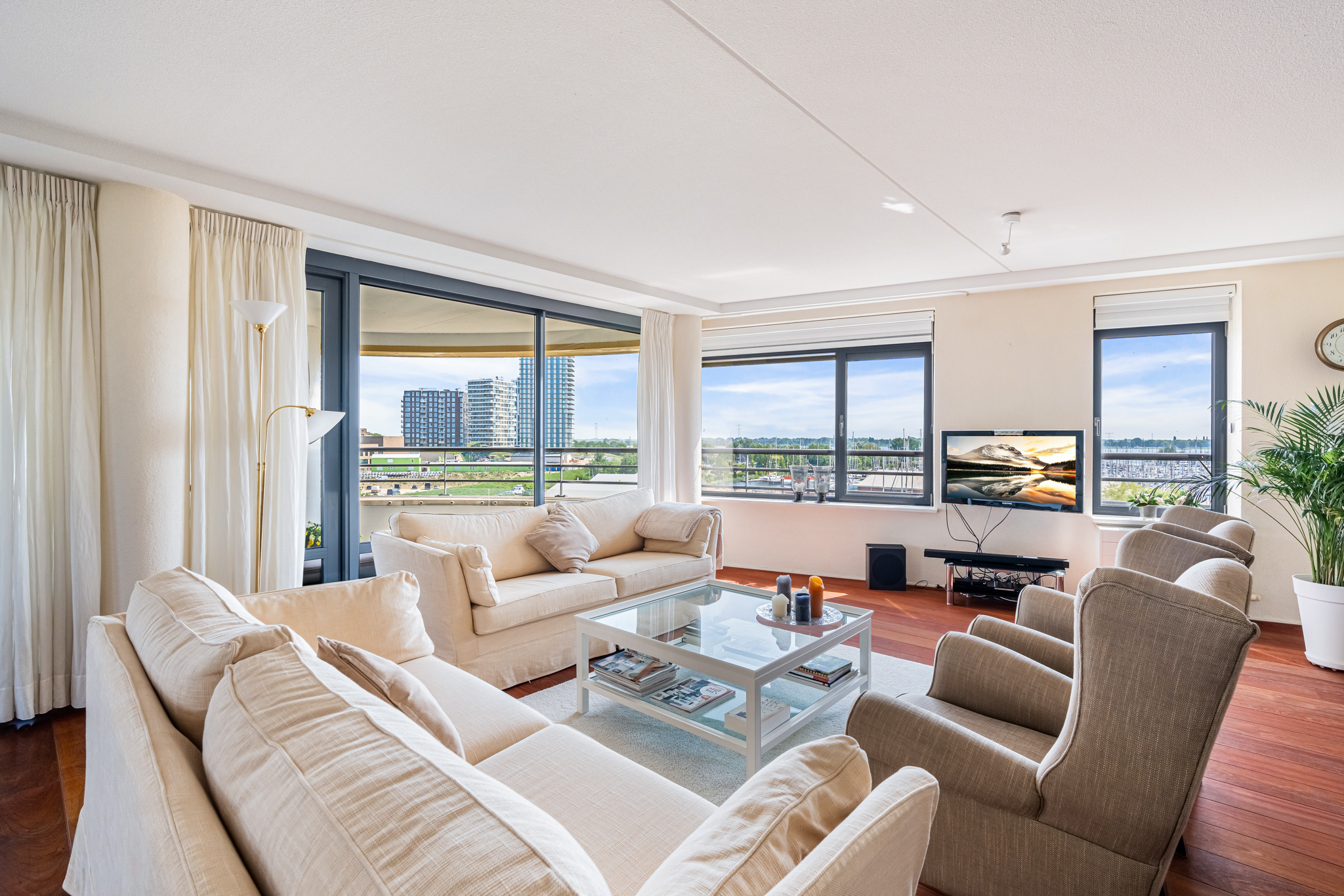 • zeer ruime, lichte, L-vormige living met schuifpui naar terras; met panoramisch uitzicht over de jachthaven