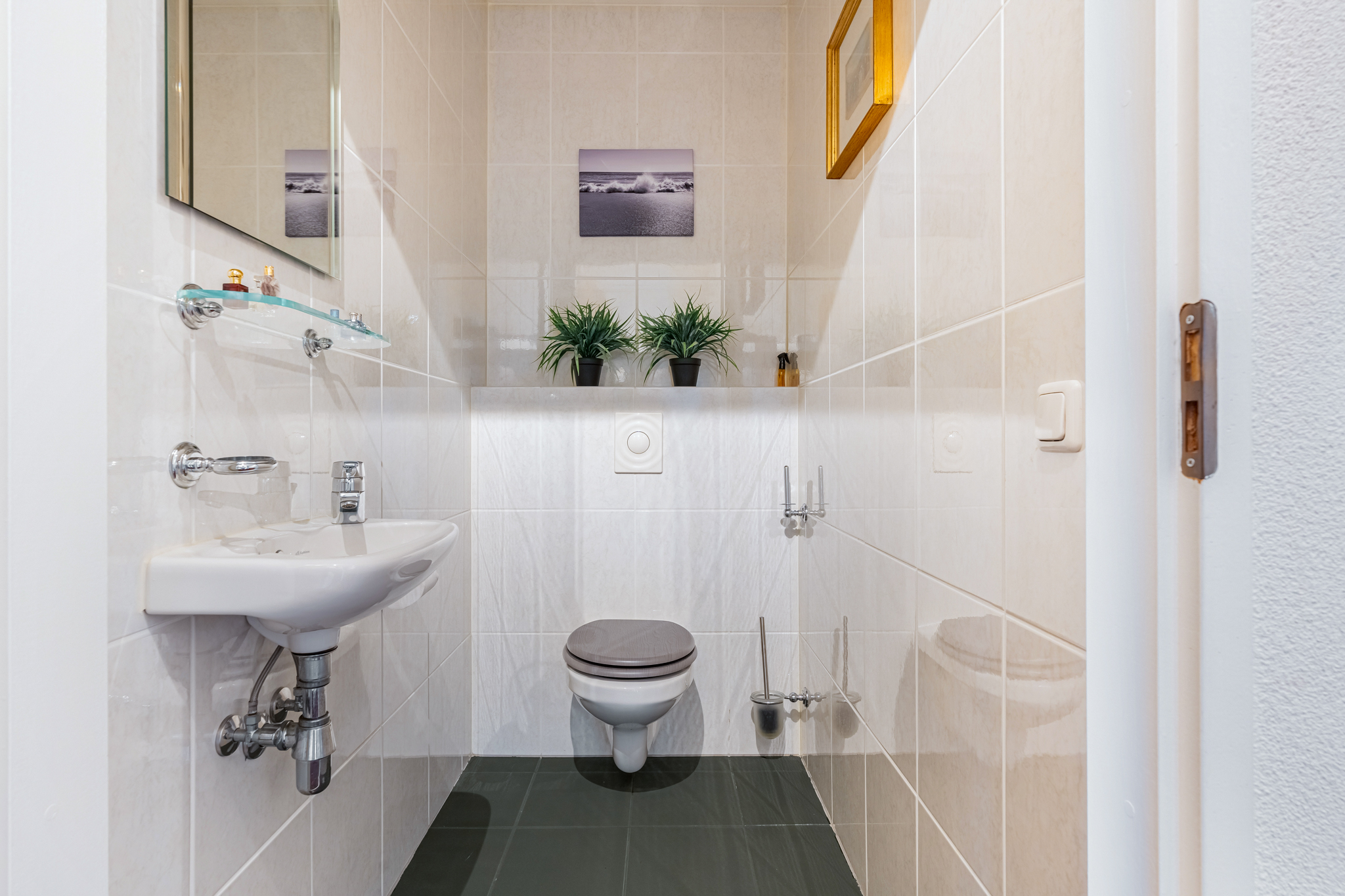 • royale hal met garderobe, toilet met fonteintje en openslaande deur met roedeverdeling;