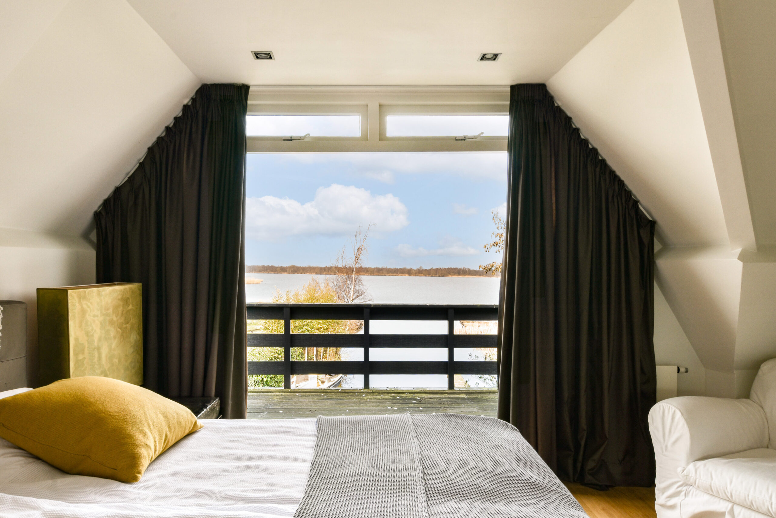 De eerste verdieping wordt betreden op de ruime overloop met veel lichtinval. De slaapkamer aan de voorzijde is voorzien van een op maat gemaakte schuifkast. De masterbedroom bestond voorheen uit twee slaapkamers, maar bestaat nu uit een slaapkamer met kleedruimte en beschikt over openslaande deuren naar het balkon, waar wederom van het fanatische uitzicht over de Vuntusplas genoten kan worden. De derde kamer wordt momenteel als wasruimte gebruikt, maar is goed als slaapkamer te gebruiken. De luxe badkamer is voorzien van inloopdouche, ligbad/jacuzzi, toilet en wastafelmeubel. Daarnaast beschikt deze villa nog over een zolderverdieping voor het opbergen van de spullen die niet voor dagelijks gebruik zijn.