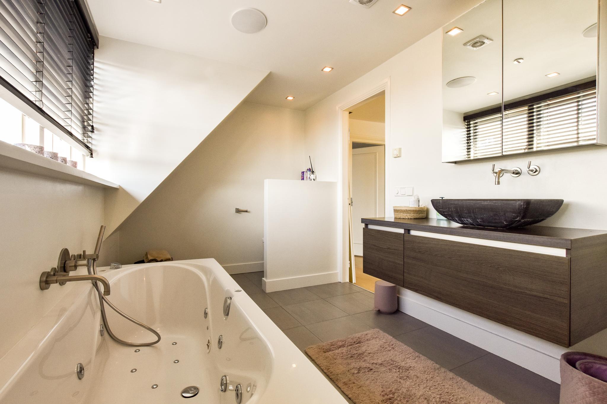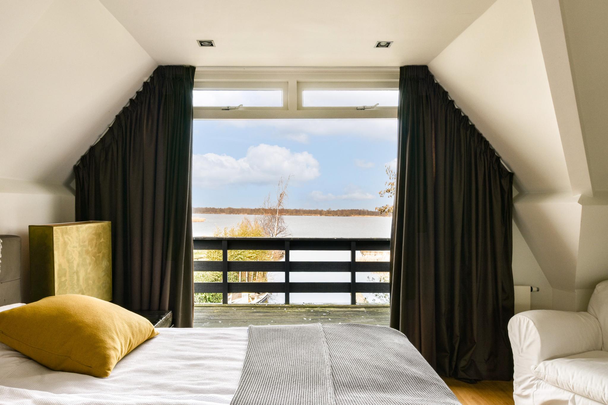De eerste verdieping wordt betreden op de ruime overloop met veel lichtinval. De slaapkamer aan de voorzijde is voorzien van een op maat gemaakte schuifkast. De masterbedroom bestond voorheen uit twee slaapkamers, maar bestaat nu uit een slaapkamer met kleedruimte en beschikt over openslaande deuren naar het balkon, waar wederom van het fanatische uitzicht over de Vuntusplas genoten kan worden. De derde kamer wordt momenteel als wasruimte gebruikt, maar is goed als slaapkamer te gebruiken. De luxe badkamer is voorzien van inloopdouche, ligbad/jacuzzi, toilet en wastafelmeubel. Daarnaast beschikt deze villa nog over een zolderverdieping voor het opbergen van de spullen die niet voor dagelijks gebruik zijn.