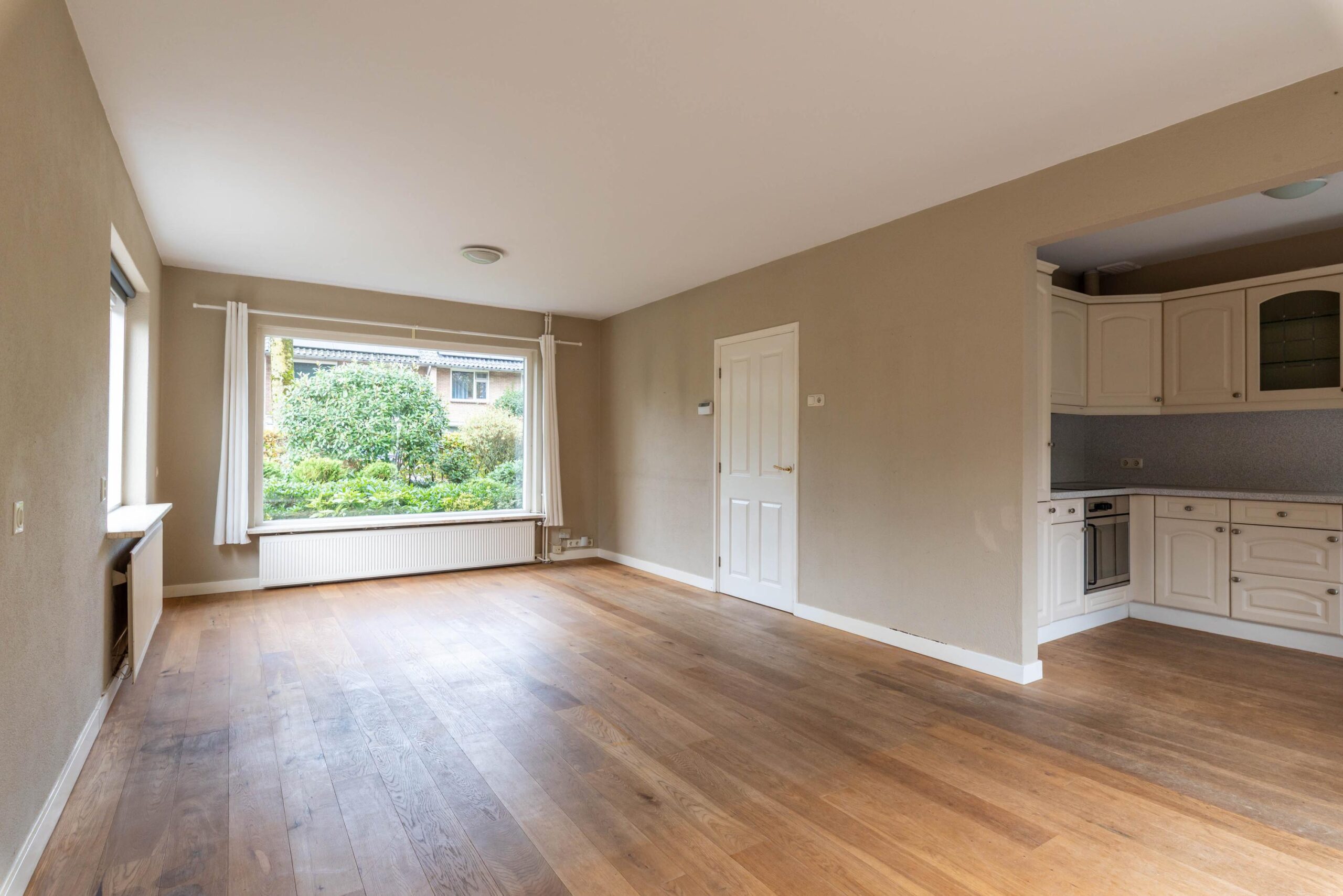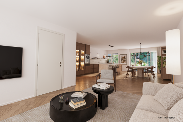 De lichte woonkamer is voorzien van dezelfde stijlvolle eiken vloer en een open keuken.