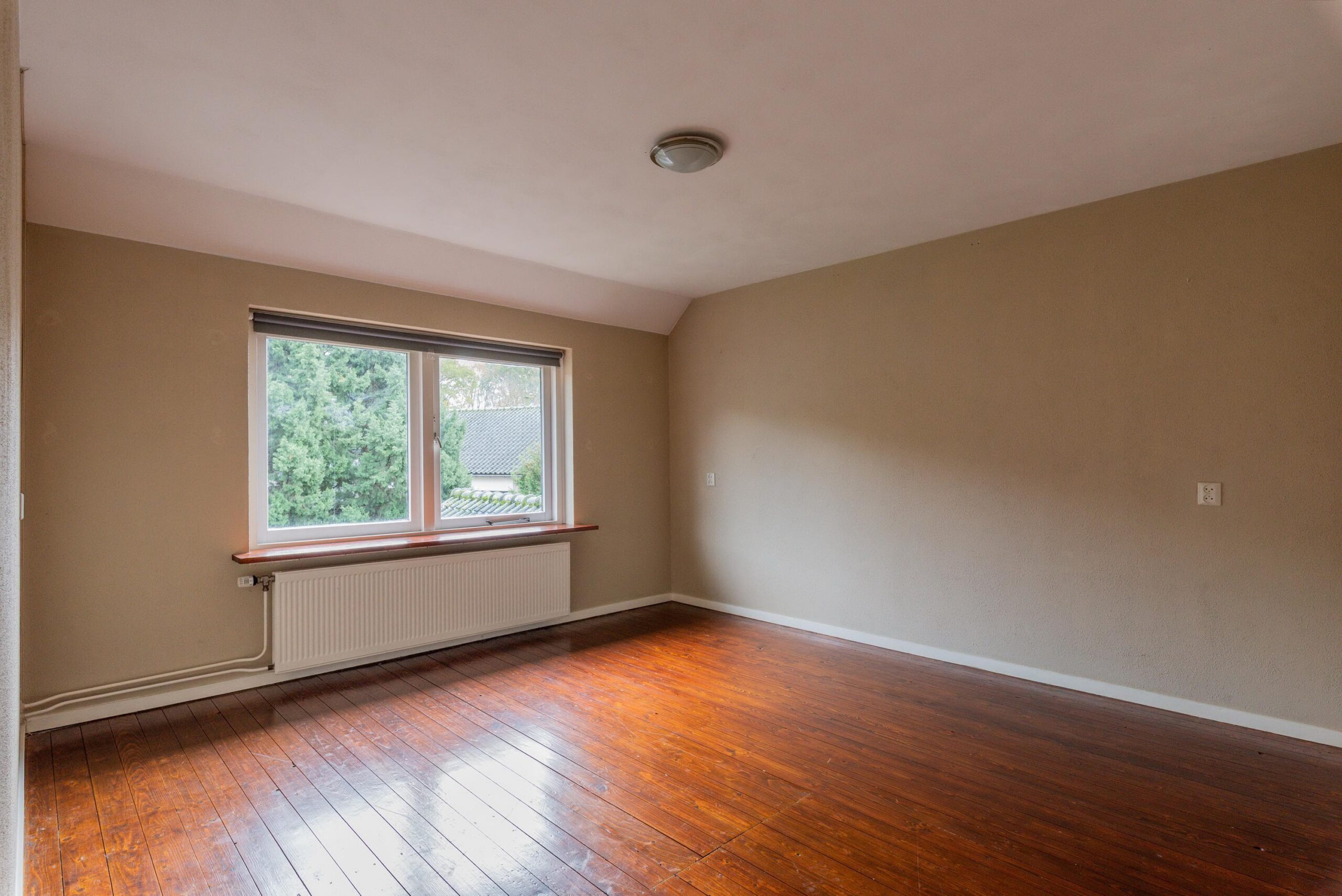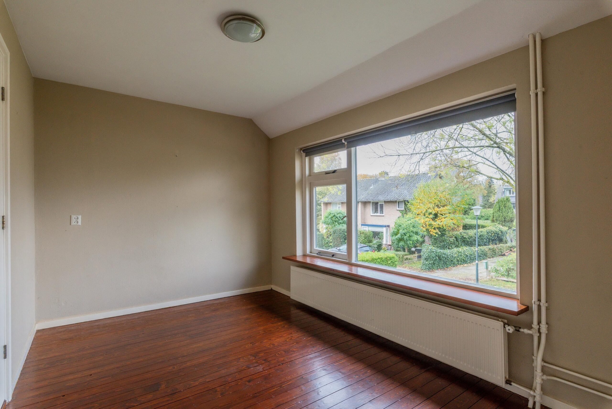 Via een vaste trap bereikt u de bovenste etage, waar zich de derde slaapkamer bevindt – een sfeervolle ruimte ook met gelakte houten vloer, extra bergruimte en de cv-installatie.