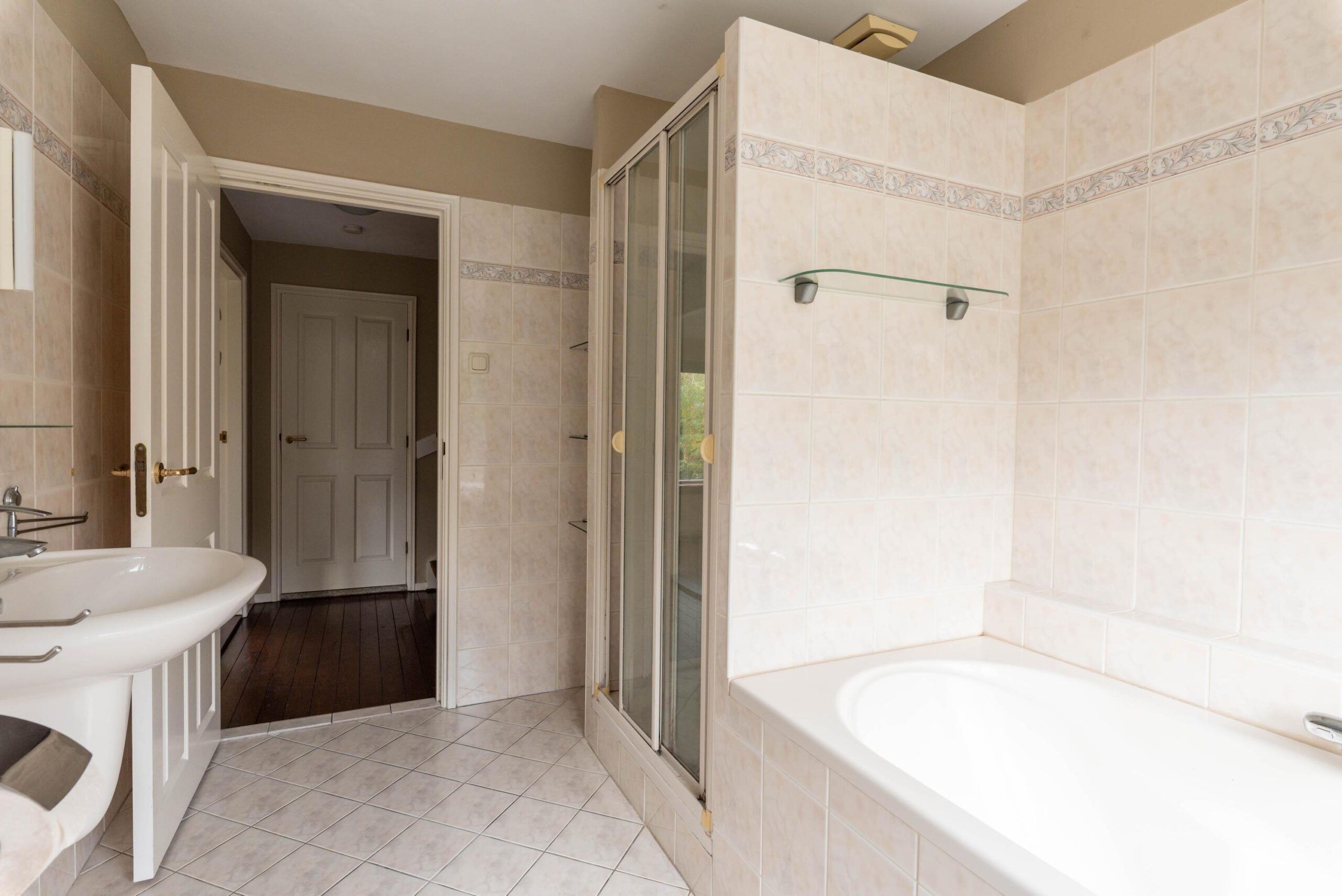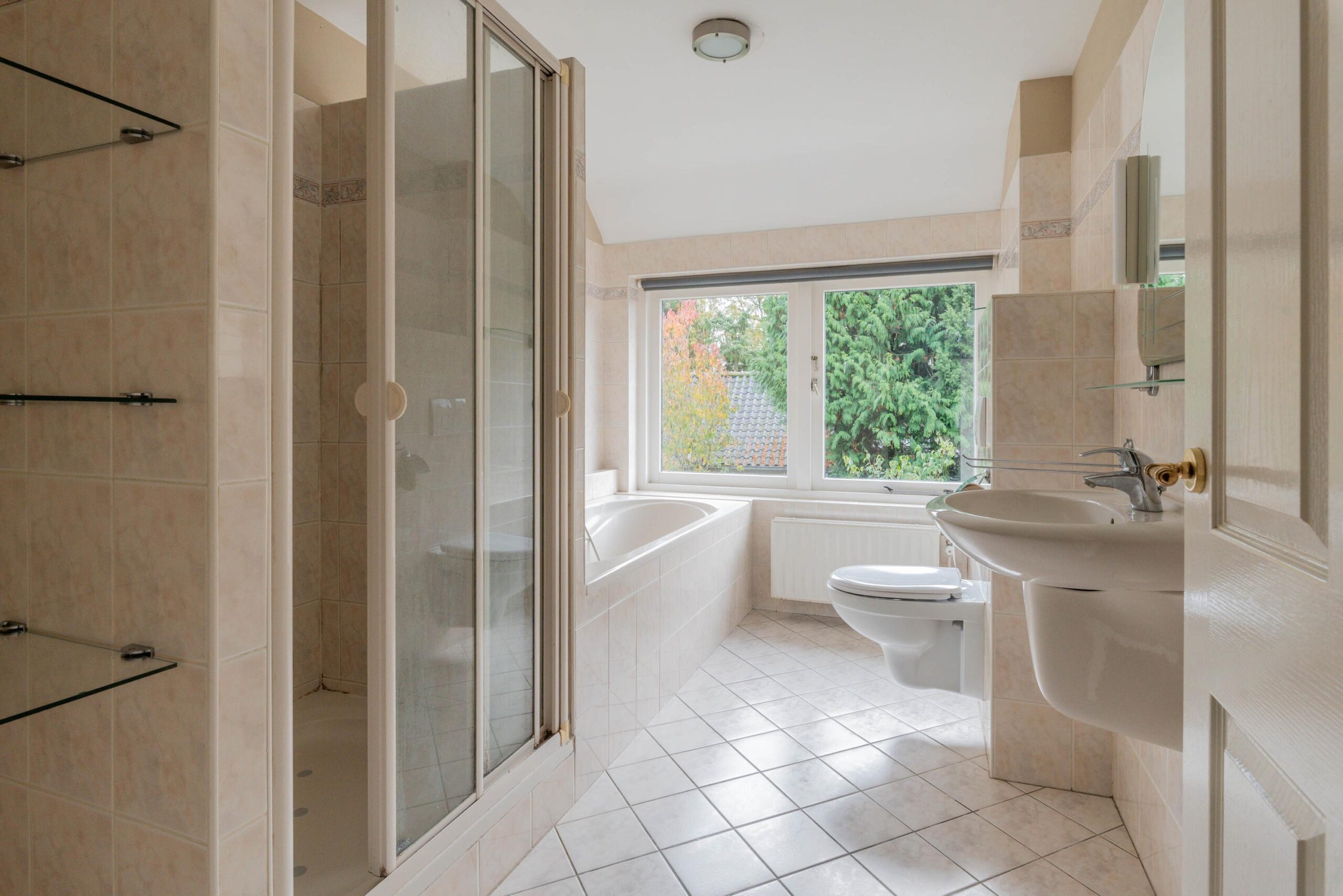 De lichte badkamer is voorzien van ligbad, tweede toilet, wastafel en separate douche. Daarnaast is er een praktische waskamer met wasmachine, droger en een wastafel.