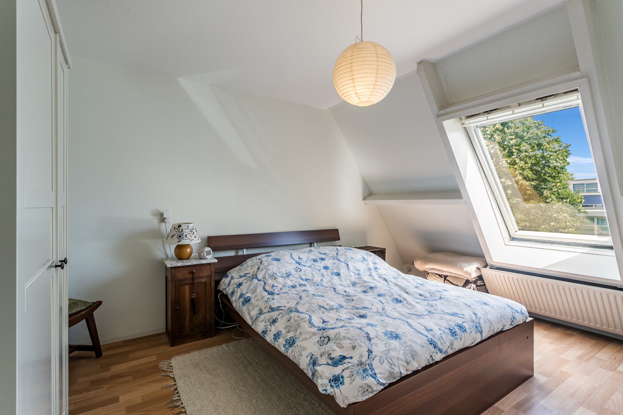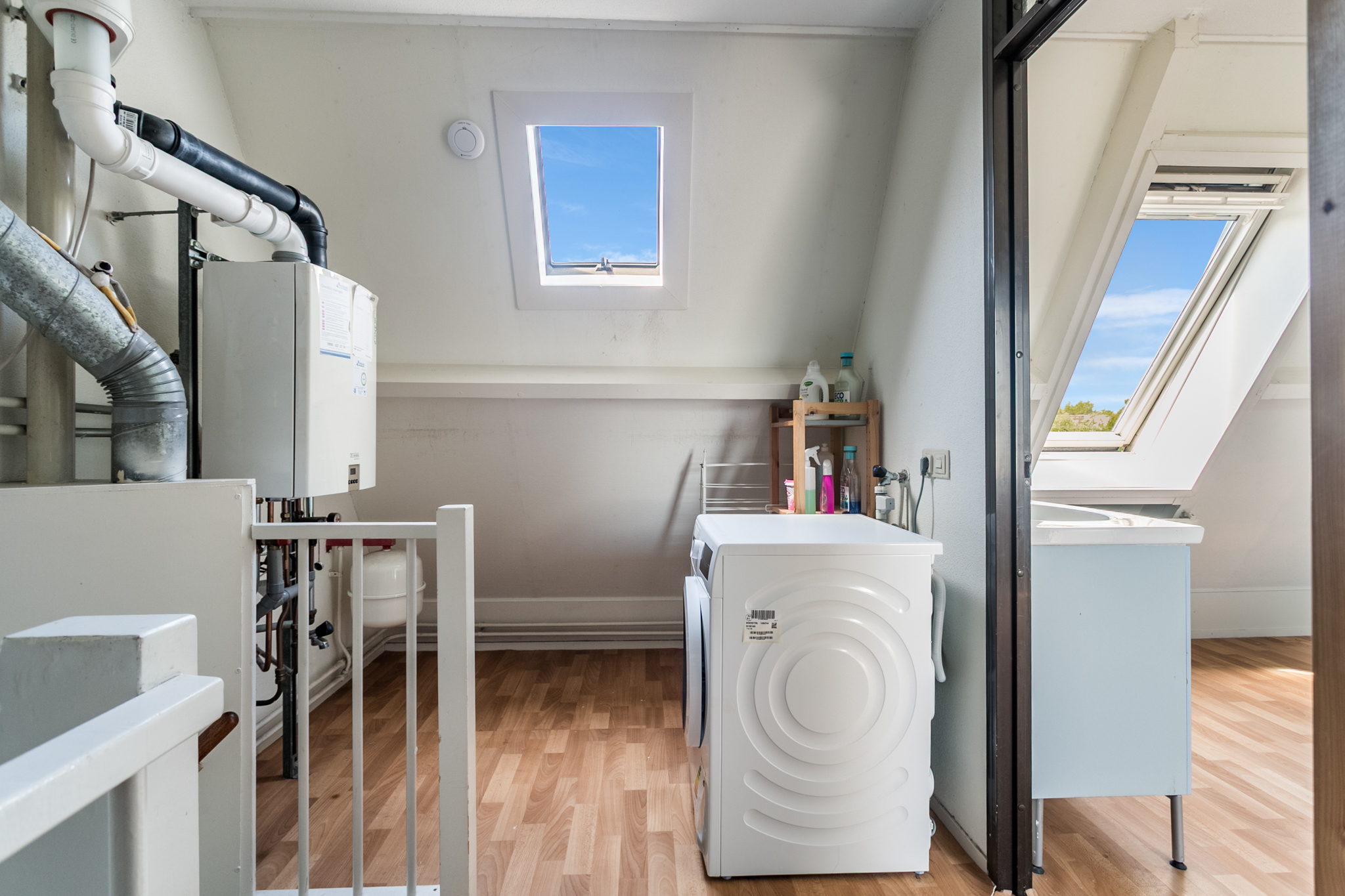 Zolder: overloop met aansluiting voor de wasmachine, ruime zonnige slaapkamer met twee Velux dakramen. Deze kamer kan eenvoudig worden gesplitst in twee slaapkamers, de deur is al aanwezig.