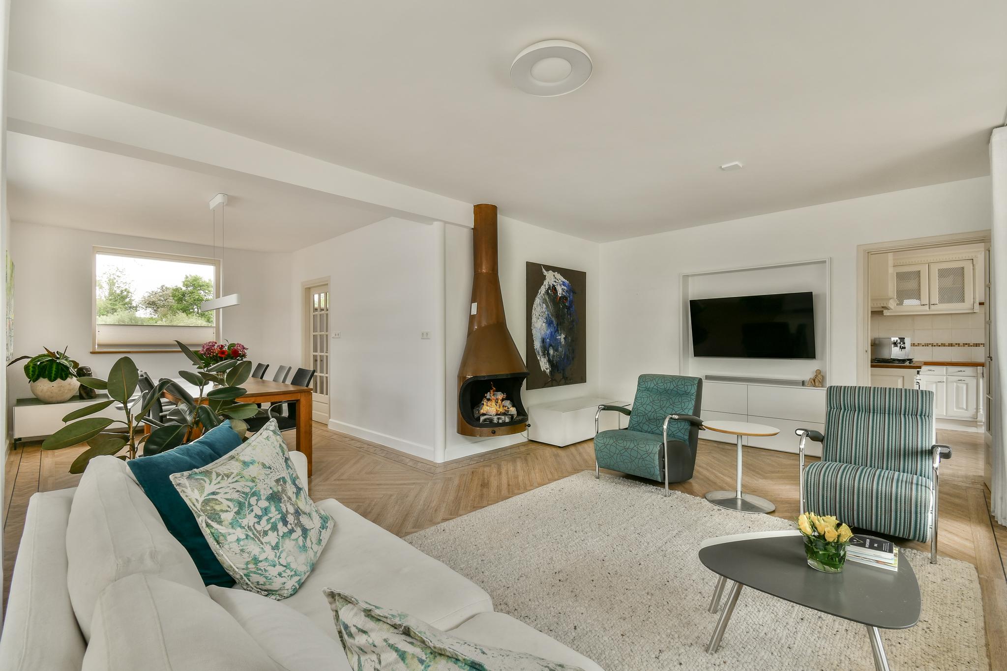 De ruime entree/hal is heerlijk licht en hier bevinden zich de trapopgang en een toilet. Via de hal kom je in een ruime L-vormige woonkamer met sfeervolle openhaard. Grote raampartijen zorgen voor een spectaculair uitzicht over De Vecht. De vloer in visgraat loopt naadloos door vanuit de hal en vervolgens door naar de keuken. Vanuit de woonkamer heb je toegang tot de aangrenzende overdekte veranda en de tuin. Vanuit de woonkamer bereik je een landelijke woonkeuken.