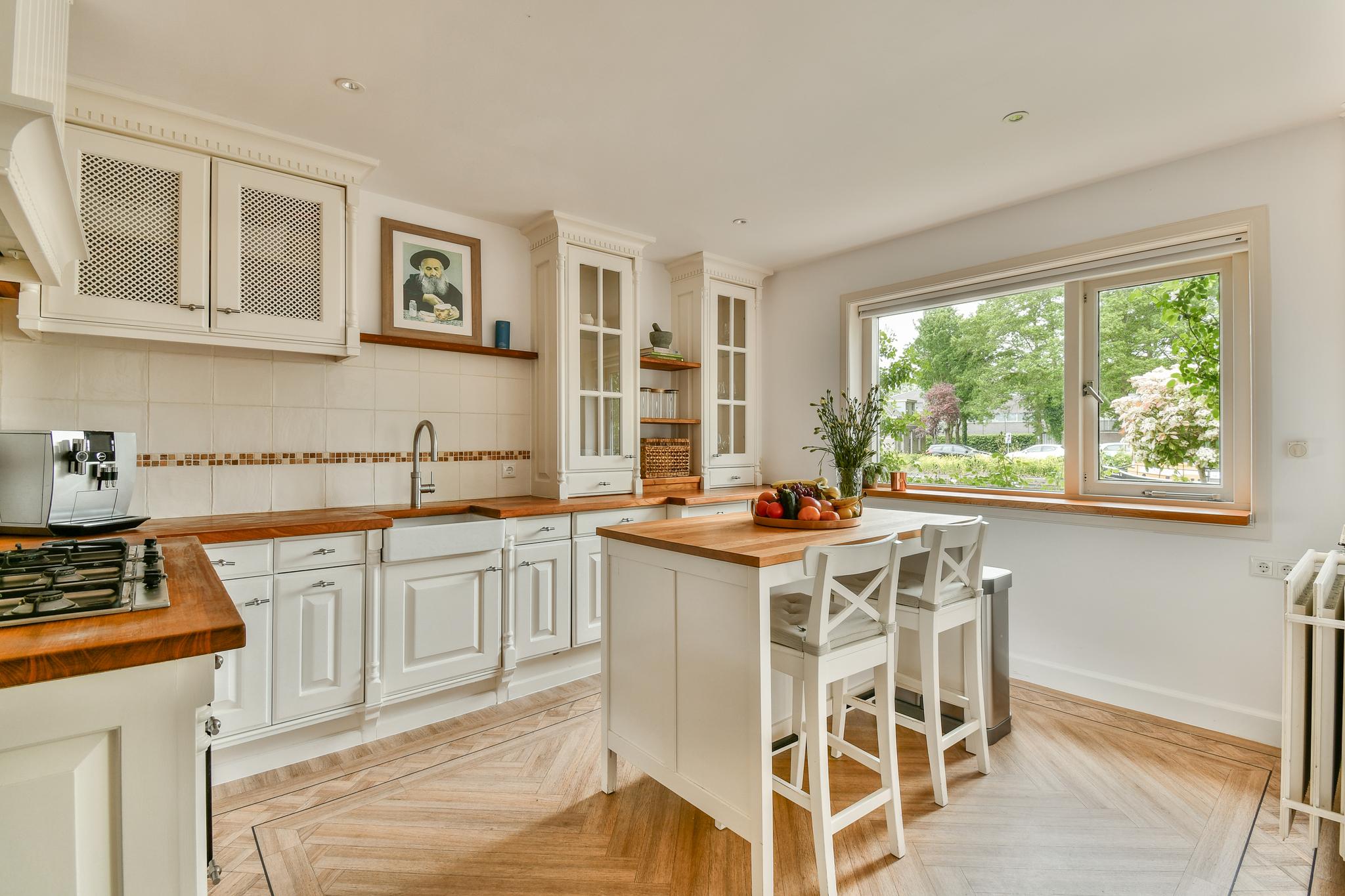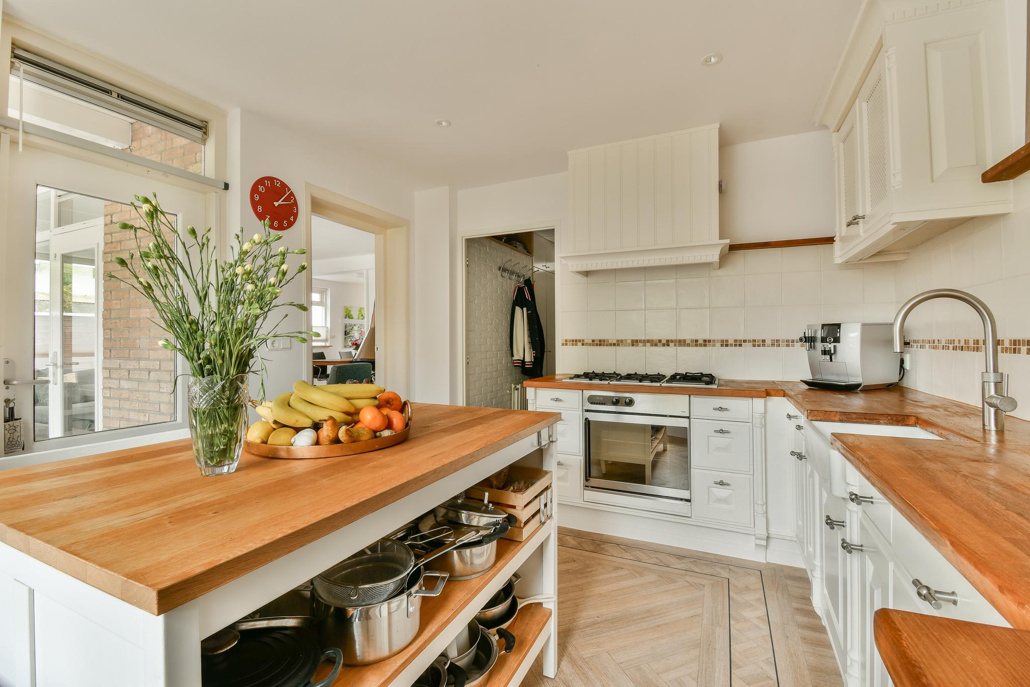 De keuken is voorzien van diverse inbouwapparatuur waaronder een ruim gasfornuis met extra wokbrander, grote inbouwspoelbak, oven en ingebouwde afzuigkap. Ook vanuit de keuken is toegang tot de tuin en het uitzicht over het water is hier wederom geweldig! Aansluitend bevindt zich een ruime bijkeuken met opstelplaats voor wasmachine, droger en extra opbergruimte. Openslaande deuren leiden naar de carport waardoor boodschappen vanuit de auto gemakkelijk naar keuken en bijkeuken gebracht kunnen worden.
