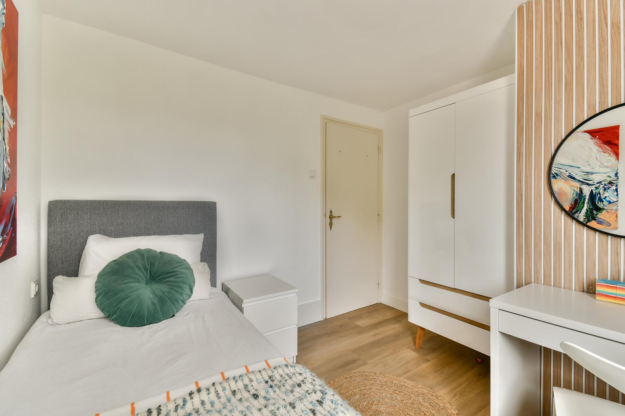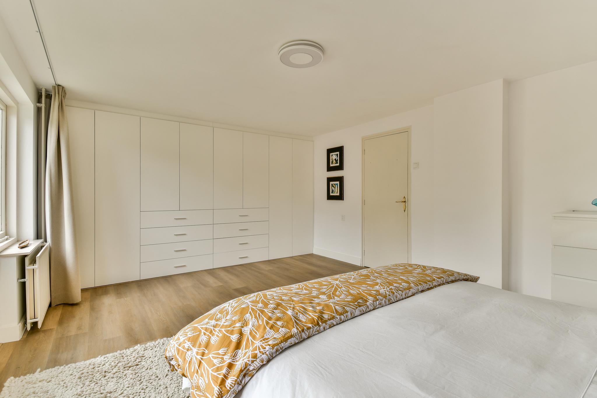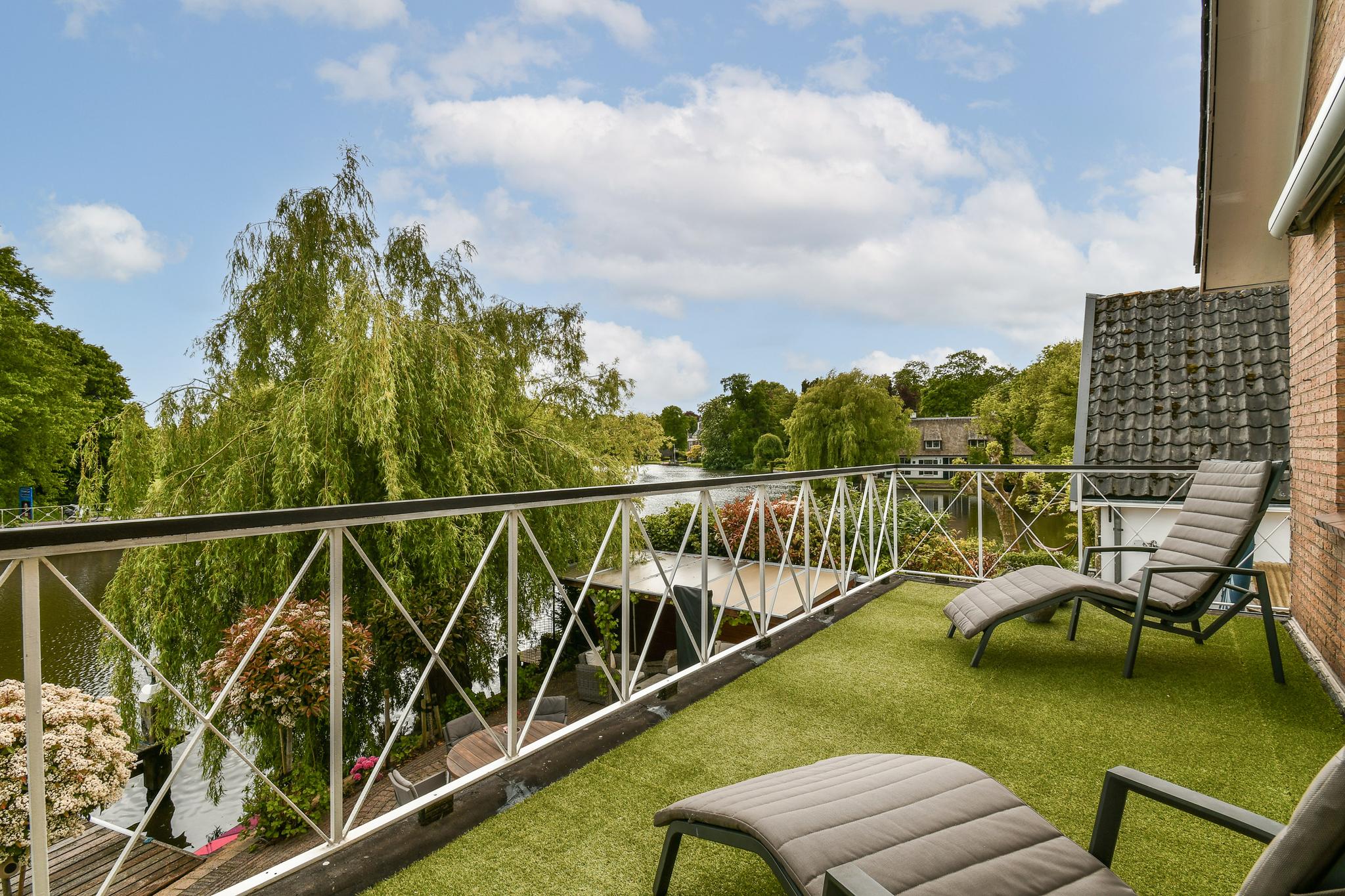 Eerste etage: Op de eerste etage bevinden zich vier kamers en de badkamer. De ouderslaapkamer ligt aan de achterzijde van de woning en is voorzien van veel bergruimte met een mooie vaste kastenwand. Vanuit de ouderslaapkamer is toegang tot een riant dakterras met zicht over De Vecht. Zonwering aan de buitenzijde zorgt voor comfort. De badkamer is in een lichte kleurstelling uitgevoerd en voorzien van een