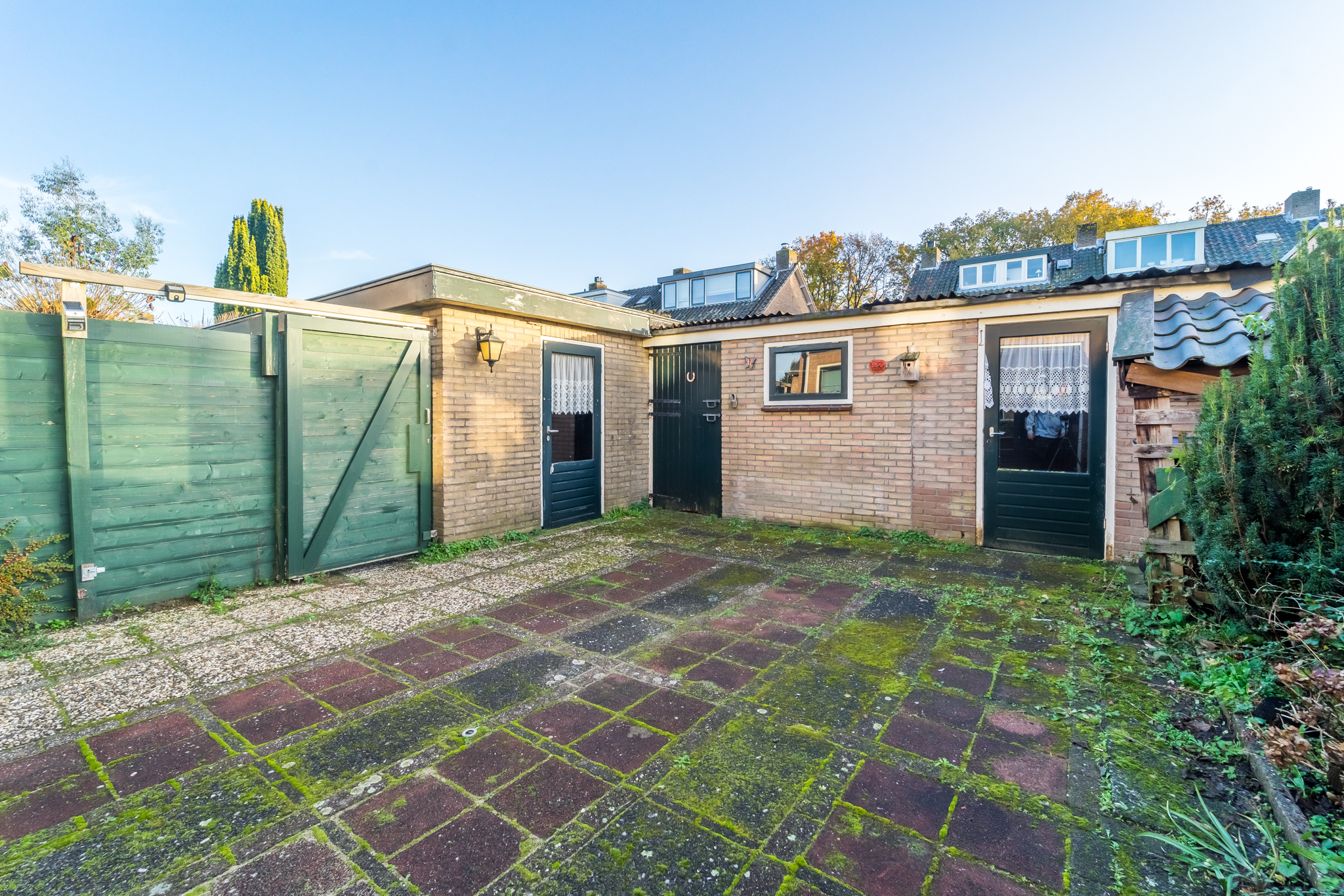 De achtertuin is op het zuiden gelegen, heeft een achterom en biedt eveneens toegang tot de garage. Naast de garage zijn twee grote stenen schuren gebouwd.
