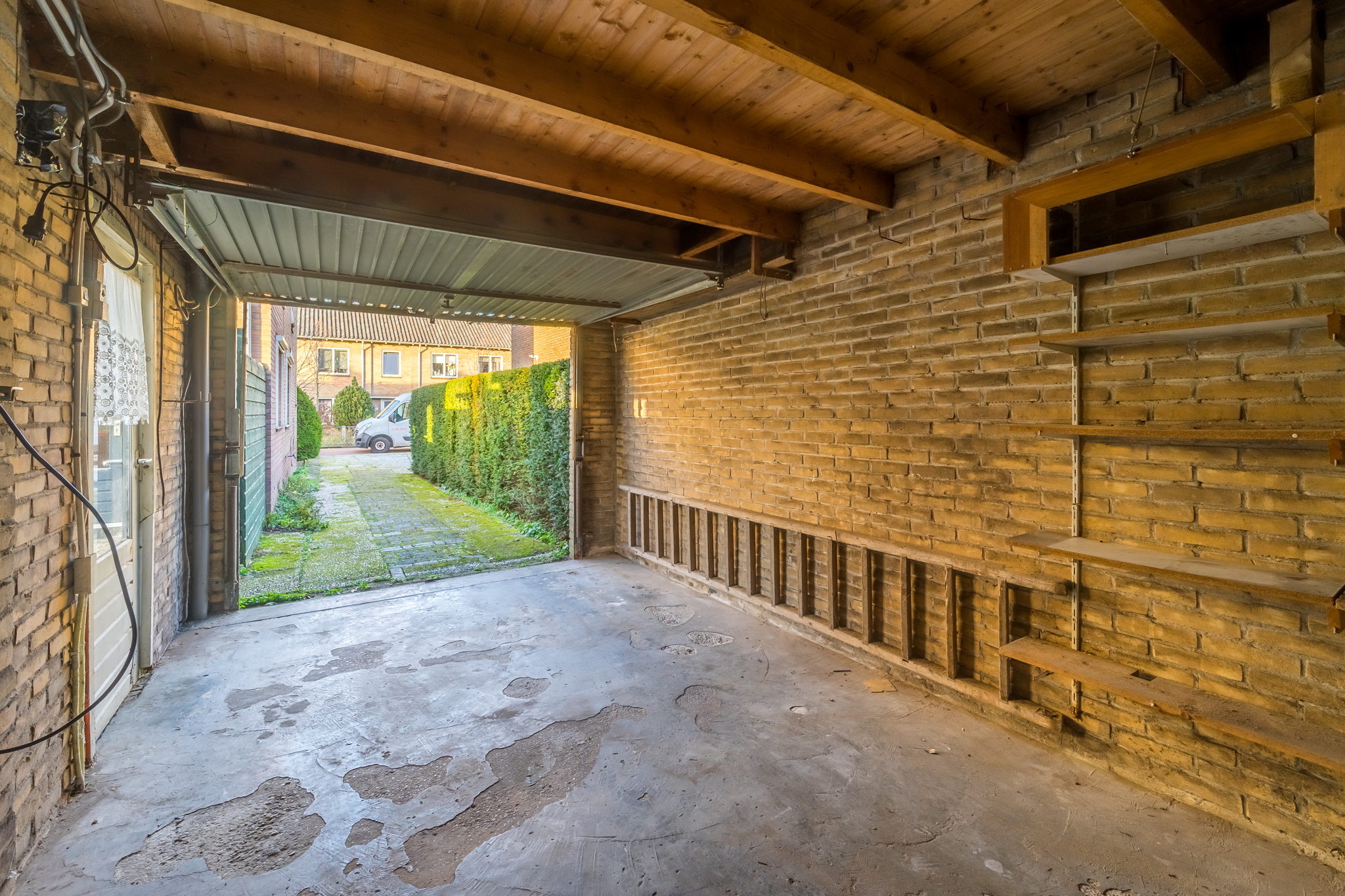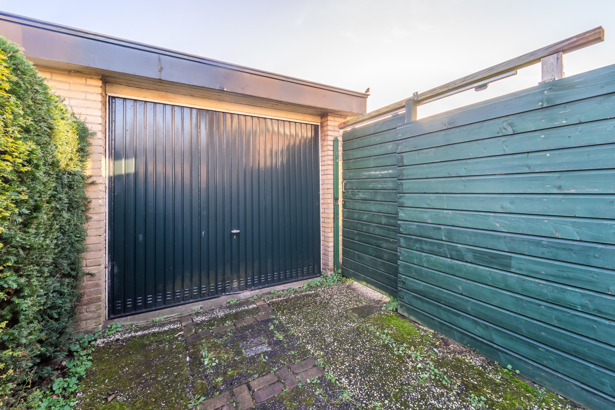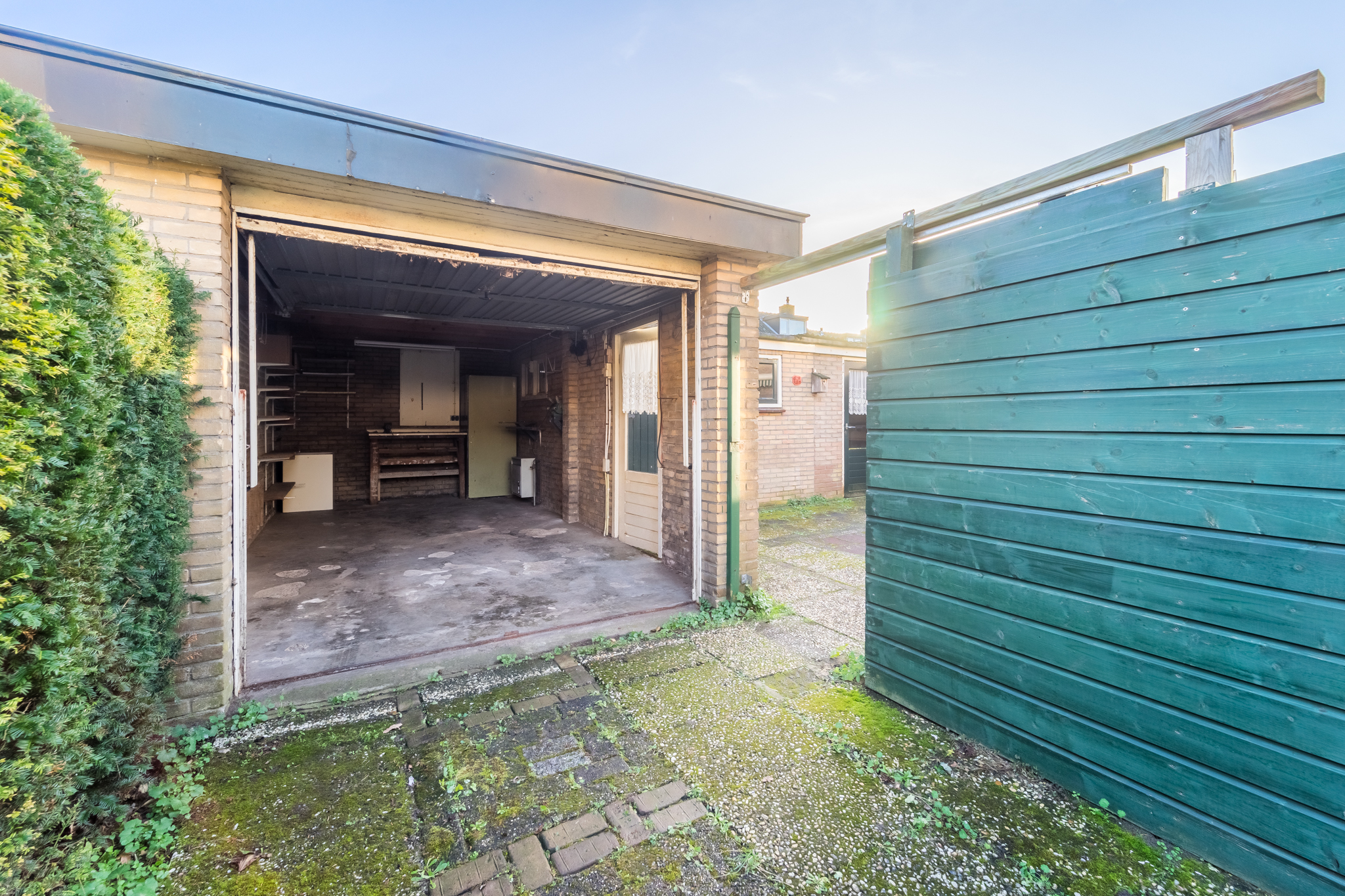 Aangrenzend aan de zijkant van de woning bevindt zich de stenen garage, met ervoor een oprit met plaats voor twee auto’s.