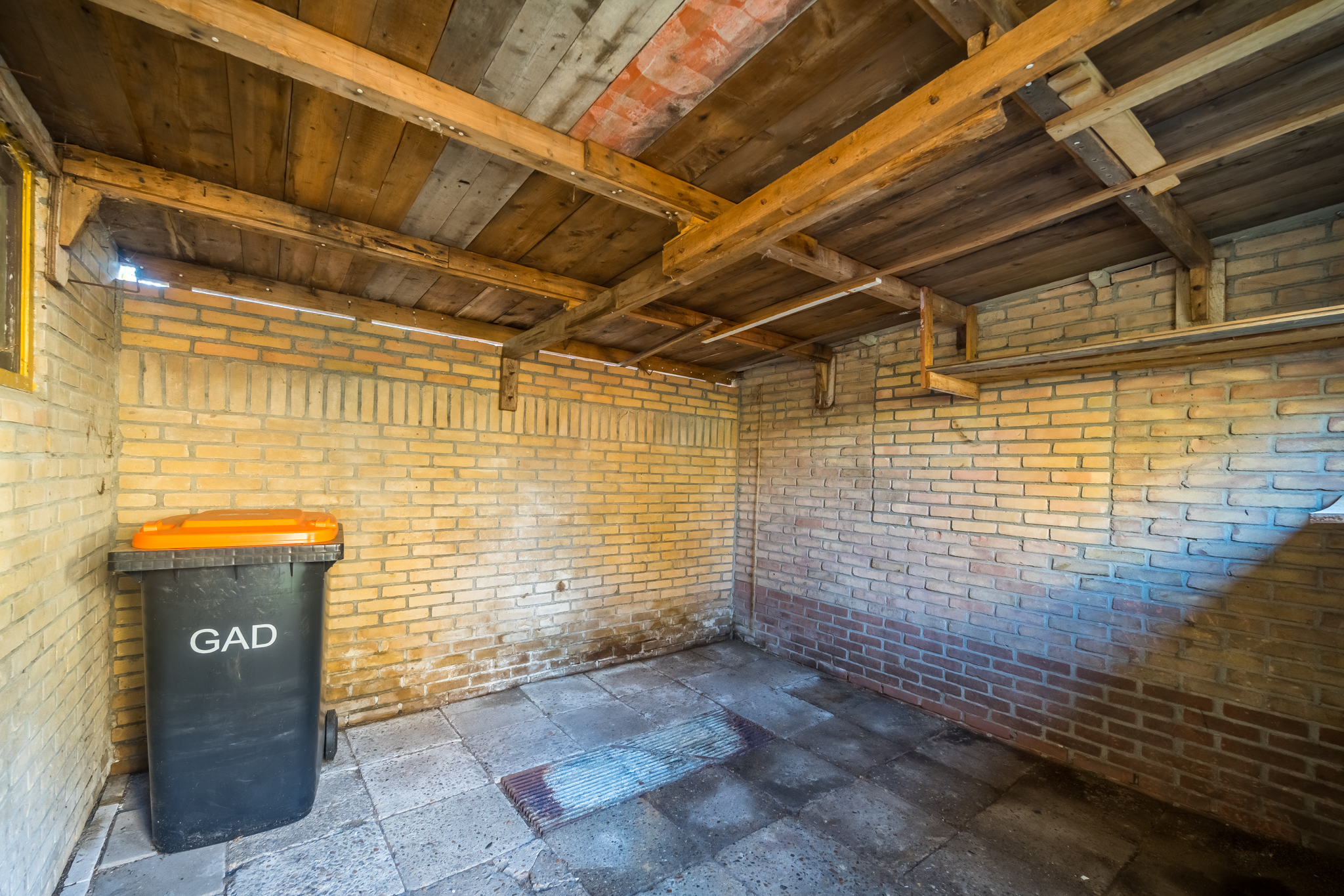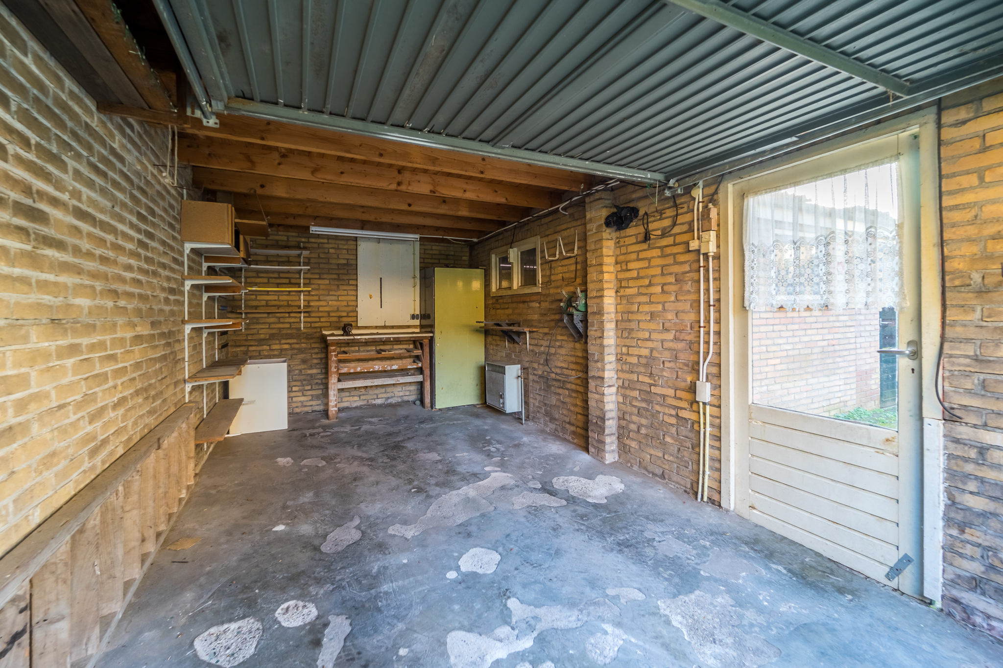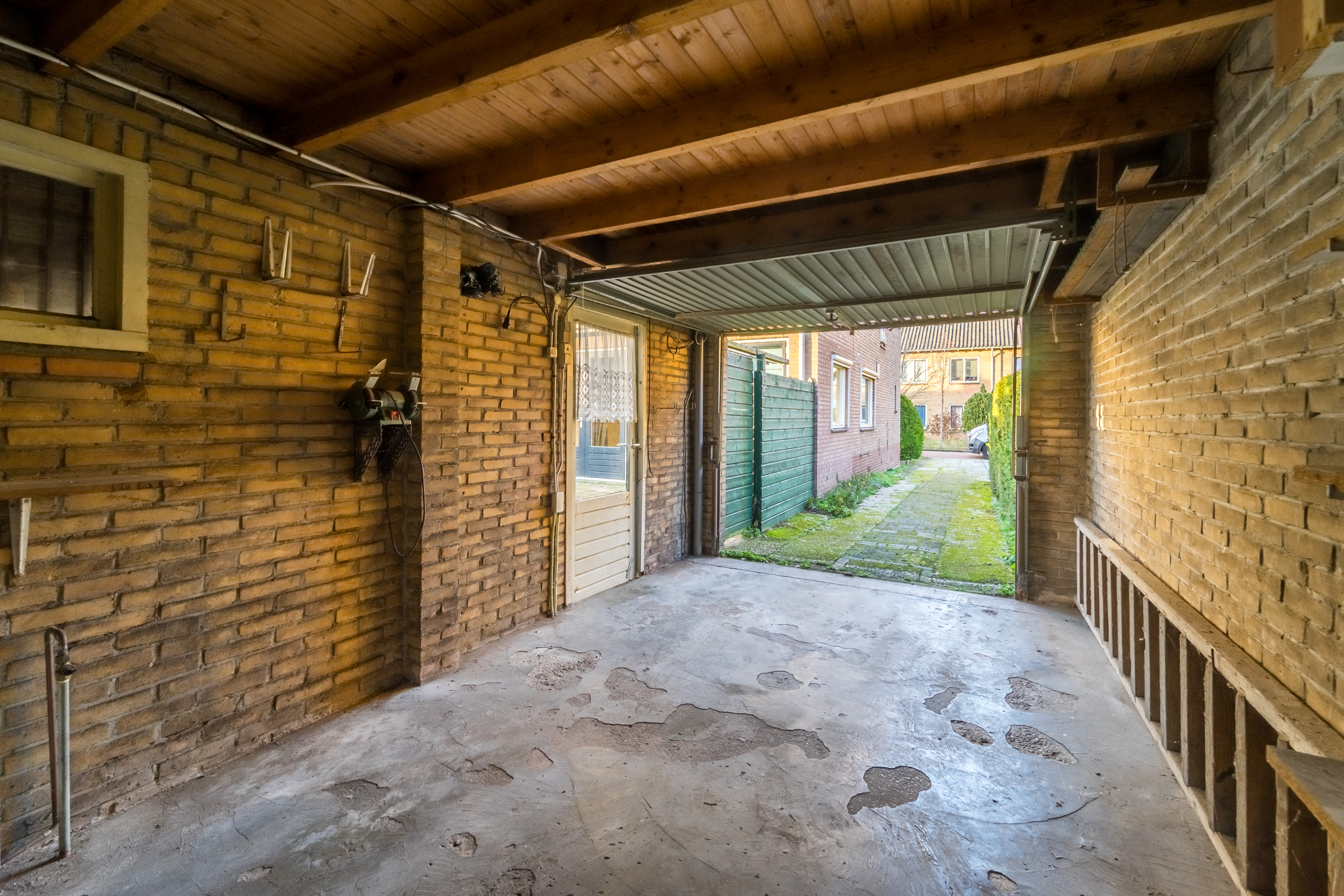 Aangrenzend aan de zijkant van de woning bevindt zich de stenen garage, met ervoor een oprit met plaats voor twee auto’s.