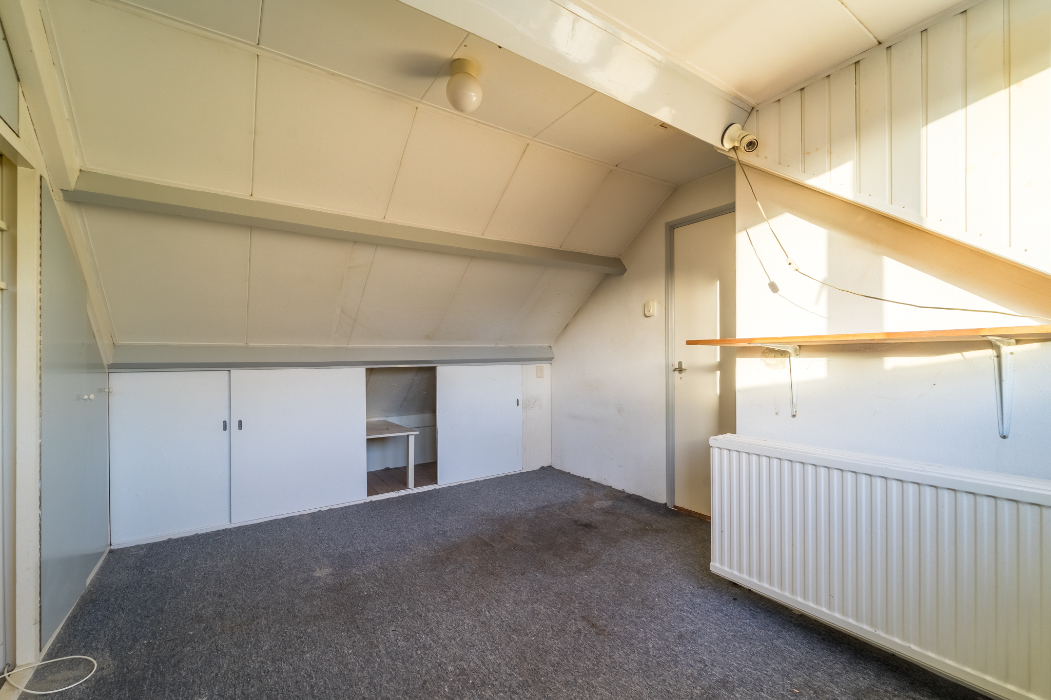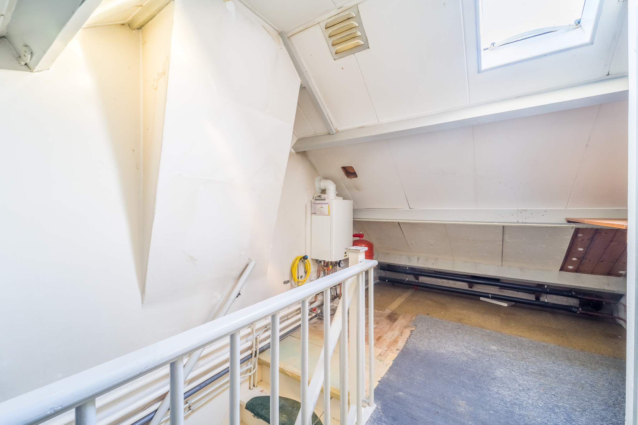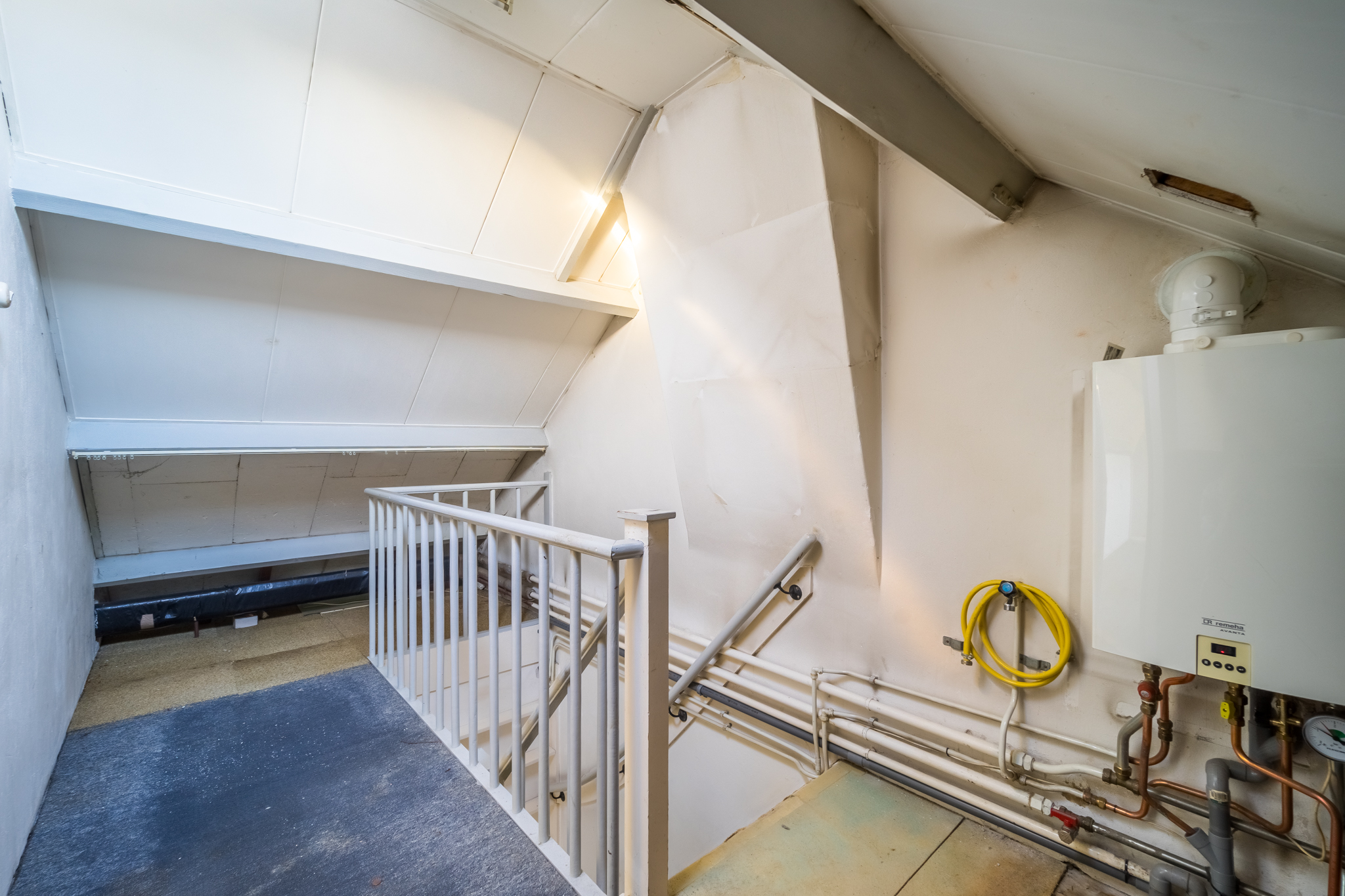 De zolder die middels een vaste trap bereikbaar is, heeft een dakkapel aan de tuinkant alsmede een wastafel. Op de voorzolder hangt de cv-combiketel en hier is ook veel bergruimte.