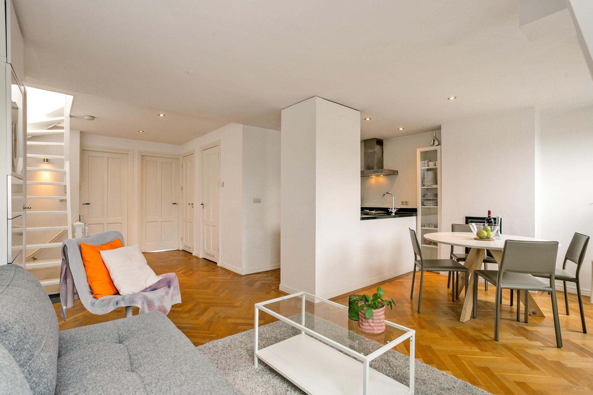Indeling: Entree op de derde verdieping waar u uw jas kunt ophangen voor u op de vierde verdieping de zitkamer via de hal inloopt. Deze bevindt zich aan de voorkant met plaats voor een gezellige zithoek en een ruime eettafel, dit alles om de semi-open, moderne witte hoogglans keuken. De keuken heeft een zwart granieten werkblad en is van alle gemakken voorzien, te weten een 4-pits gaskookplaat met RVS-schouw, afwasmachine, combi-oven en ijskast met vriesvak. De drie ramen maar ook het trapgat naar het dakterras zorgen voor een zee van licht.