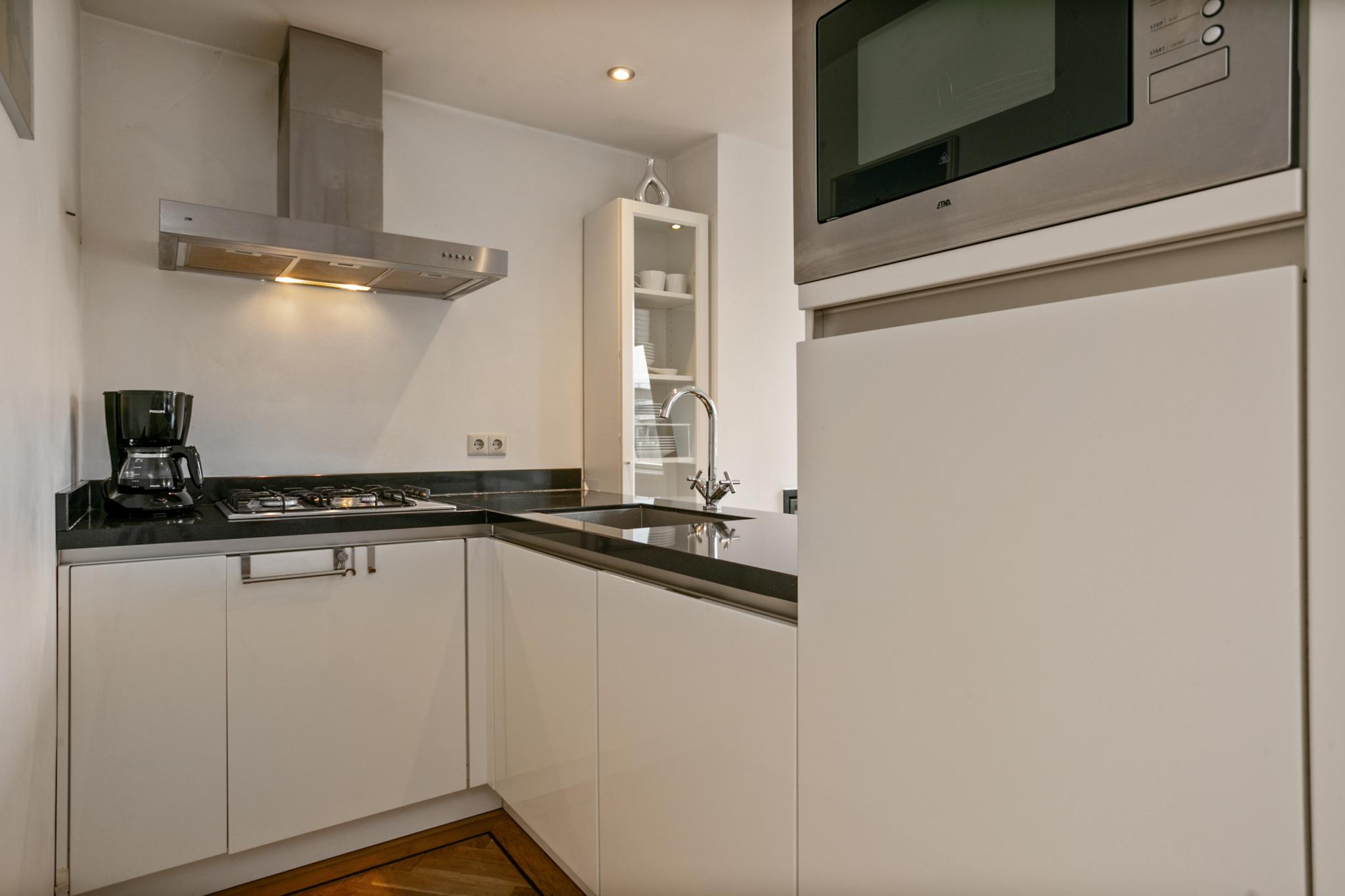 Layout: Entrance on the third floor where you can hang your coat before you walk into the living room on the fourth floor through the hall. Here is the living room at the front with space for a cozy sitting area and a spacious dining table, all around the semi-open, modern, white high-gloss kitchen with black granite worktop, fully equipped with a 4-burner gas hob, dishwasher, microwave and refrigerator. The three windows, but also the stairwell to the roof terrace provide a sea of light.