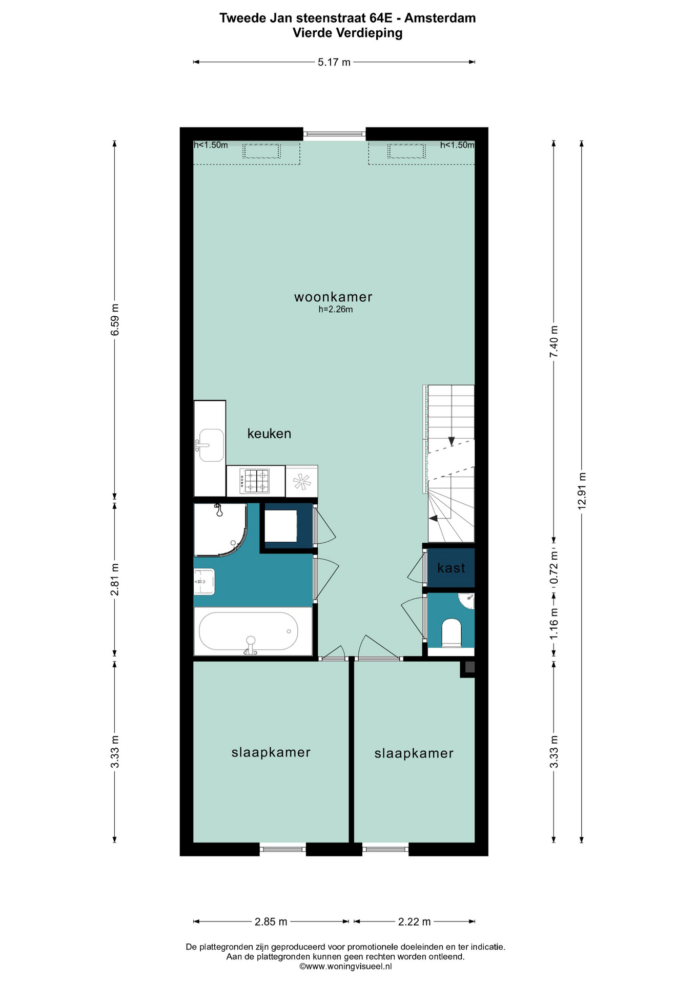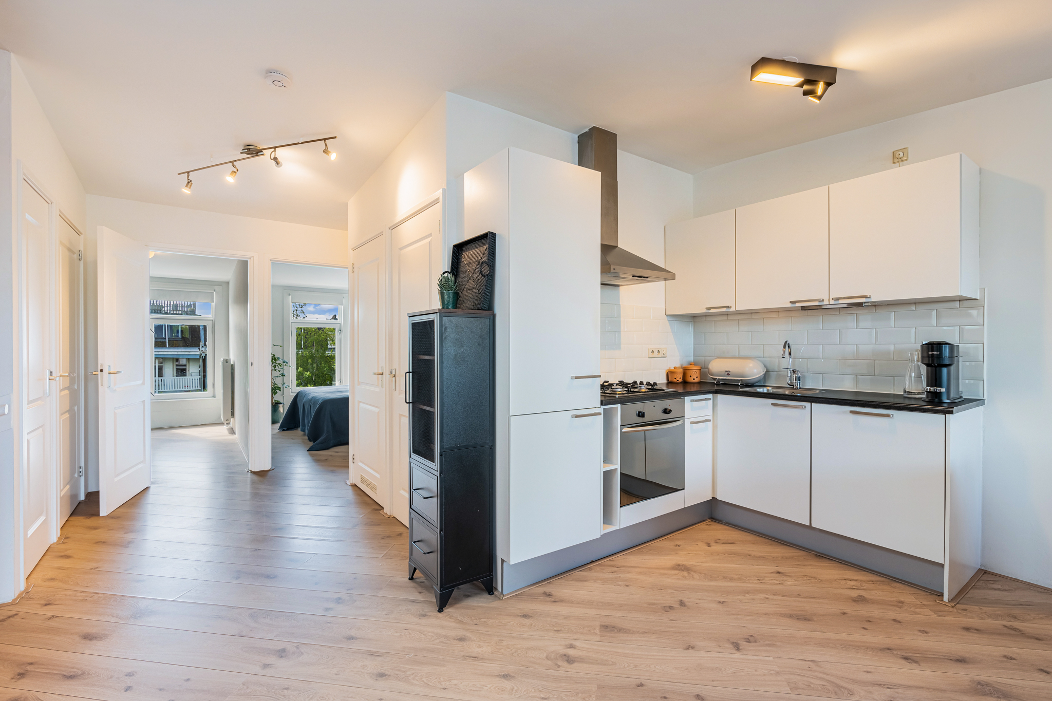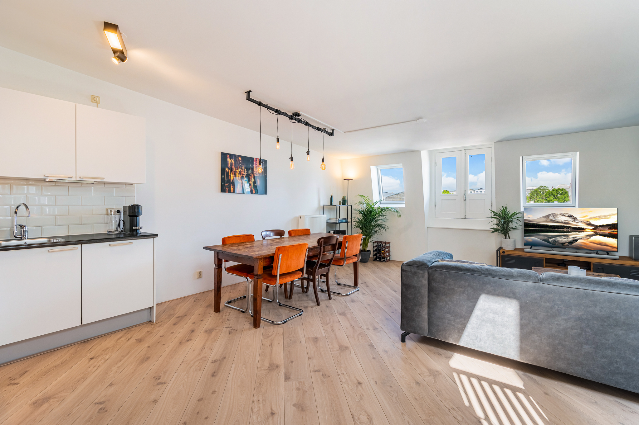 Vierde etage: een zeer lichte woonkamer met een open keuken, voorzien van inbouwapparatuur. Het dakhuis levert zelfs licht op in het midden van de verdieping waardoor dit appartement bovengemiddeld licht en zonnig is.