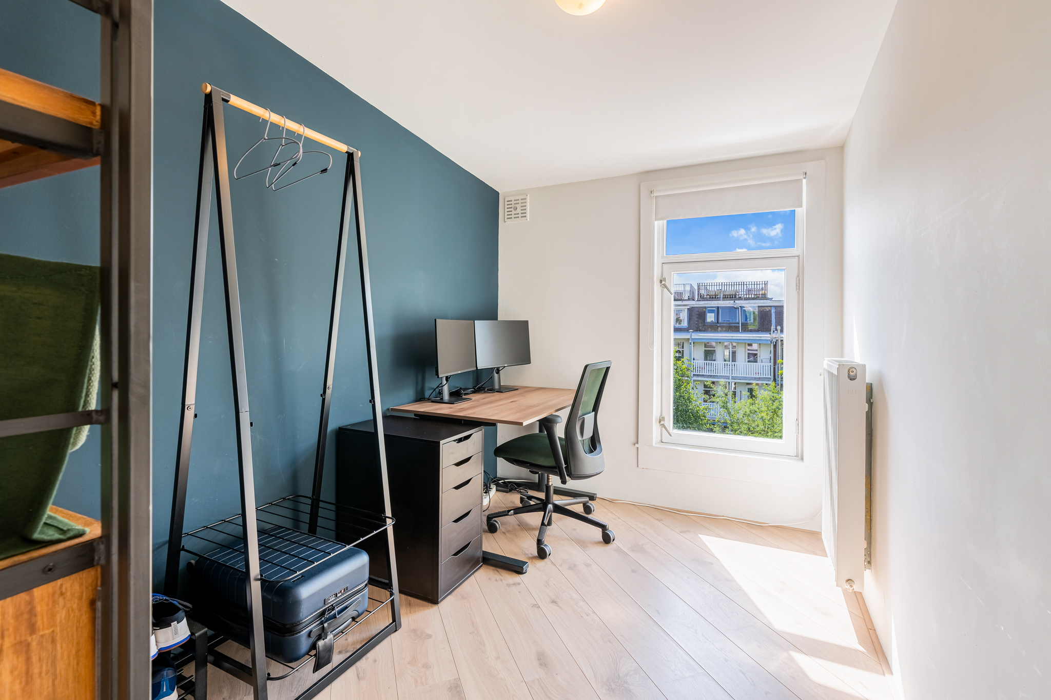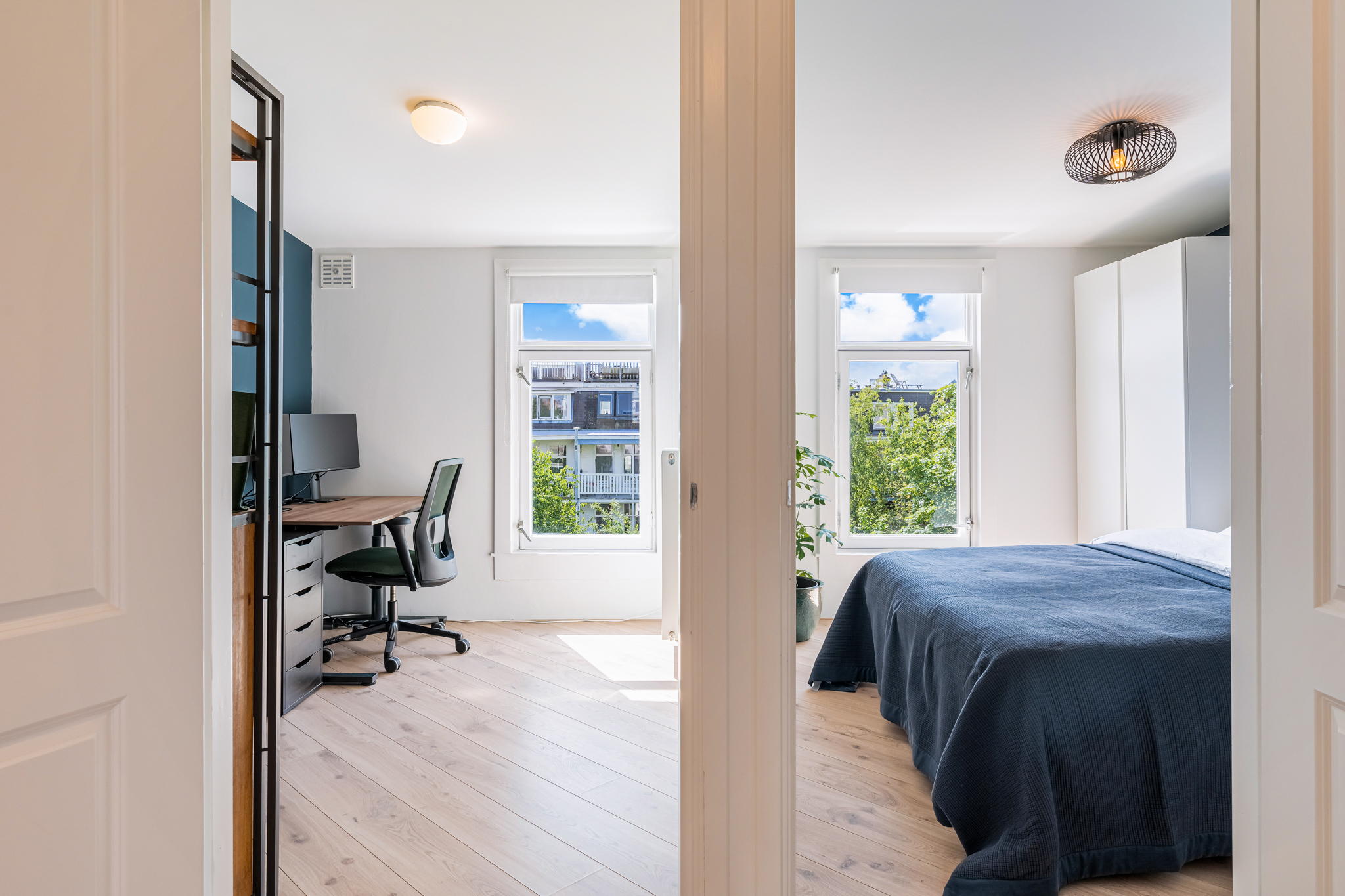 De master bedroom bevindt zich aan de achterzijde, samen met een tweede slaapkamer die momenteel dienst doet als kleedkamer/werkkamer.