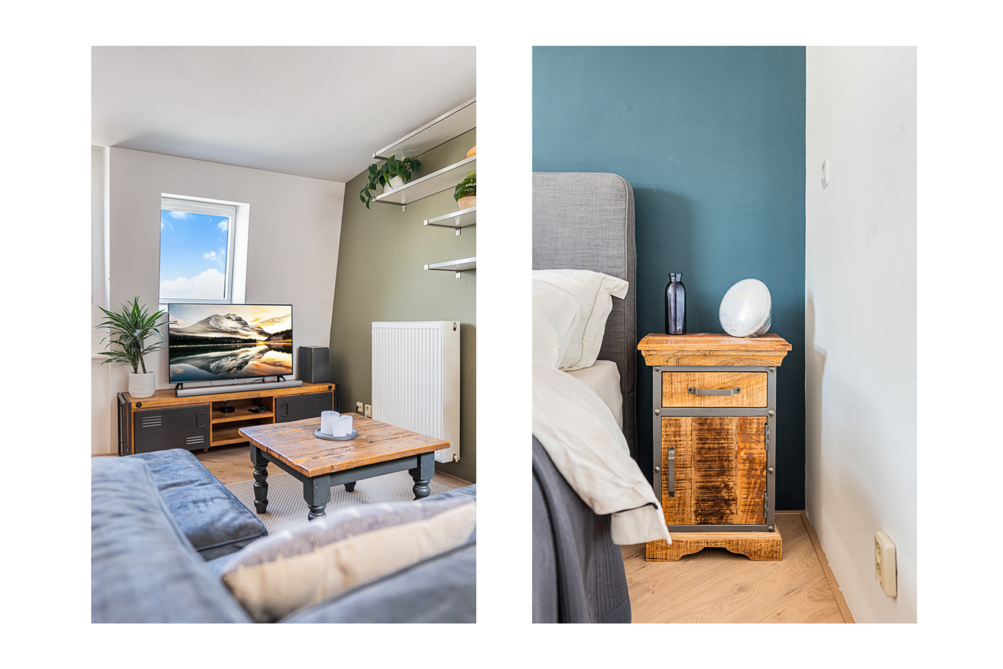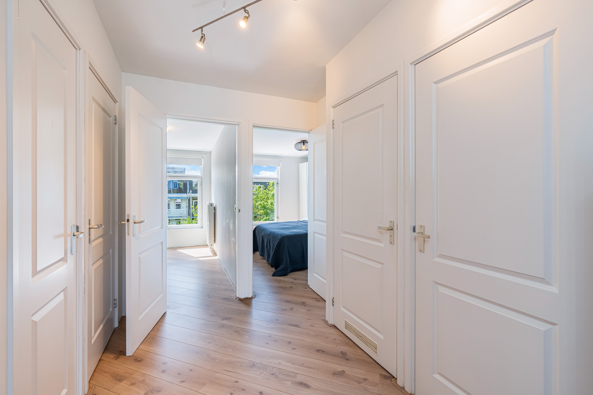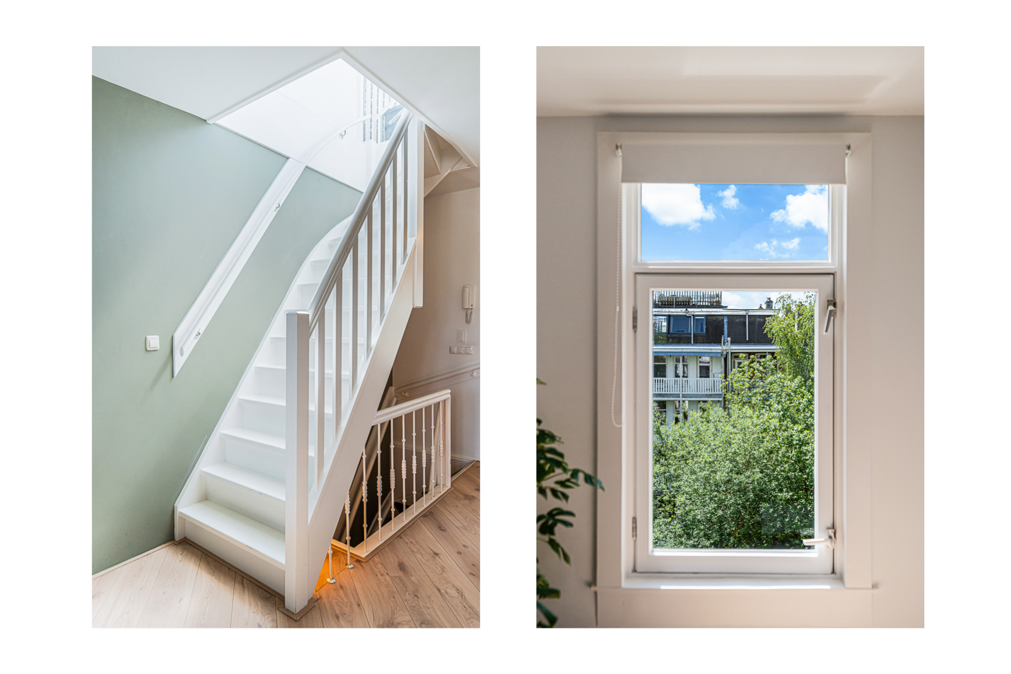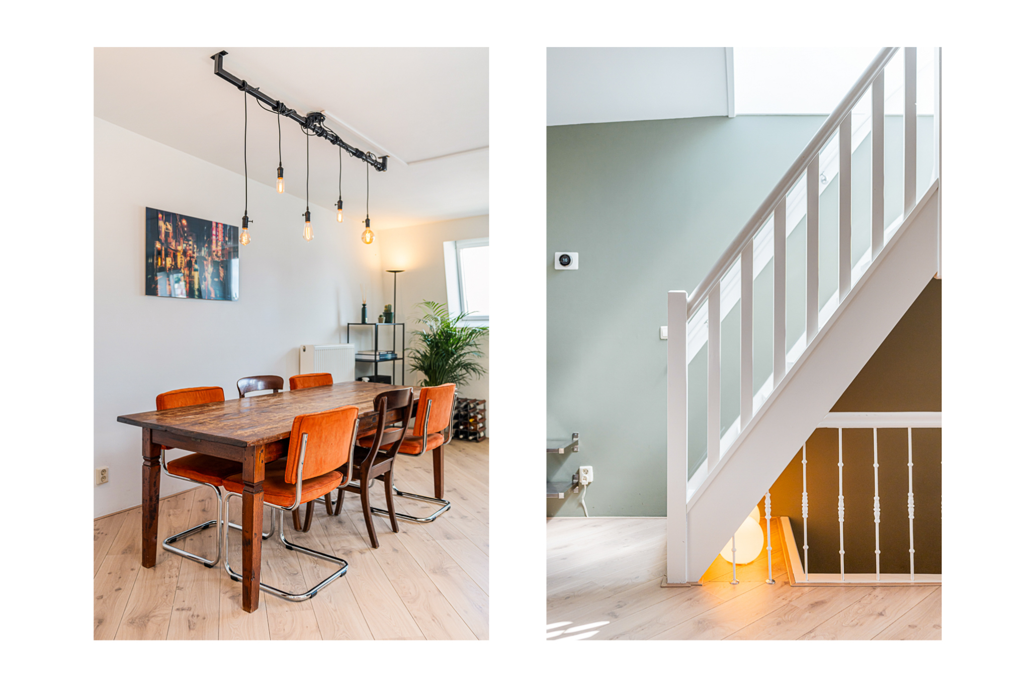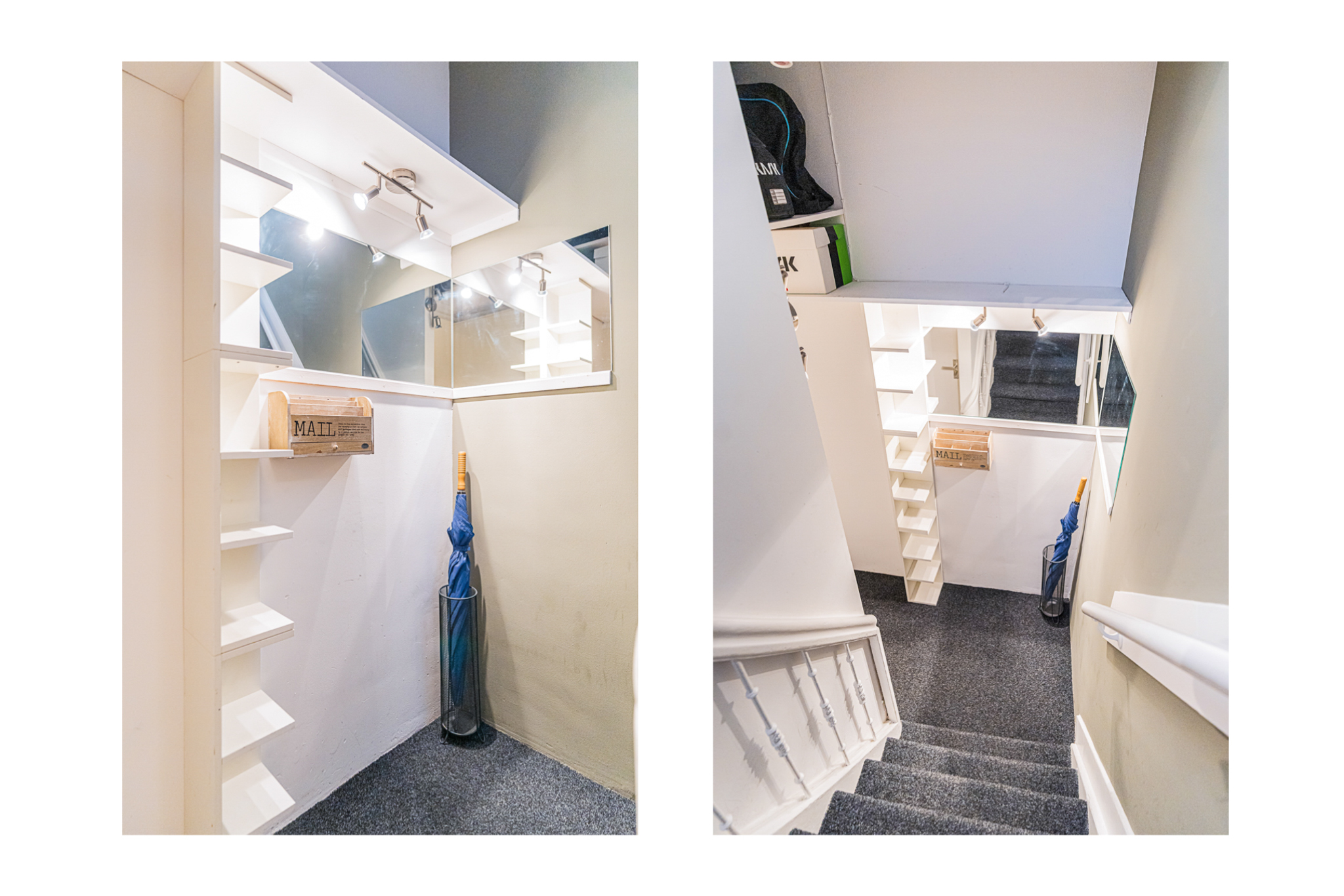 Derde etage: u betreedt het appartement en neemt uw eigen trap naar de vierde etage. Hier is plaats om uw jas op te hangen en vindt u nog een bergruimte onder de trap boven u.