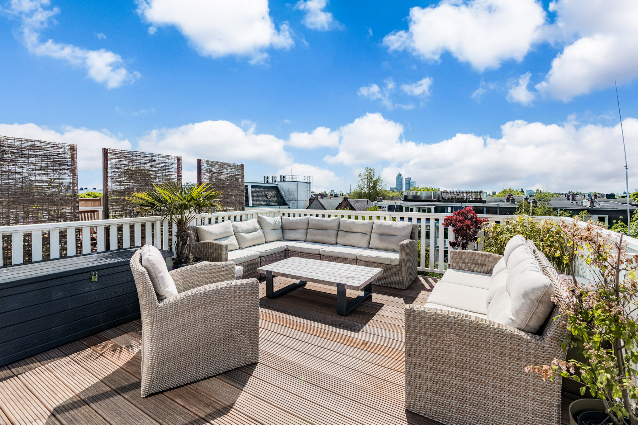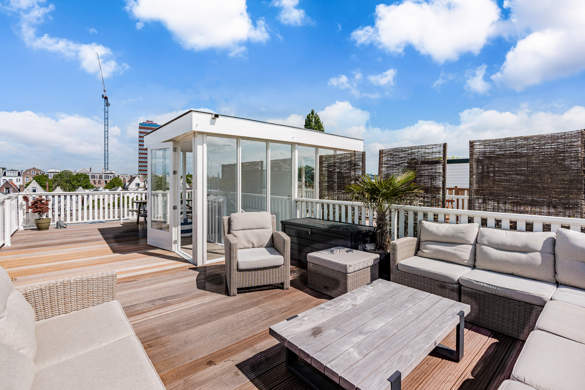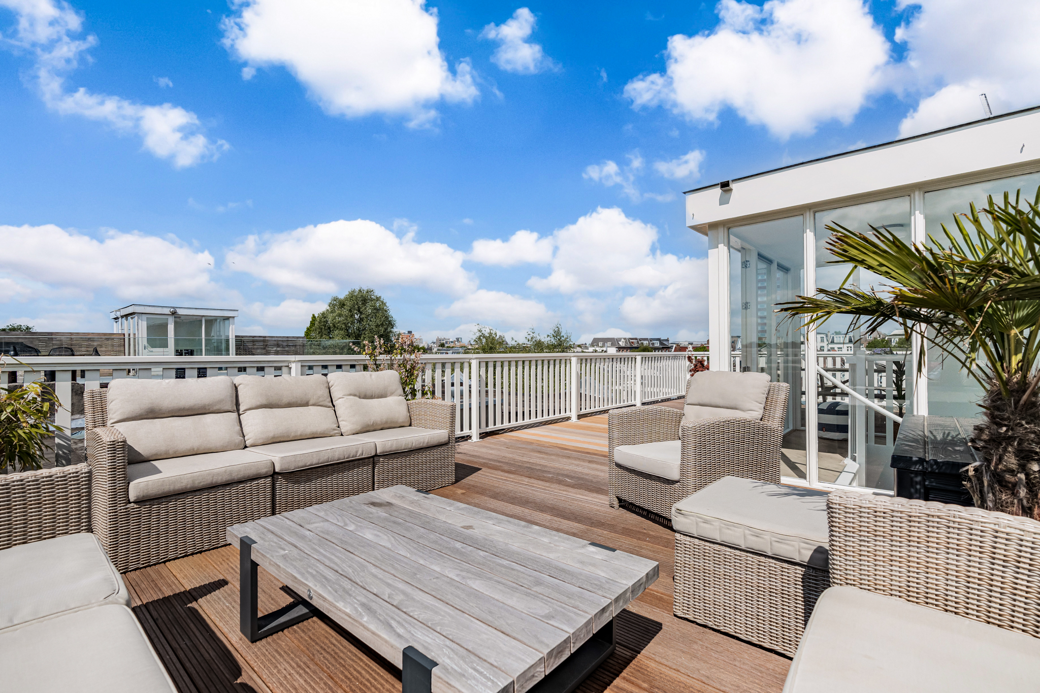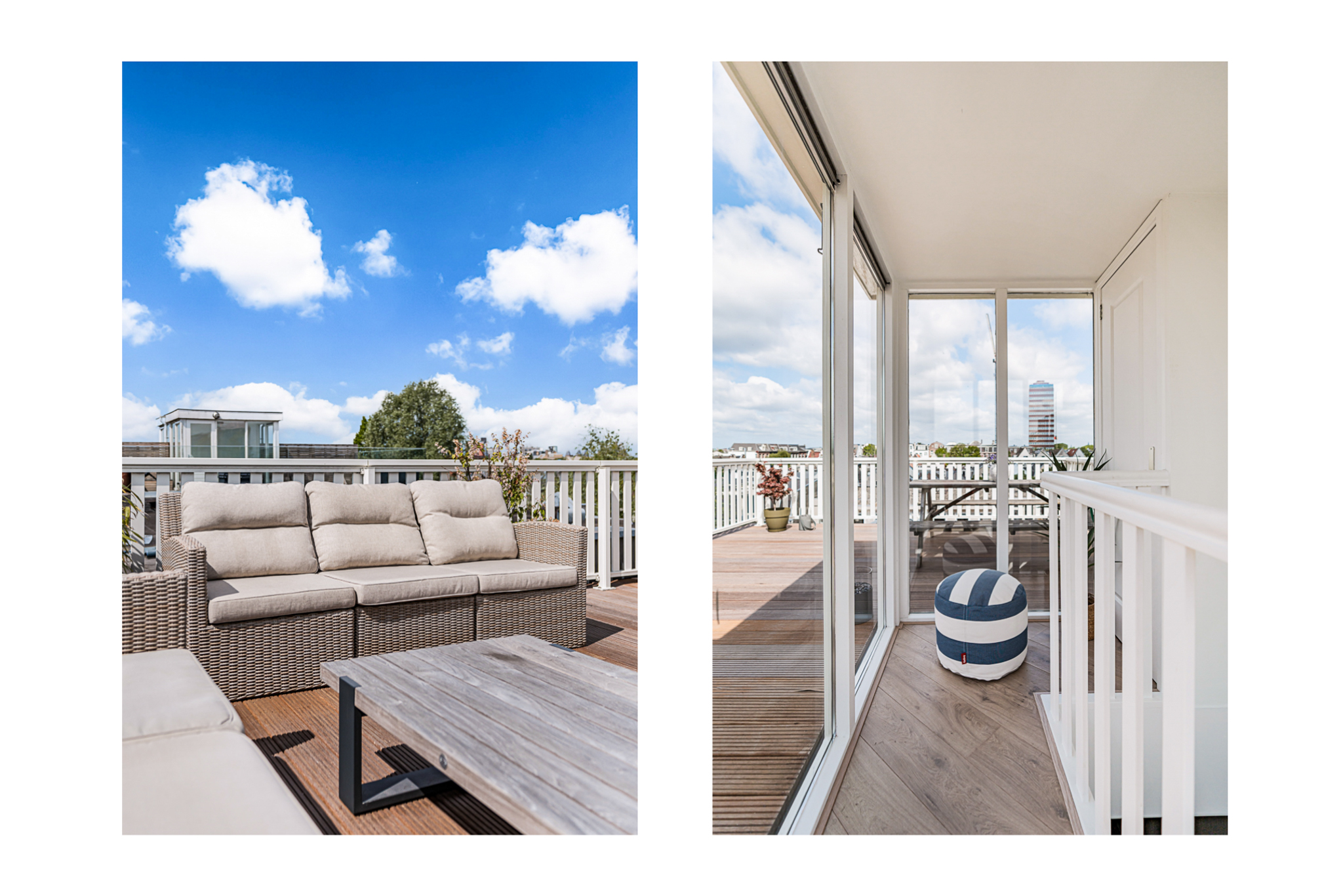 Het royale dakterras vormt de absolute blikvanger van dit appartement en biedt een panoramisch uitzicht van 360 graden over de stad met als highlights het Amstel Hotel, het Rijksmuseum en het Okura.