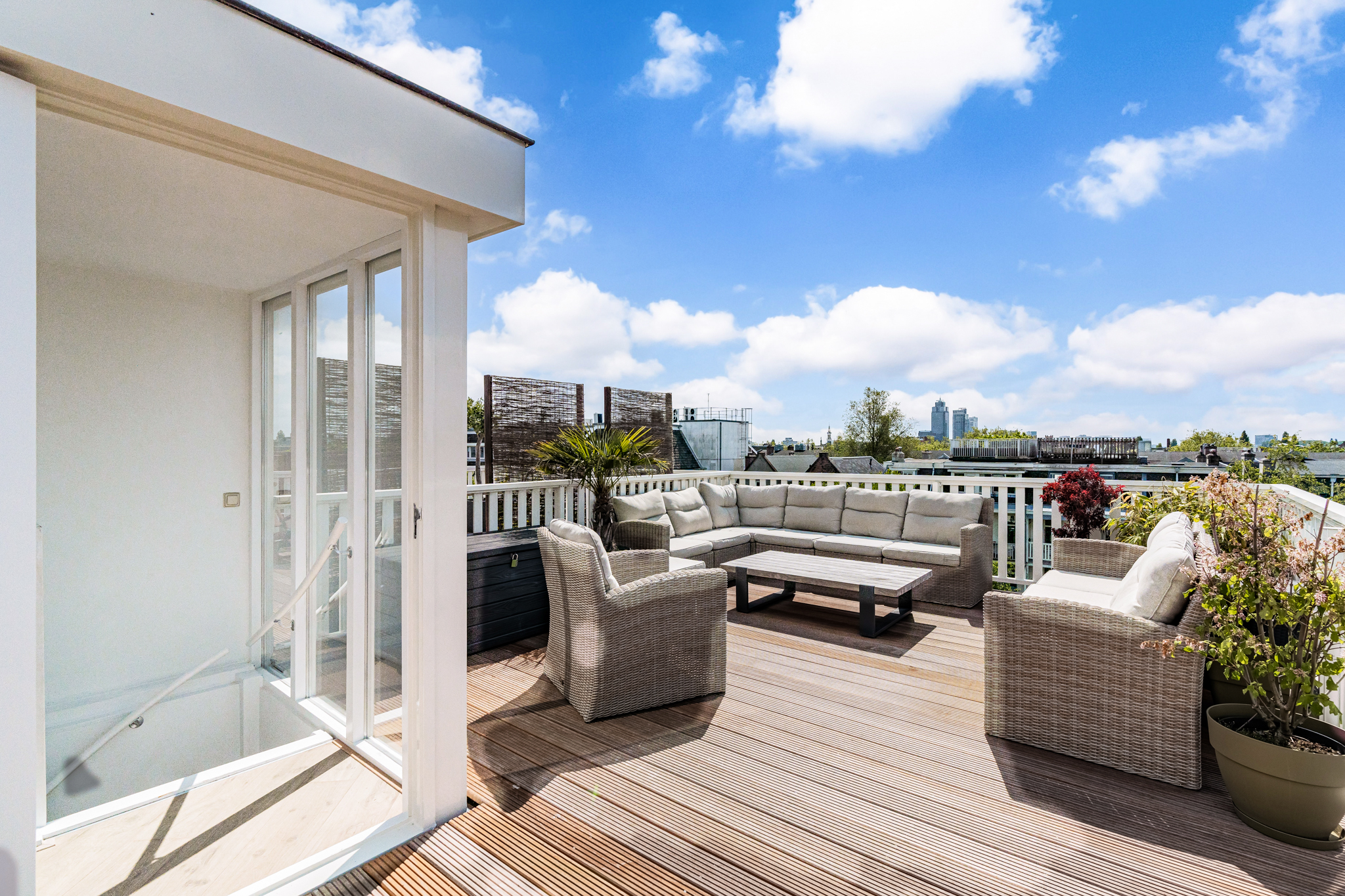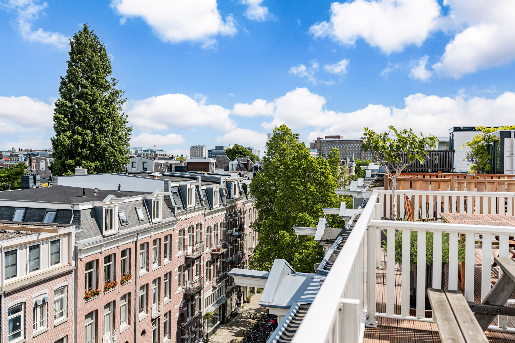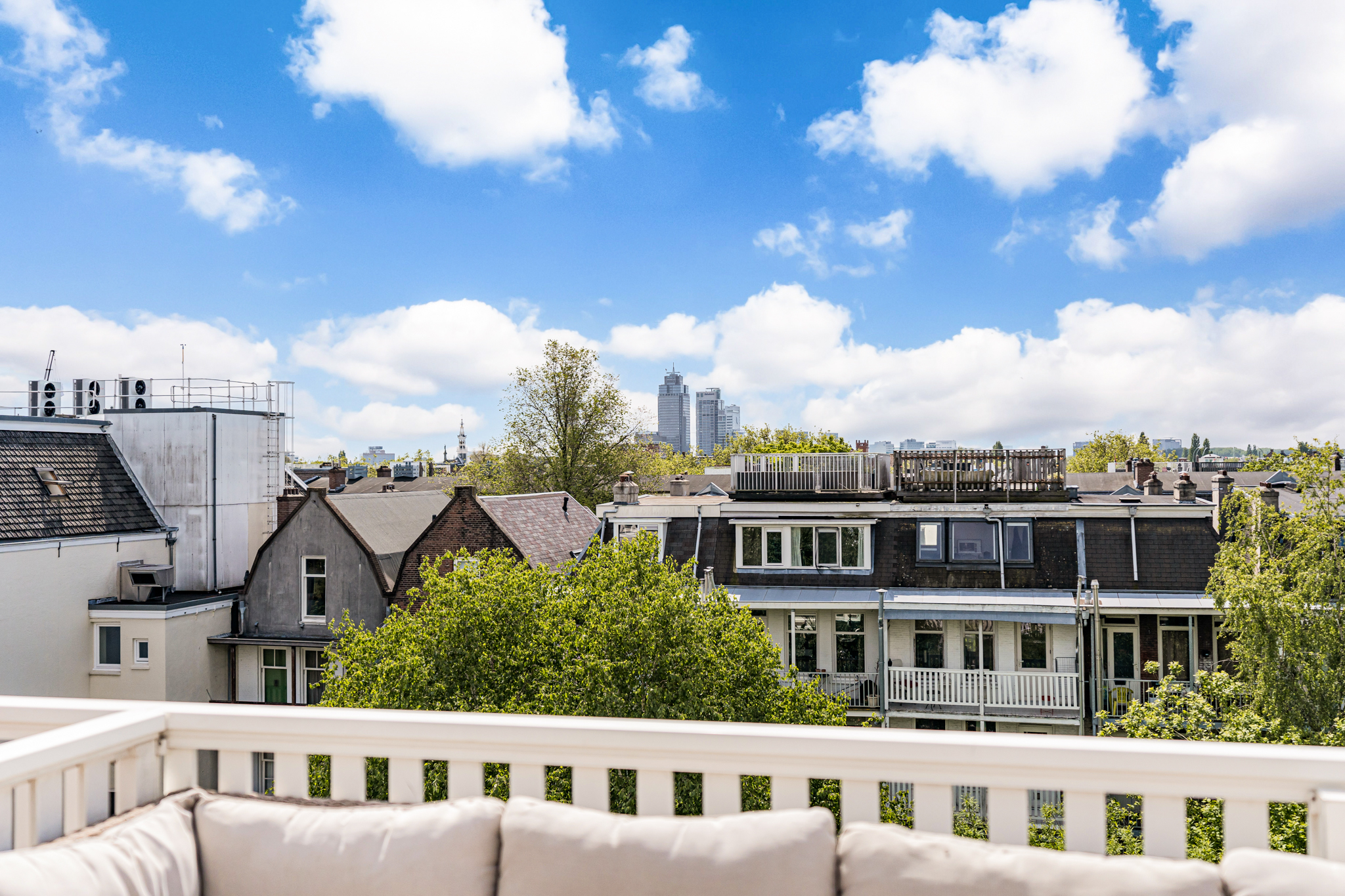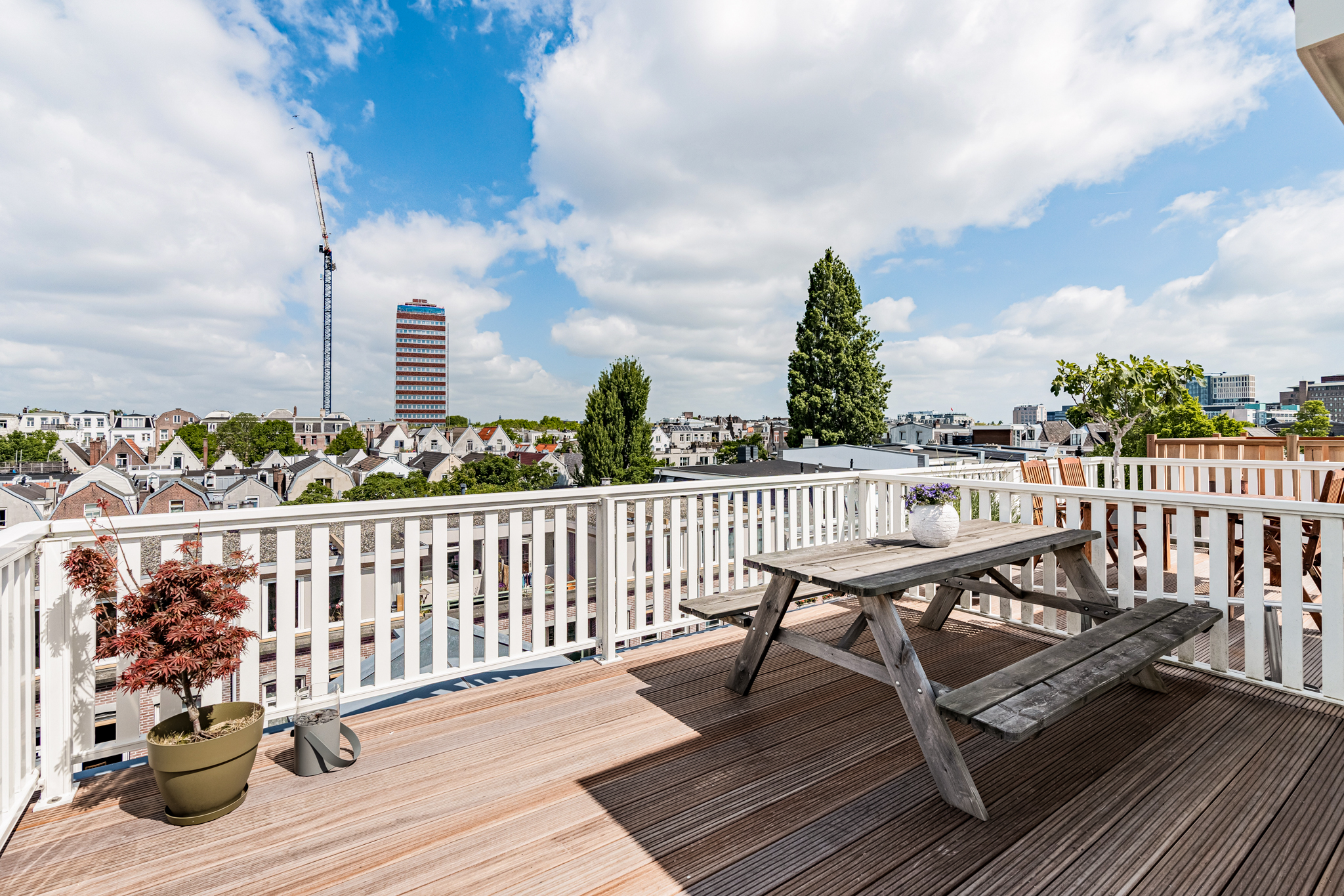 Het royale dakterras vormt de absolute blikvanger van dit appartement en biedt een panoramisch uitzicht van 360 graden over de stad met als highlights het Amstel Hotel, het Rijksmuseum en het Okura.